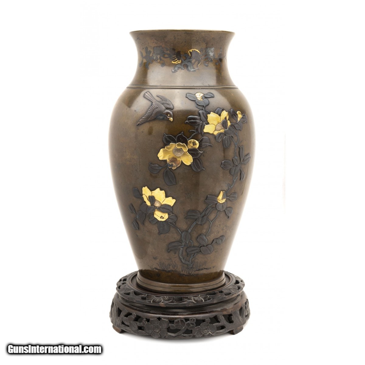 Description: "Beautiful Bronze vase depicting theme of a rooster watching over chicks amongst foliage and a bird in flight. Comes with a wonderfully carved wooden stand. 15x9x9 in with stand. SOLD |