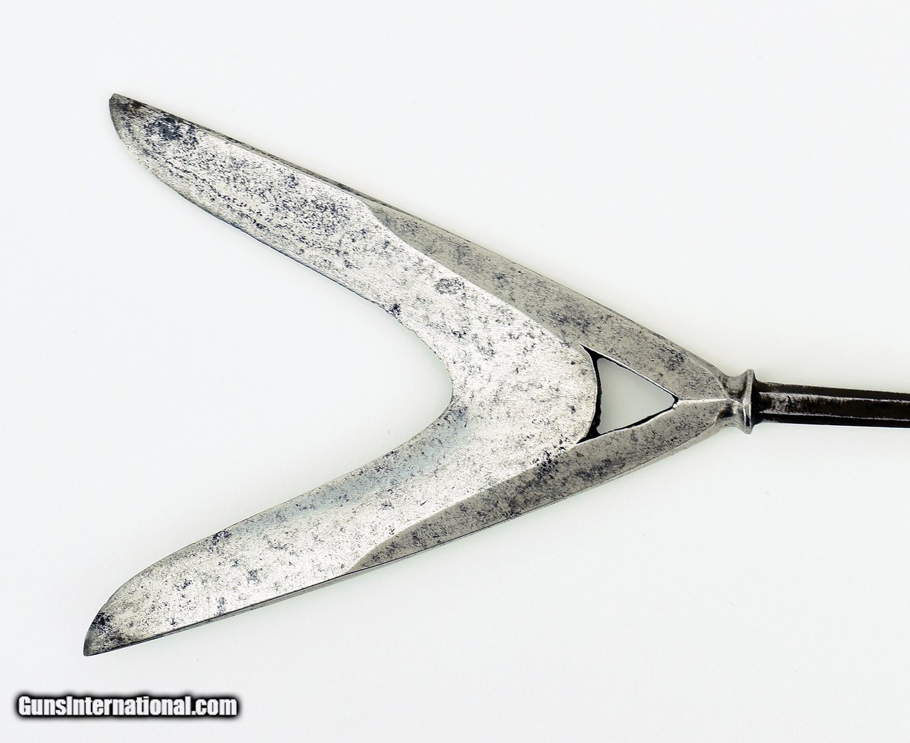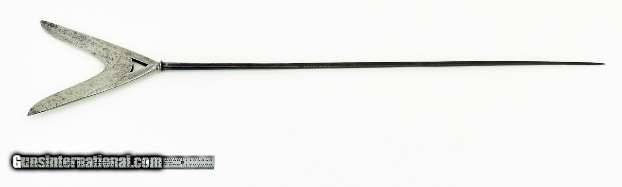 Description: "Large Karimata Arrowhead (forked flying wild goose shape). 4 1/2“ (18.8 cm) long. 18 3/8" (47cm) long overall with sukashi with triangle aperture. SOLD |