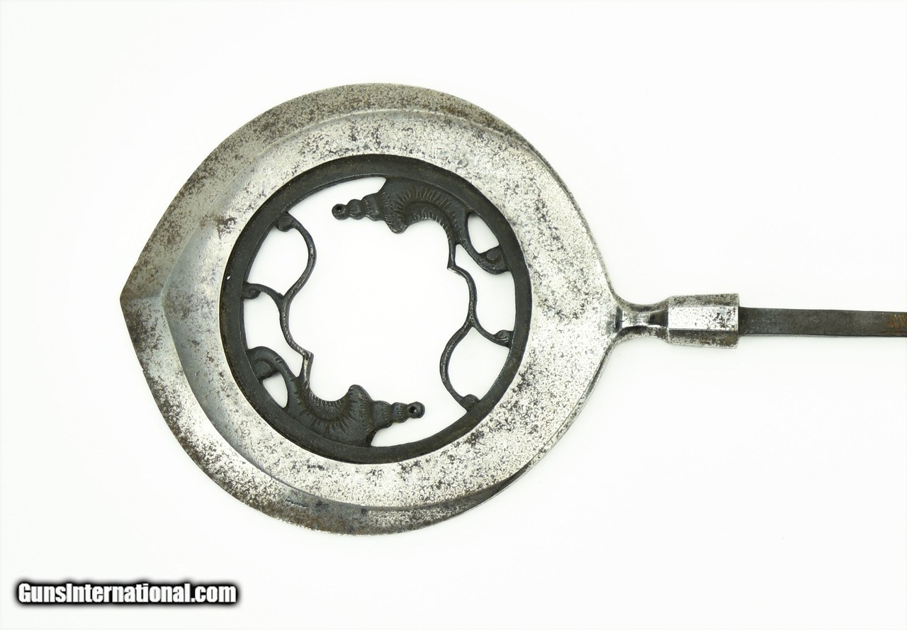 Description: "Large Presentation Arrowhead (Yanone) by Nobu Kuni Edo Period pierced with circular opening with design of conch shells and stylized waves signed: Nobu Kuni in Shirasaya 6 ½" (16.5 cm) long, 4 7/8" (12.3 cm) wide, 27 ¾" (70.5 cm) long overall. SOLD |