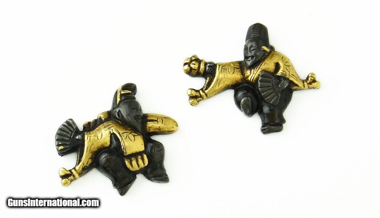 Description: "Menuki Dancing Robed Figures with Shakudo and gold highlights. Excellent condition. No signature. SOLD |