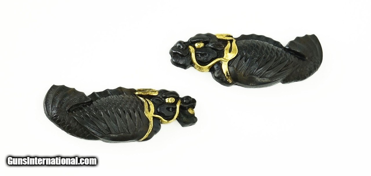 Description: "Menuki Dragons with Scales and Tail Shakudo with gold highlights unsigned. Excellent condition. SOLD |