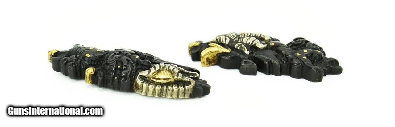 Description: "Menuki Shishi Amidst Flowers Shakudo with gold and silver highlights. Excellent condition. SOLD |