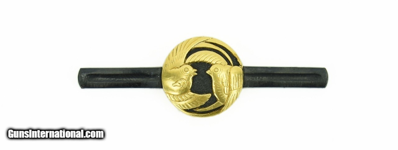 Description: "Pair of “bar" Menuki with 2 family crests of gold confronting sparrows on shakudo ground. SOLD |