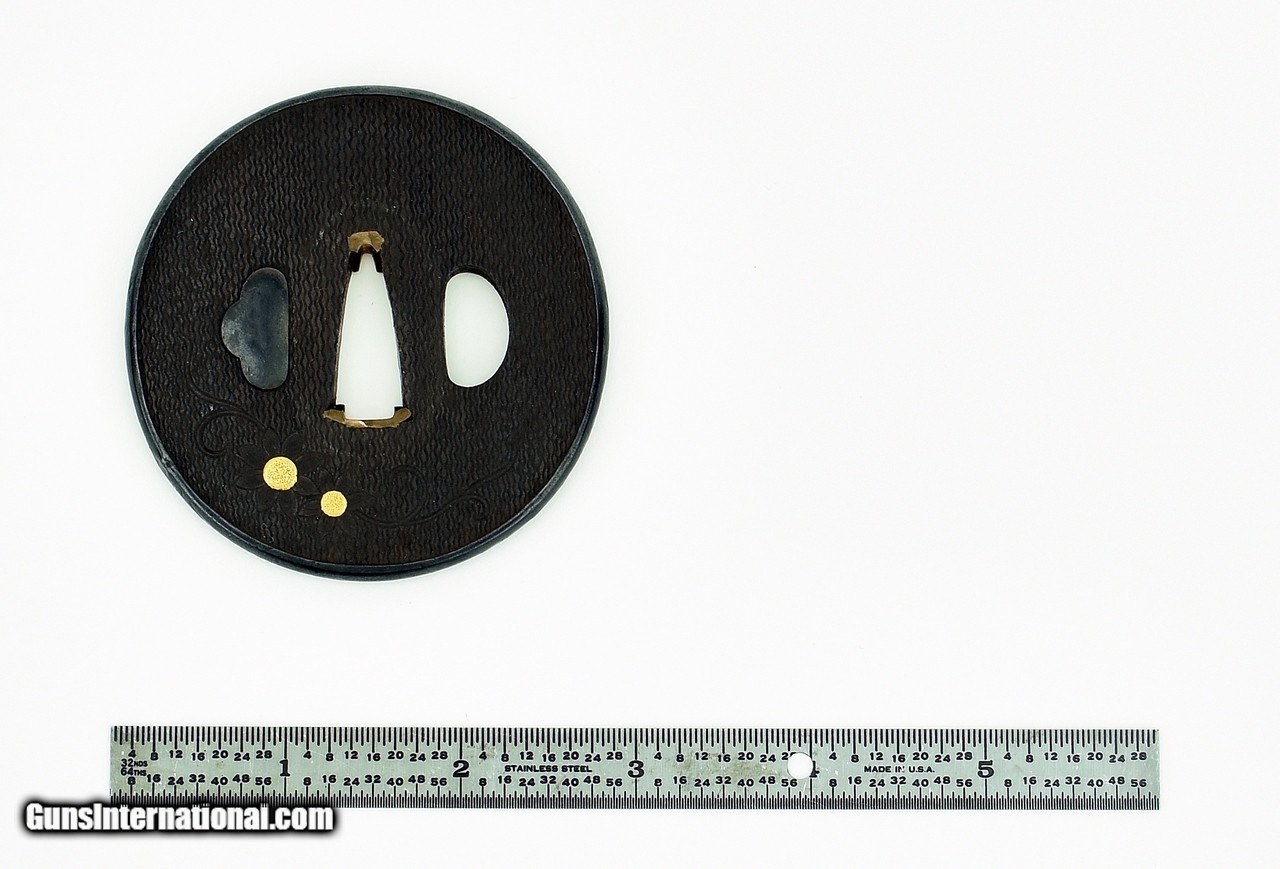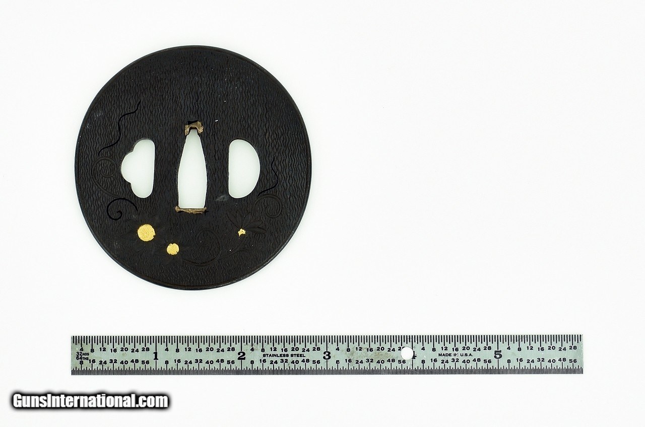 Description: "Pair of Iron Tsubas. Signed: Masa Kane? Not a true dai-sho but suitable for mounting. Unusual carving with gold highlights. One has shakudo rim. SOLD |