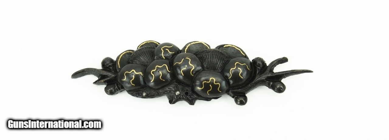 Description: "Pair of Menuki. Shakudo formed as a branch of flowering chestnut. Gold details. Unsigned. SOLD |