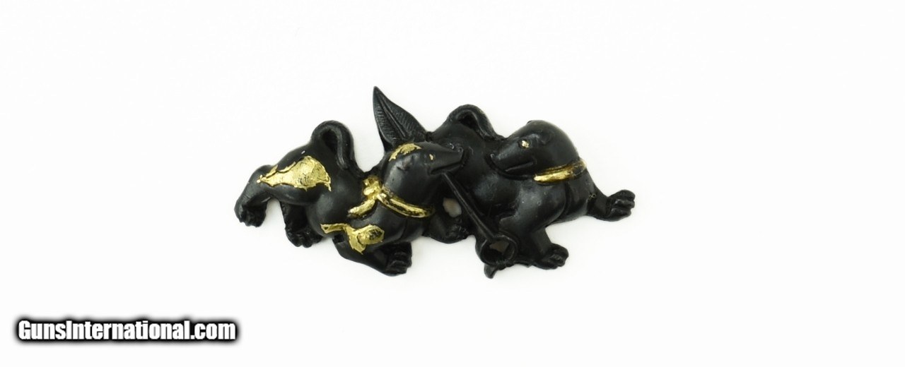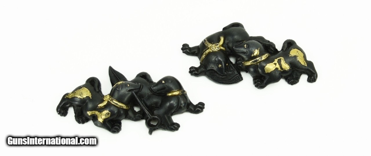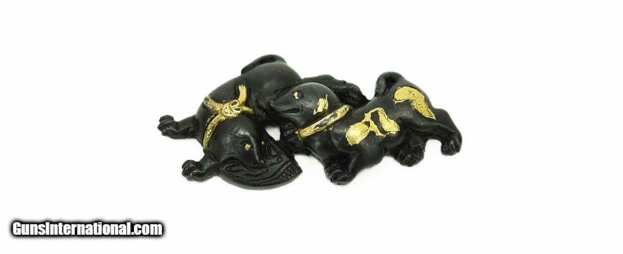 Description: "Pair of Menuki. Shakudo puppies with gold highlights. Unsigned. SOLD |