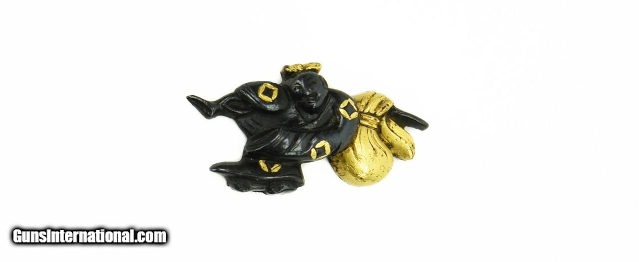 Description: "Pair of Menuki. Shakudo figures with gold treasure sacks. Unsigned. Tanto size. SOLD |