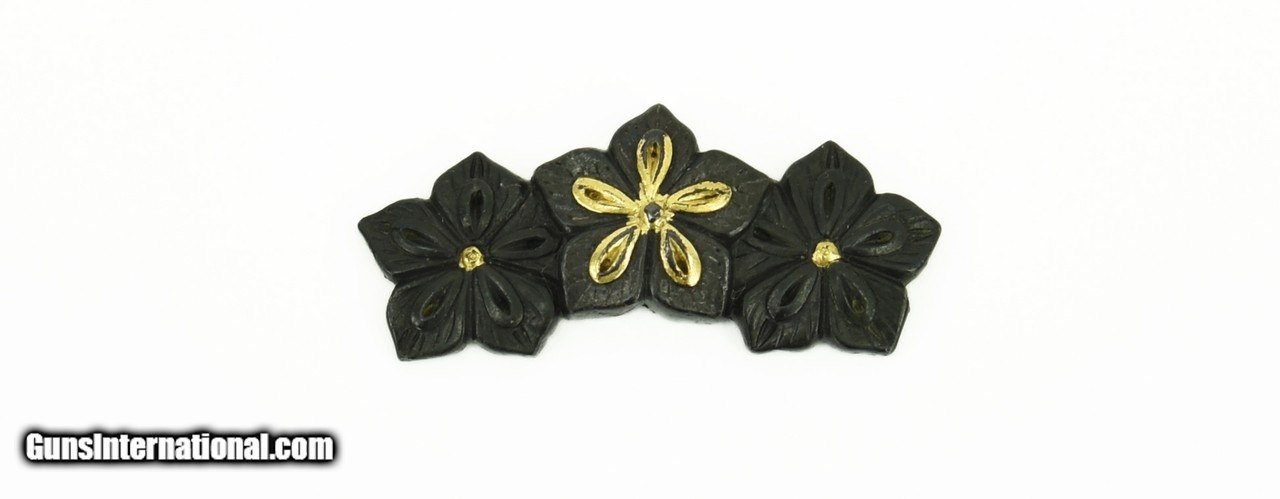 Description: "Pair of Menuki. Shakudo with gold highlights. Arrangement of 3 bellflowers. SOLD |