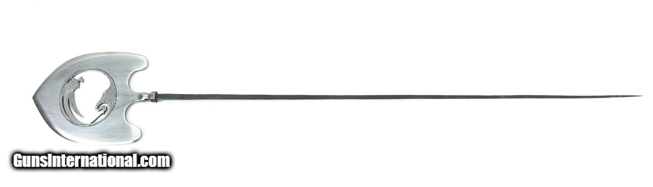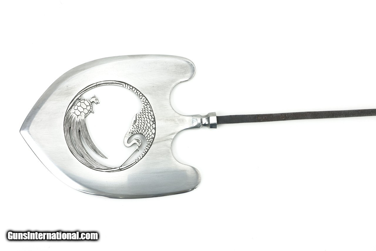 Description: "Yari signed Mori Sada? This is a long thick Yari. Blade length 17½" and overall length 26½". Good polish with undulating Suguha Hamon. Reverse is carved irregular Bo-Hi red laquer. SOLD |