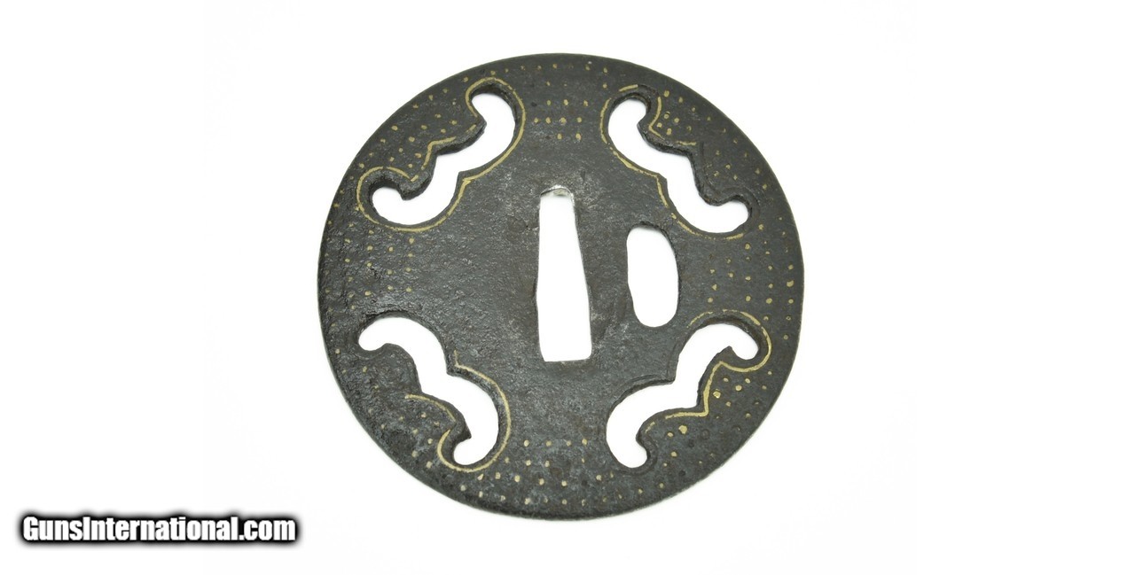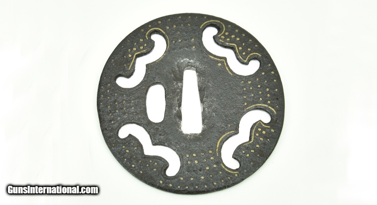 Description: "Tsuba. Round iron sukashi. Onin School. Brass inlay. Unsigned. Muromachi period. 1392-1572. Thin tsuba (early). Good condition. 7.9cm 3" SOLD |