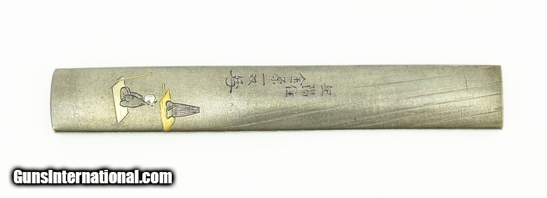Description: "Silver Kodzuka with fence post and village in background. Gold highlights. Reverse has kneeling figures with signature and kao. SOLD |