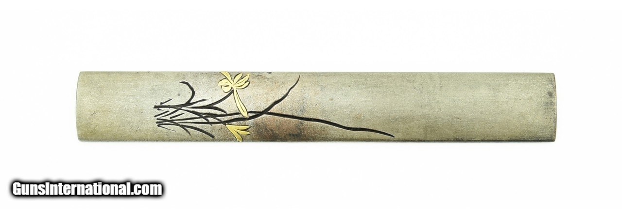 Description: "Silver Kodzuka carved with irises in katakiribori and gold inlay. Signed: Goto Mitsu Toshi with kao. SOLD |