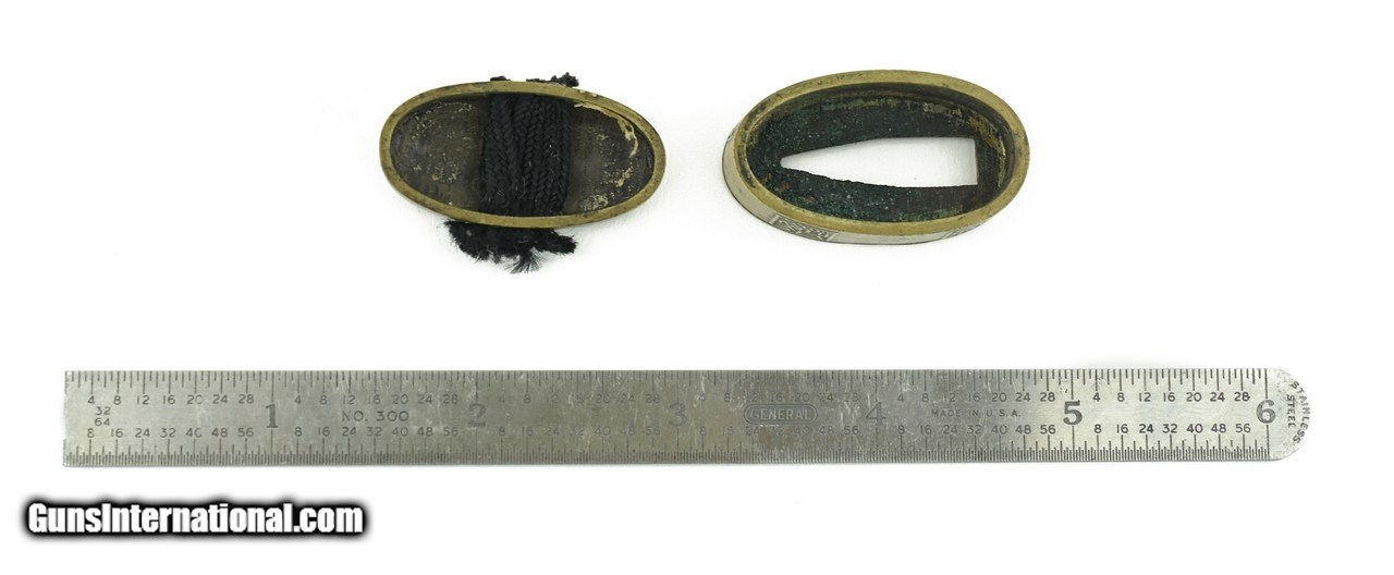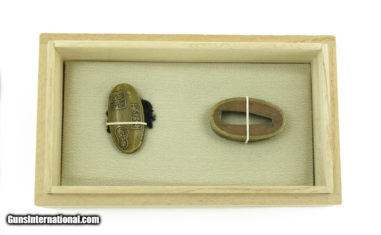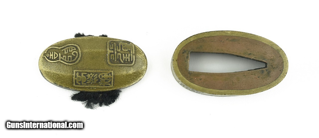 Description: "Unusual Kinko Fuchi Kashira. Santoku Ishime ground. Subject is various box shape figures and a gourd and a tea pot all featuring Chinese writing. SOLD |