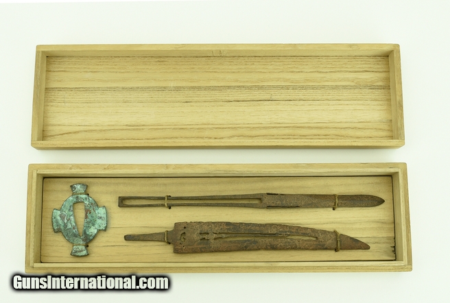 Description: "Very old set consisting of Tsuba, Tanto, and Yari in custom box. Possibly pre-Kamakura. SOLD |