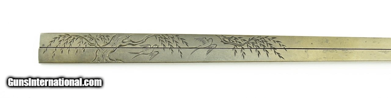 Description: "Wari-Kogai. Ferns with tree and birds. Appears to be Shibuichi in custom box. Excellent condition. Rare and elegant Wari-Kogai. SOLD |