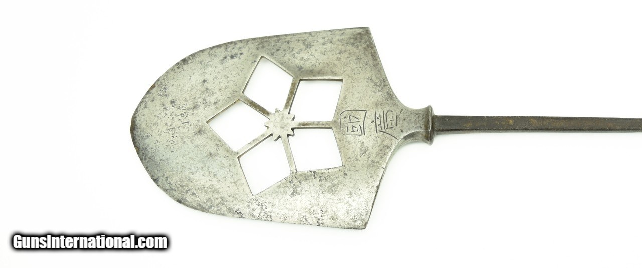 Description: "Yanone (Arrowhead). Sukashi presentation. Fine pierced design of cherry blossom. Signed on shoulder Horikawa Kuni Hiro. (17th Century). 4 ¼" (10.7cm) long overall. SOLD |