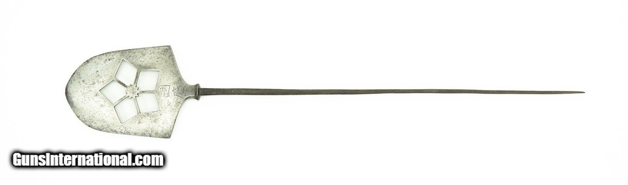 Description: "Yanone (Arrowhead). Sukashi presentation. Fine pierced design of cherry blossom. Signed on shoulder Horikawa Kuni Hiro. (17th Century). 4 ¼" (10.7cm) long overall. SOLD |