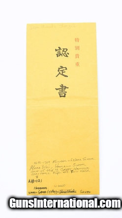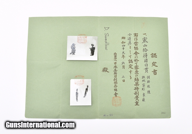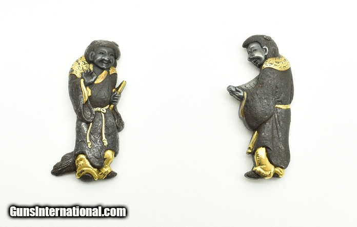 Description: Iron Menuki. Robed scholars with gold and shakudo highlights. Signed: Shozui or alternate art name Masa Yuki, founder of Hamano School and pupil of Toshi Naga. 1696-1769. Ref. Baur page 385. N.B.T.H.K. certificate. Considered to be one of the 4 Great Nara Masters. SOLD |