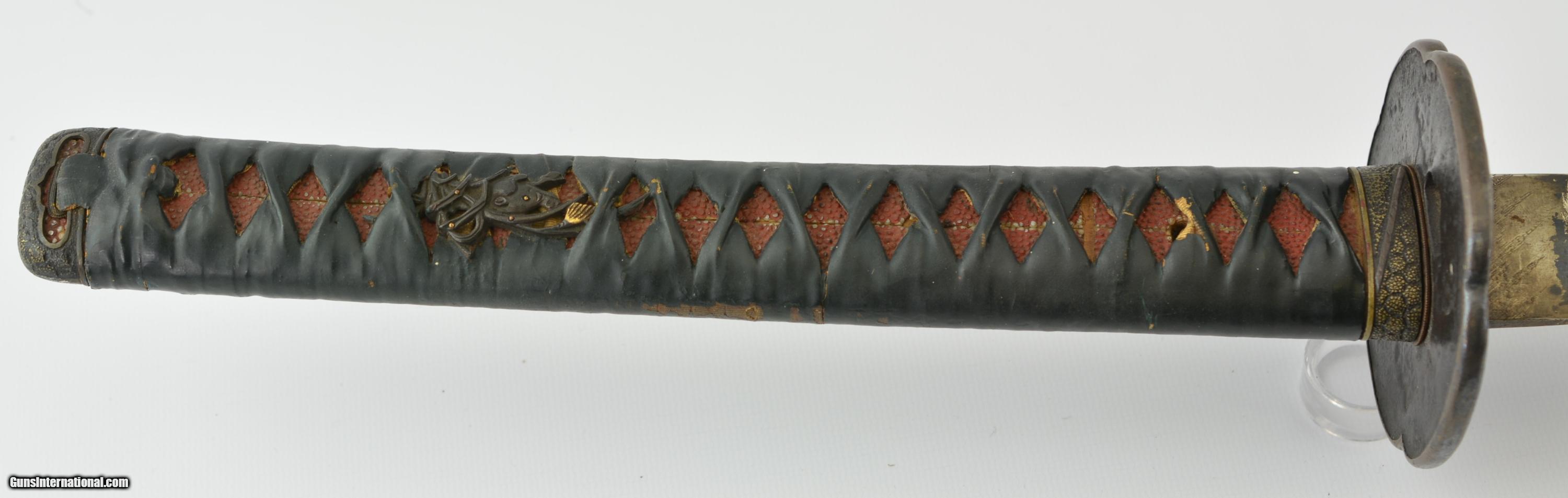 Description: This is a slightly longer than usual sword that measures 42 3/4" overall with a 31" blade measured to the tarnished white metal habaki. The blade has an overall mottled gray patina with simple, straight temper line and long, o-kissaki tip. The steel has noticeable machine polishing marks along its length on both sides of the blade. The darkly patinated iron tsuba has faint, die-struck embellishments with serrated copper seppa that have minor tarnish. The tsuka has an original rayskin wrap that has cracked in a few places over time and an intact cloth tape wrap that had a protective rubber coating applied. The coating has flaked along the edges but is still mostly intact. The fuchi and kashira have likewise tarnished, and match the condition of the tsuba closely. The saya has a flaked reddish-maroon lacquered finish that has a some minor cracks along the edges. This is a very nice late-war Japanese sword, evidently a World War II war trophy, and is in about good-very good overall condition. SOLD Manufacturer: Japanese Model: Katana |