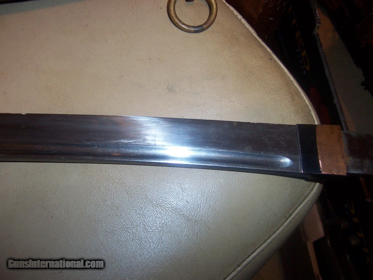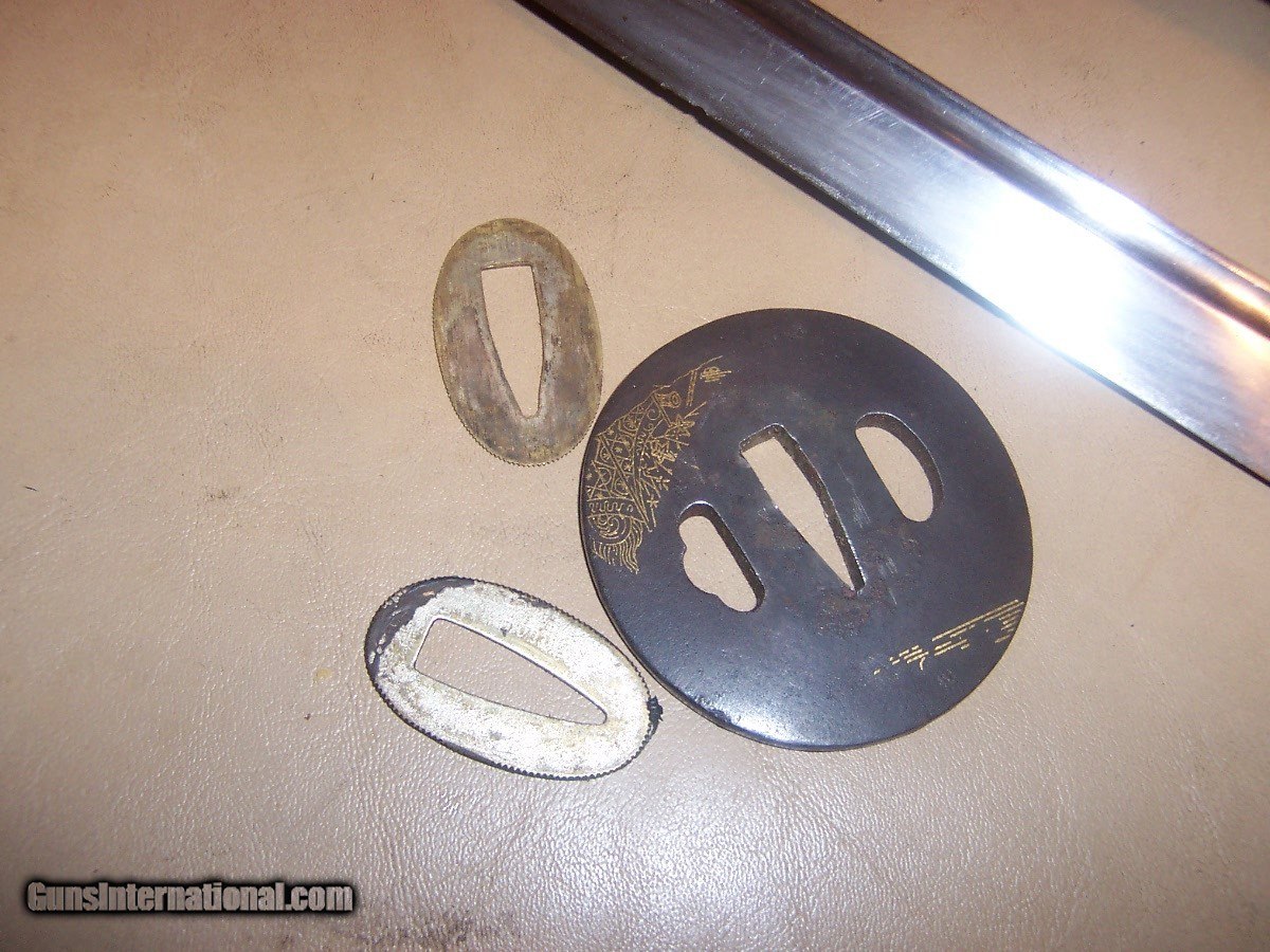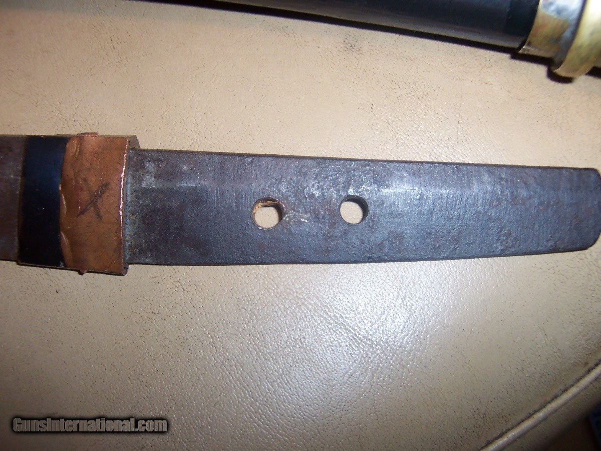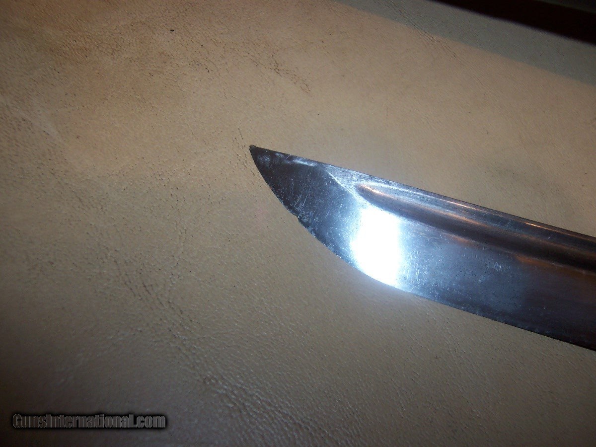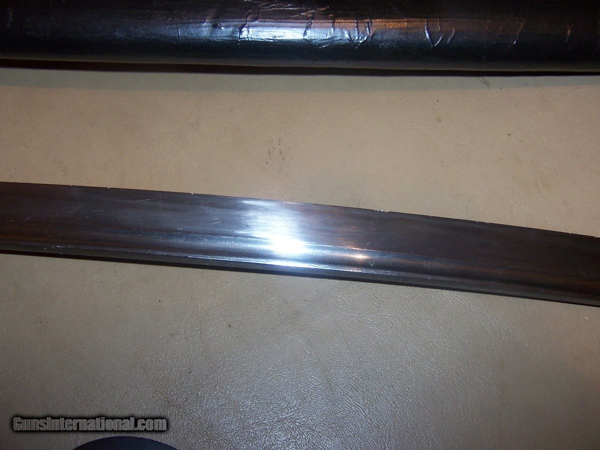 Description: blade 20 inches from point to guard 29 inches oa blade has 3 0r 4 very small nicks in edge// hard to photgraph /// out of polish // has blood groove in blade looks like a koto blade// solid scabbard has newer black paint///// handle has a little wobble $35 sh.. handle wrap has no damage or cuts//////// no flaws in blade SOLD |