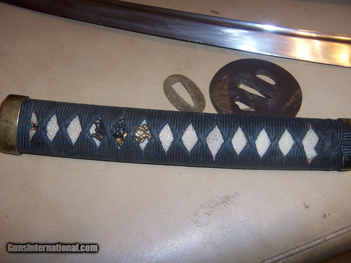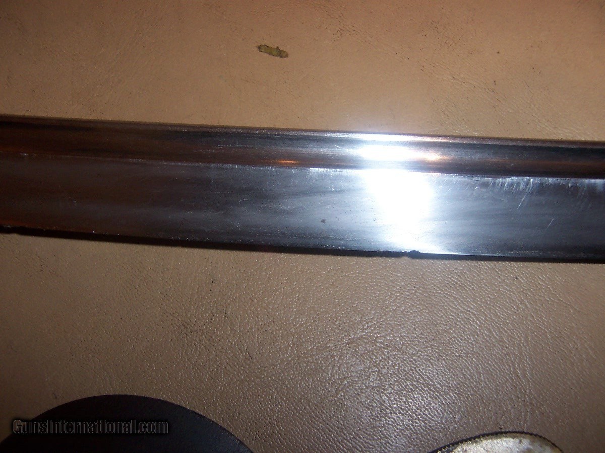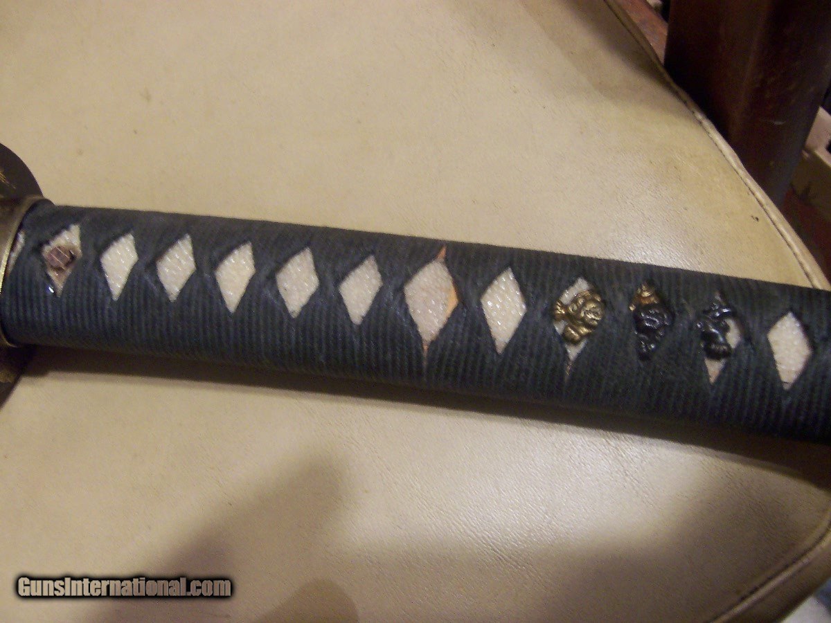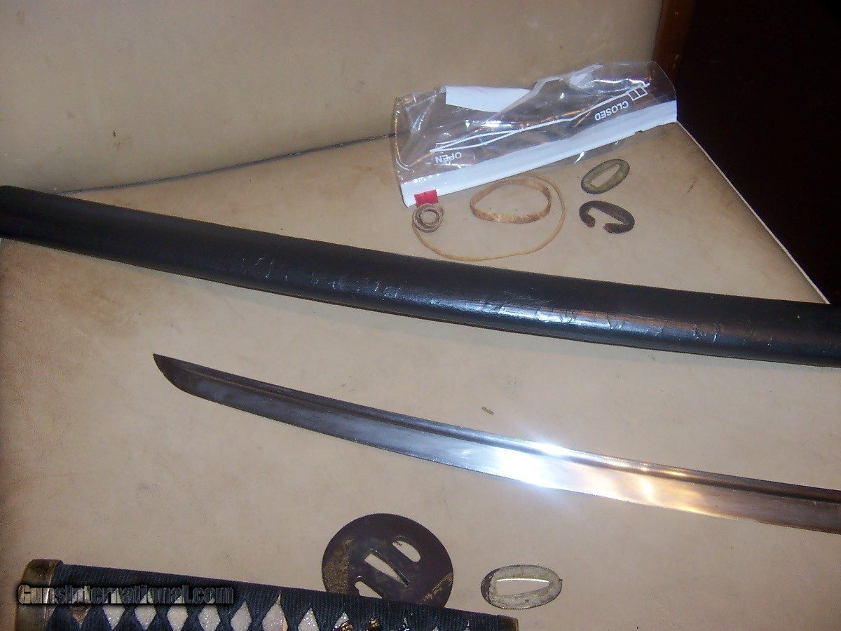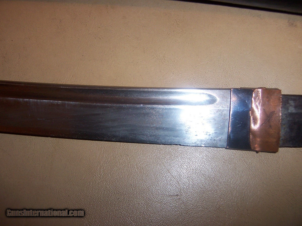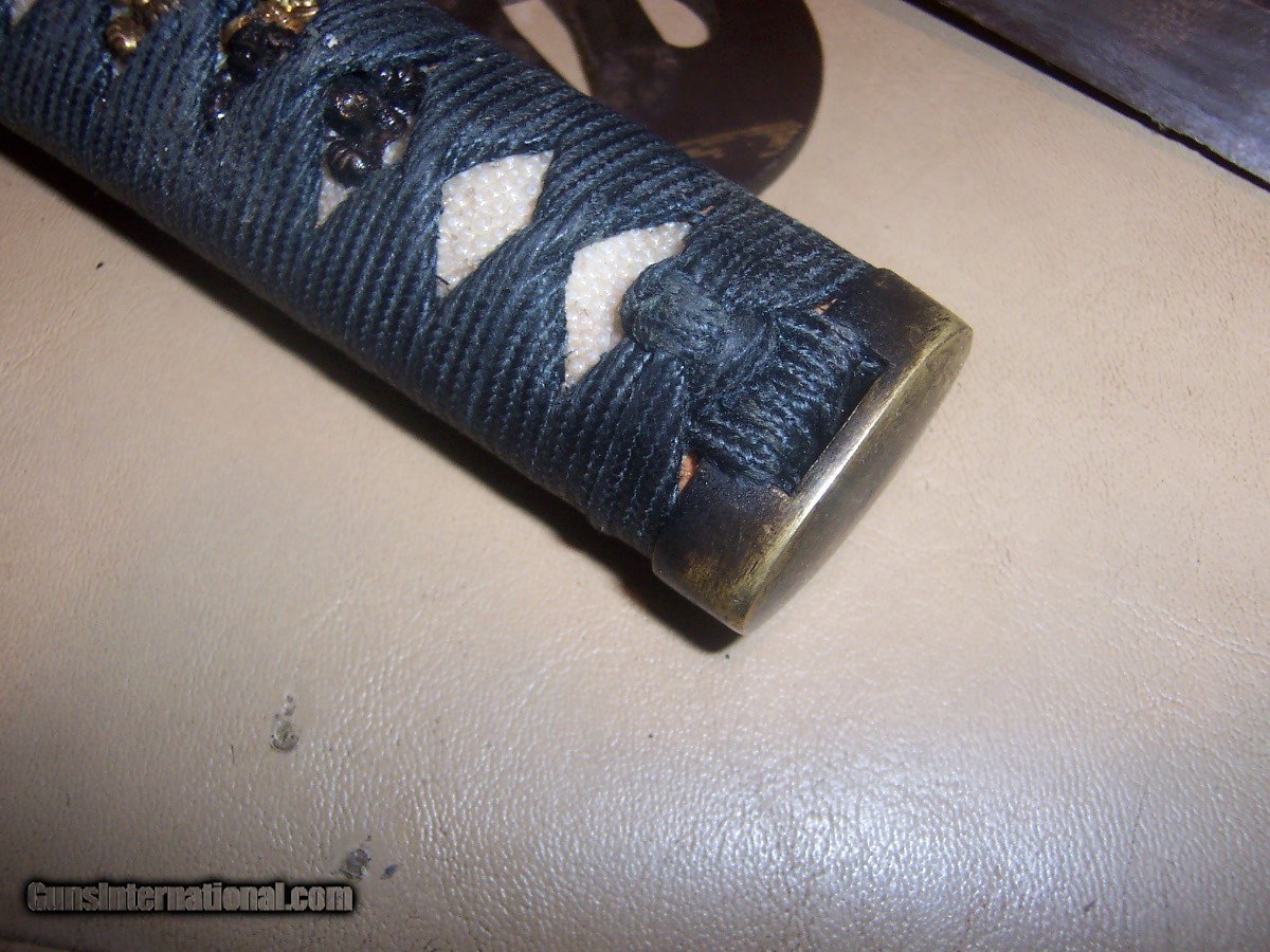Description: blade 20 inches from point to guard 29 inches oa blade has 3 0r 4 very small nicks in edge// hard to photgraph /// out of polish // has blood groove in blade looks like a koto blade// solid scabbard has newer black paint///// handle has a little wobble $35 sh.. handle wrap has no damage or cuts//////// no flaws in blade SOLD |