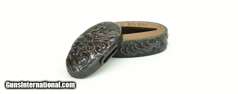 Kinko Fuchi Kashira. Dragon in turbulent waves. Gold highlights. Signed: Goto. Very good condition.