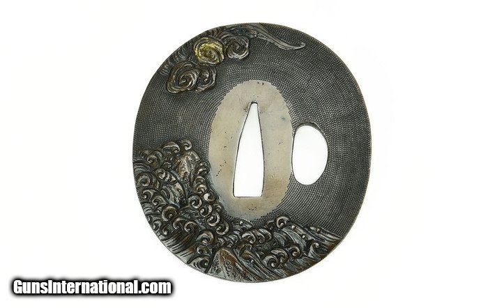 Kinko Tsuba Warrior by River with Oni. Diametre: 3.7 cm, 2 ¾”.