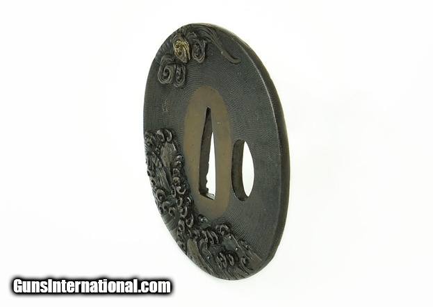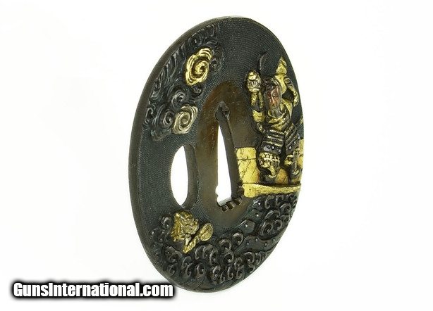 Description: Kinko Tsuba Warrior by River with Oni. Diametre: 3.7 cm, 2 ¾”. SOLD |