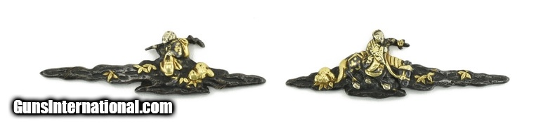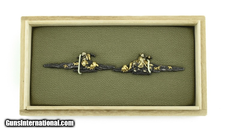 Description: Large Kinko Menuki. One Menuki is traveler on horse with gold, silver and shakudo. The other is figure on foot carrying bags with gold, silver and shakudo. Unsigned. Boxed. SOLD |