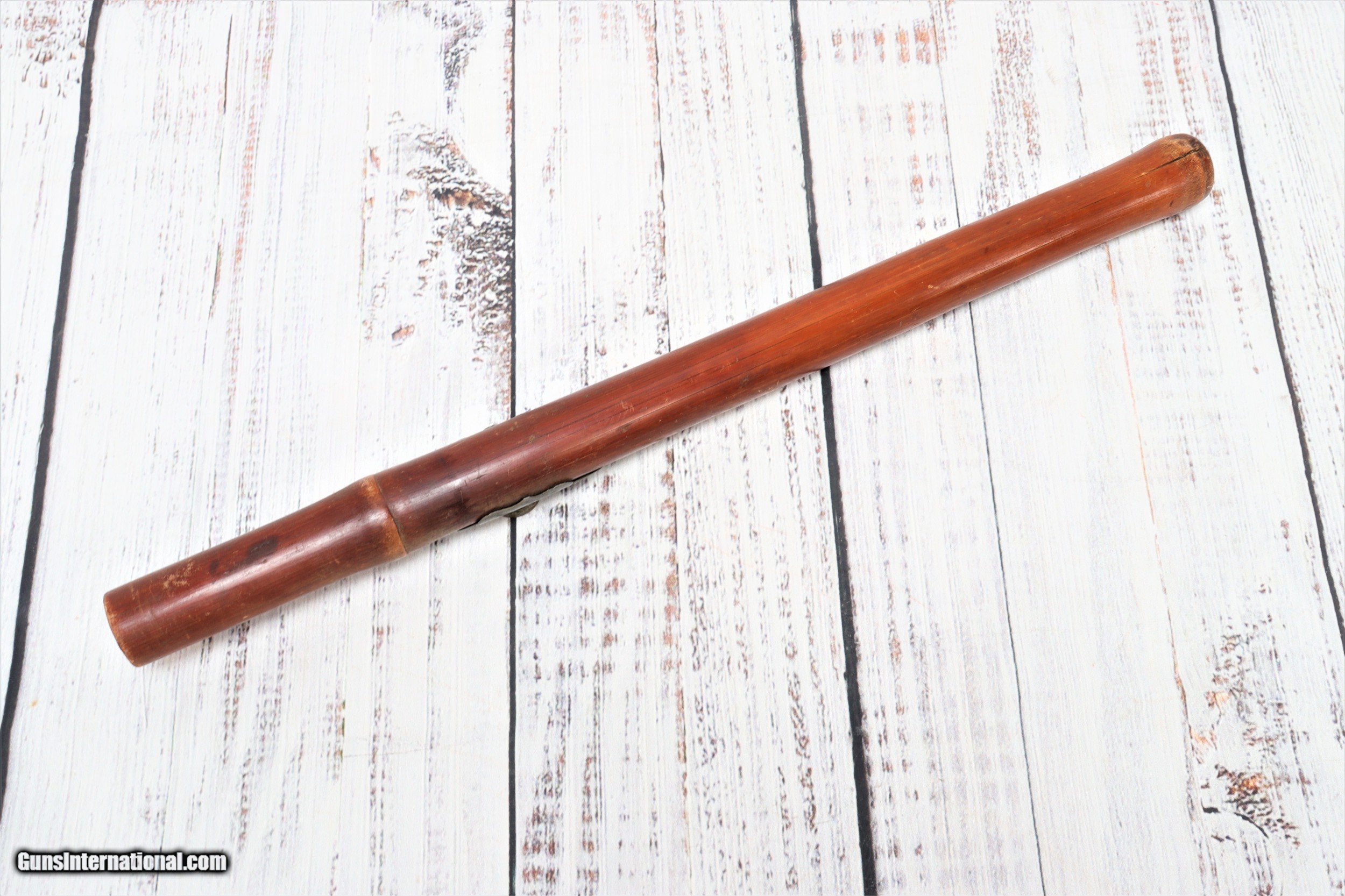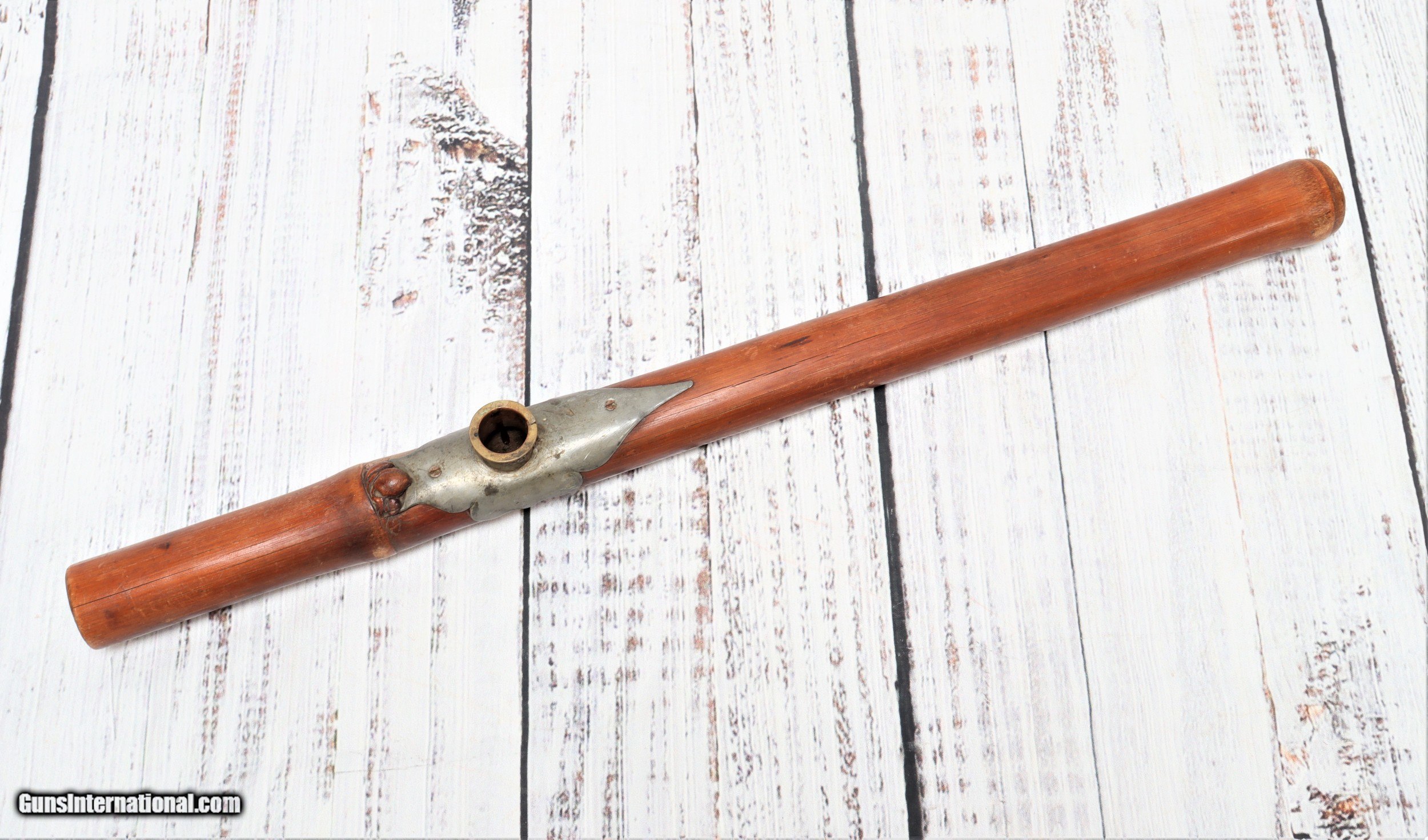 Description: Oriental pipe made of large bamboo piece. Origin unknown, but likely from China. Looks to be missing mouth pieces and has some cracks and fractures to piece. Has age and patina. Great for display in a tobacciana or Oriental or Asian collection. Would also display nicely as decor in a variety of different home styles, from modern to vintage eclectic. Size: 24 1/2"L, 4 1/2"C Family Owned & Operated Cisco’s Gallery deals in the rare, exceptional, and one-of-a-kind pieces that define the history of America and the Old West. Our pieces range from American Indian to Cowboy Western and include original items of everyday life, commerce, art, and warfare that tamed America’s frontier. Our 14,000 square foot gallery opened in 1996 in beautiful Coeur d’Alene, Idaho. Personal Service Cisco’s operates on old fashioned values – honesty and integrity, and all of our items are backed by our money back guarantee. We appreciate the opportunity to earn your business. Whether you desire assistance with a jewelry purchase, choosing a gift, identification, or even selling – we hope to be your trusted source. SOLD |