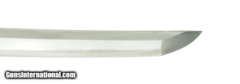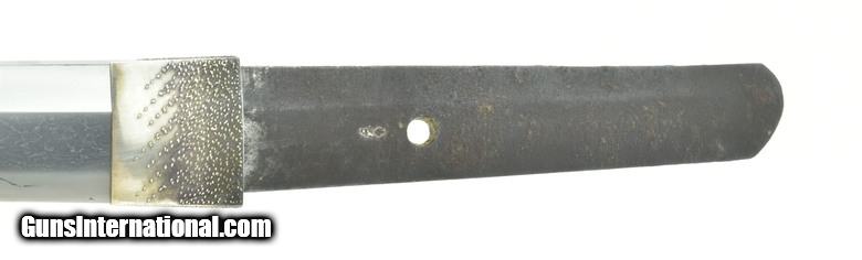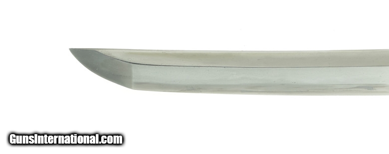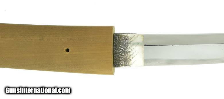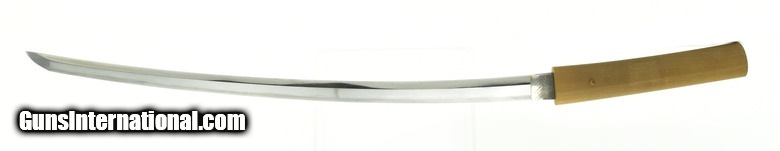 Description: Ubu Mumei Koto Bizen Katana. This is a ubu (unshortened) mumei (unsigned) Koto Bizen Katana in full polish. The nagasa (cutting edge) is 23â…ž” (60.5cm). It is in old shirasaya with a silver foil habacki. SOLD |