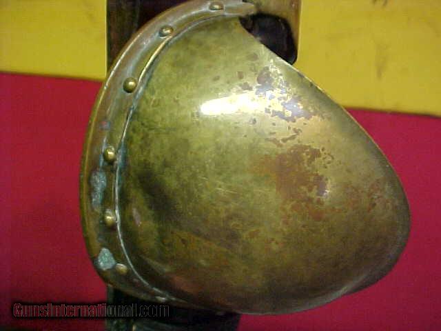 Description: #0844 Ames Model 1860 Naval Cutlass with sheath and frog, dated 1862. Fine blade with strong markings and only minor staining and spottiness, no pitting, no sharpening, and no little kids having played “Pirates and Buccaneers” over its 150+ year life. The brass cup guard has minor denting and patina, also has unit markings and rack numbers. The scabbard is in near excellent condition, as is the belt frog. Overall, a fine blade and one that is now getting hard to find. $1075 SOLD |