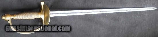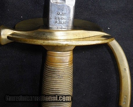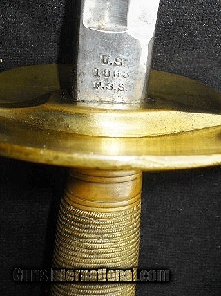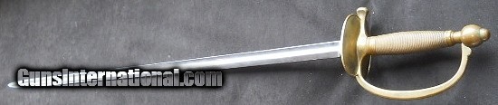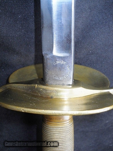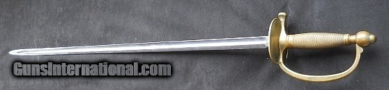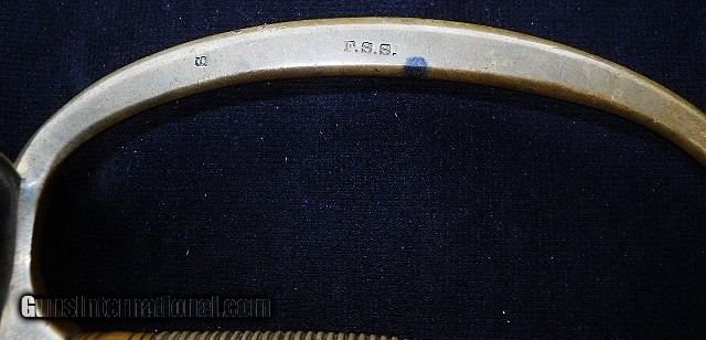 Description: 1863 DATED CIVIL WAR NCO SWORD BY "C. ROBY" WEST CHELMSFORD, MA. WITH "F.S.S." FREDERICK S. STRONG" INSPECTORS MARK ON BLADE & GUARD. ORIGINAL UNCLEANED BRASS THAT HAS TAKEN ON A NICE PATINA. BLADE IS MIRROR BRIGHT WITH RIGHT SIDE SHOWING SOME OXIDATION STAINS & LIGHT PINPRICK PEPPERING. 38 1/2" OVERALL WITH 32" BLADE. VERY GOOD PLUS EXAMPLE OVERALL, AS PICTURED. NO SCABBARD. $30.00 S&H DIRECT TO BUYER EAST OF THE BIG RIVER $35.00 BEYOND. SEE ALL "ESTATE ANTIQUES" LISTINGS FOR MORE INTERESTING ITEMS A SENSIBLE PRICES FROM OLD TIME COLLECTIONS. SOLD |