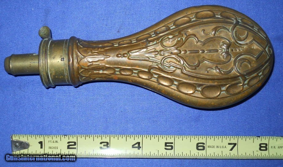 Description: ANTIQUE CIVIL WAR ERA COPPER & BRASS POWDER FLASK MARKED G. & J.W. HAWKSLEY, SHEFFIELD. UNCLEANED SURFACES, TIGHT SEAMS, WORKING ORDER, IMPRESSION IN DESIGN ON ONE SIDE, ONE NOTEABLE EDGE DENT, AS PICTURED. $10.00 S&H SEE OTHERS COMBINE SHIPPING. SEE ALL "ESTATE ANTIQUES" LISTINGS FOR MORE GOODIES FROM OLD TIME COLLECTIONS & ESTATES. INVENTORY # 346 SOLD |