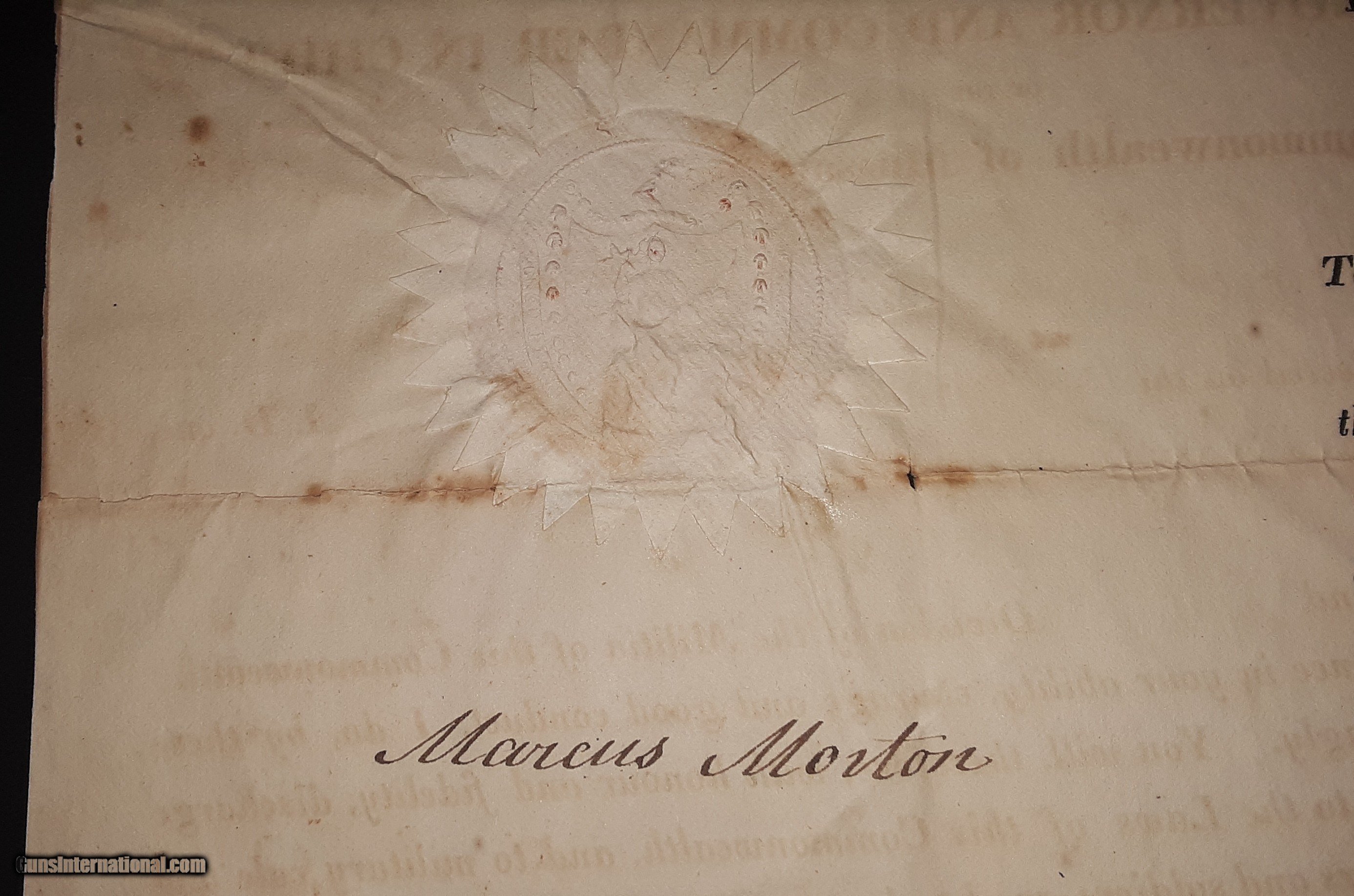 Description: 1825 Massachusetts Militia Officer’s Commission for Brigadier General Ephraim Ward, signed by Acting Governor Marcus Morton. The commission measures about 16 inches by 10 inches, and despite having some light stains and fold separations that have been repaired with archival document tape, it displays very well for being almost 200 years old and is suitable for framing. Marcus Morton (1784-1864) was an American lawyer, jurist, and politician from Taunton, Massachusetts. Morton was a schoolmate and friend of John C. Calhoun. Morton served as a Massachusetts member of the U.S. Congress from 1816 to 1820, where he supported Andrew Jackson. In 1824, Morton was elected Lieutenant Governor, serving under Governor William Eustis. When Eustis died in office in February 1825, Morton served as acting governor until the election a few months later. This officer’s commission was signed during that period of time. Morton refused to run for governor in 1825, but again ran for and won lieutenant governor. Unhappy with what he termed Whig elitism, he resigned, and became an associate justice of the Massachusetts Supreme Judicial Court, serving until 1840. In the meantime, Morton was a perennial gubernatorial candidate, running and losing each year from 1828 to 1838. In the early years he was supported by his friend John Calhoun, who had served as vice president under Adams and Jackson. Morton himself did no overt campaigning, sensitive to maintaining the appearance of neutrality as a judge. An opponent of the extension of slavery, he split with his longtime friend John Calhoun over that issue. Finally in 1839, Morton won the governor’s office by one vote. He lost in 1840 and 1841, but regained the office for one year in 1842, only to lose it again in 1843. In 1844 he decided to stop running for governor, though he continued in public service for many years. Morton died at his home in Taunton in 1864 and is buried in its Mount Pleasant Cemetery. Please take a look at all the photos as they provide the best description of condition. Shipping to the lower 48 contiguous states. Shipping charge $10 towards cost of Priority Mail with full insurance. I am listing other early Massachusetts Militia documents, if you buy additional items, I will combine into one package to save you on shipping charges. Three day return privilege, buyer pays return shipping. SOLD |