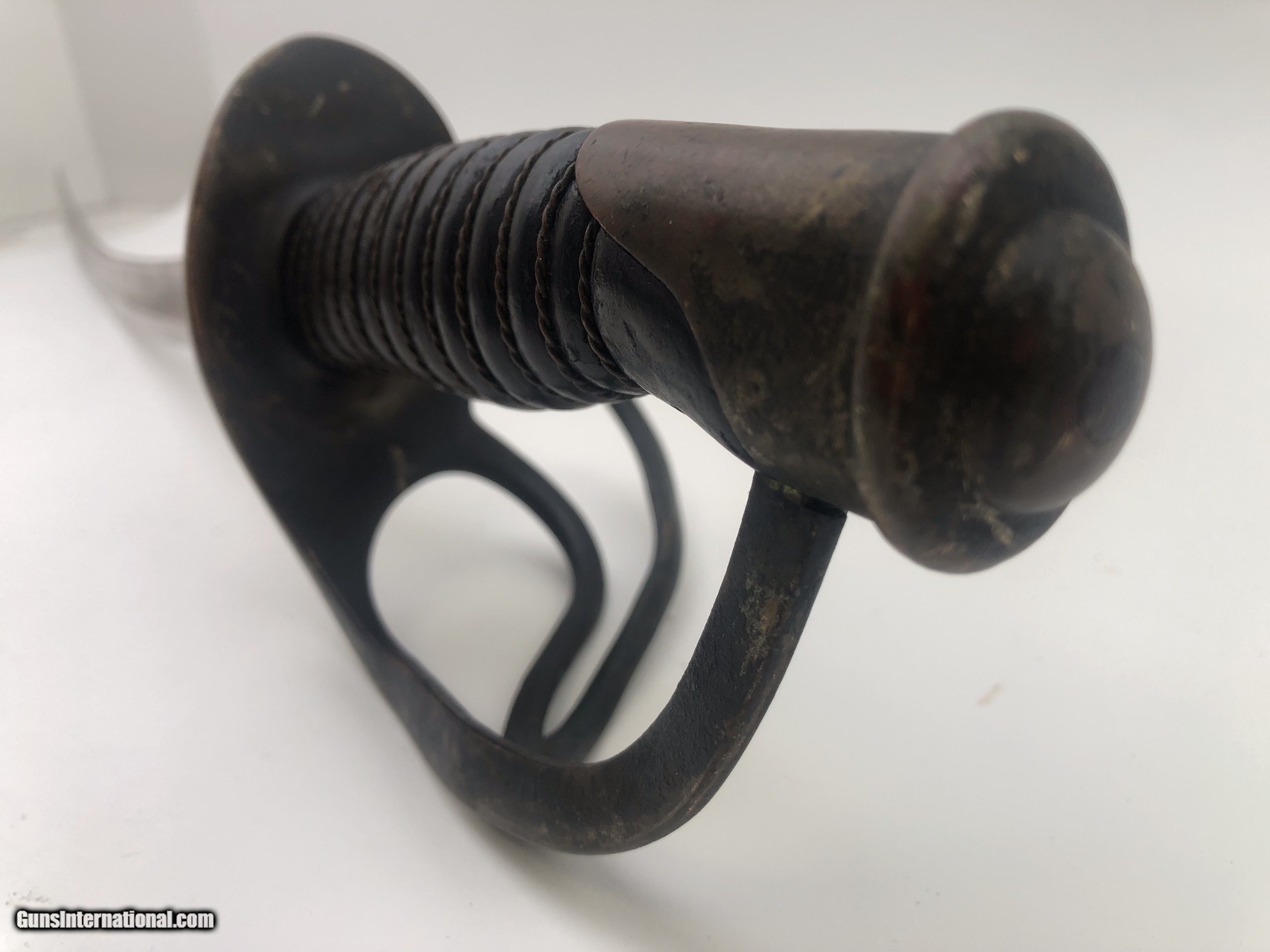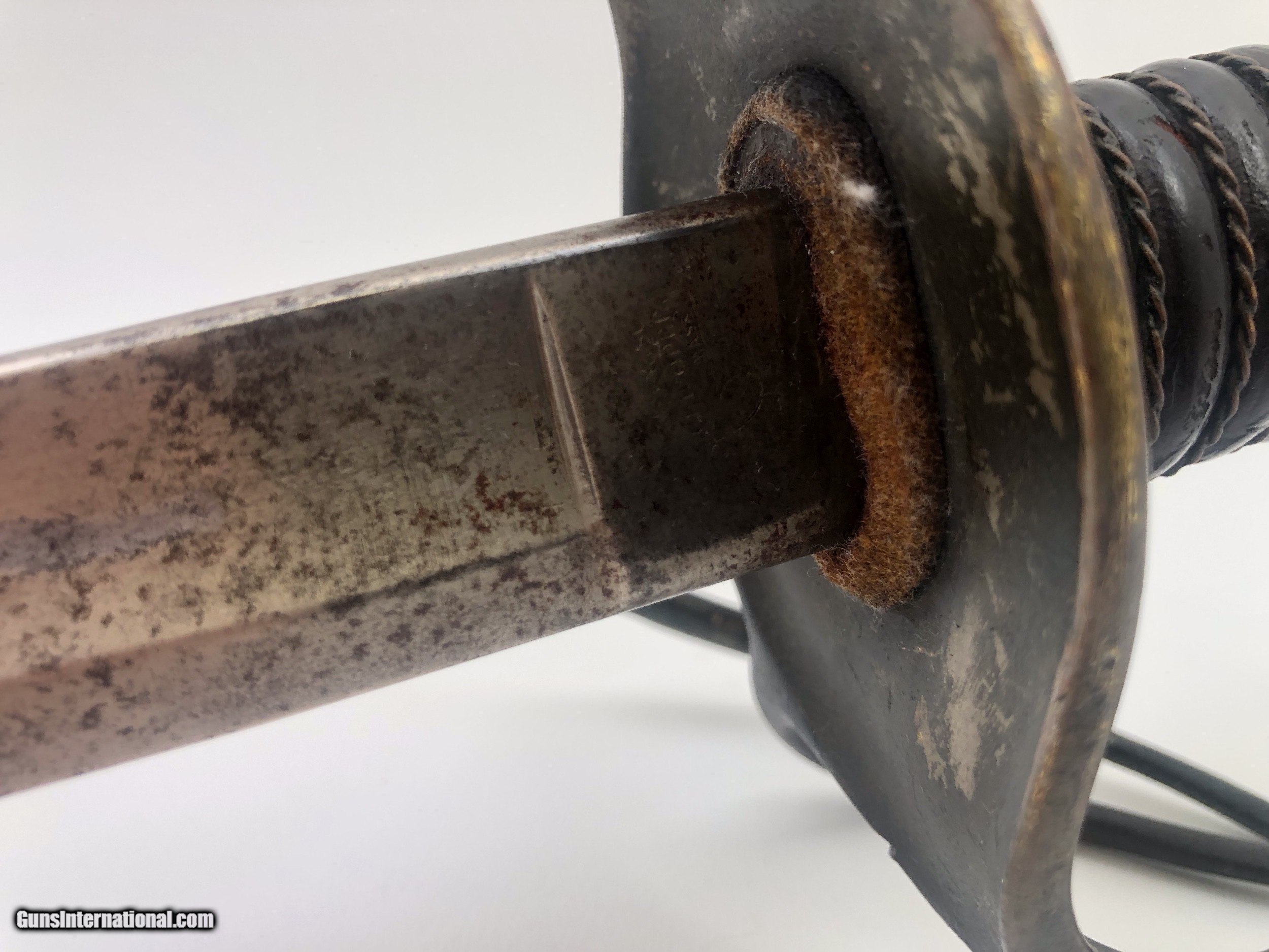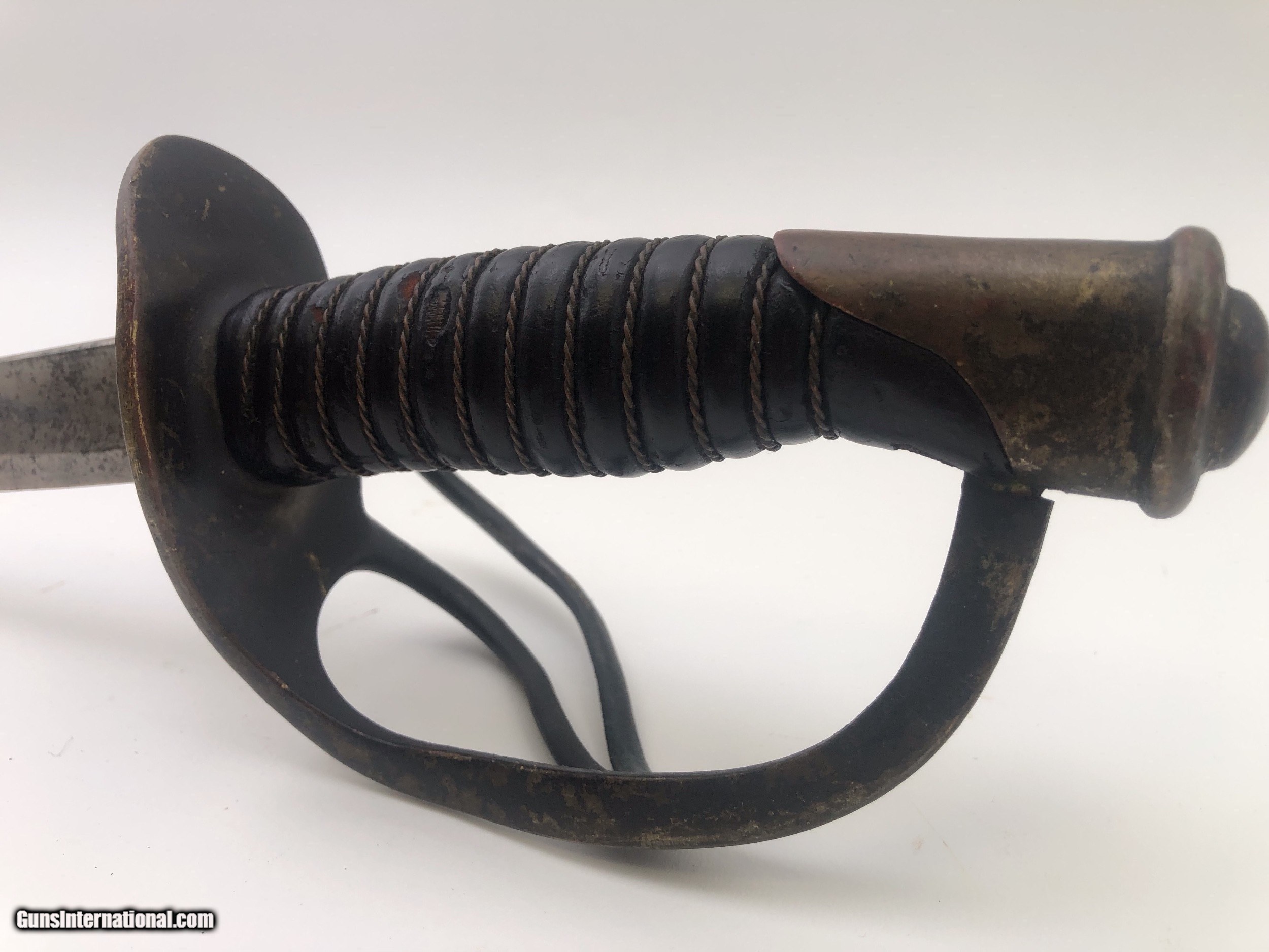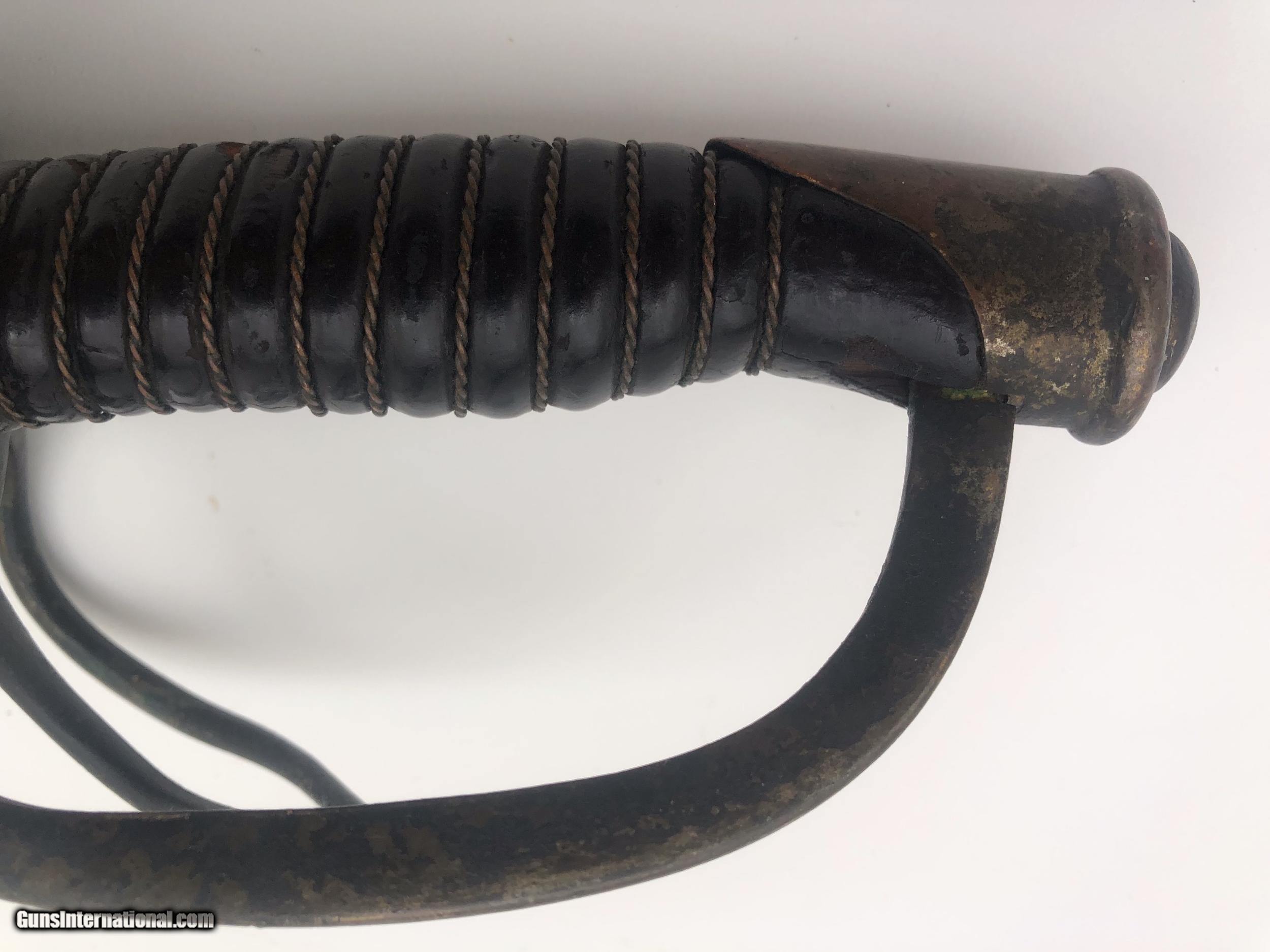 Description: This Ames 1860 model is dated 1865 and was govt. inspected by "GWC". Condition The leather grip wrap and wire are very good and all original. The brass hilt shows a dark untouched patina with some crusted areas. The blade retains its original leather washer and has some areas of rust spotting. The scabbard is a very dark uncleaned age patina with just a couple of very minor dents. This is a good honest untouched as found Civil War sword. Condition Overall in scabbard 42.80" Sword 40.80" Blade length 34.75" Blade width 1.07" SOLD |