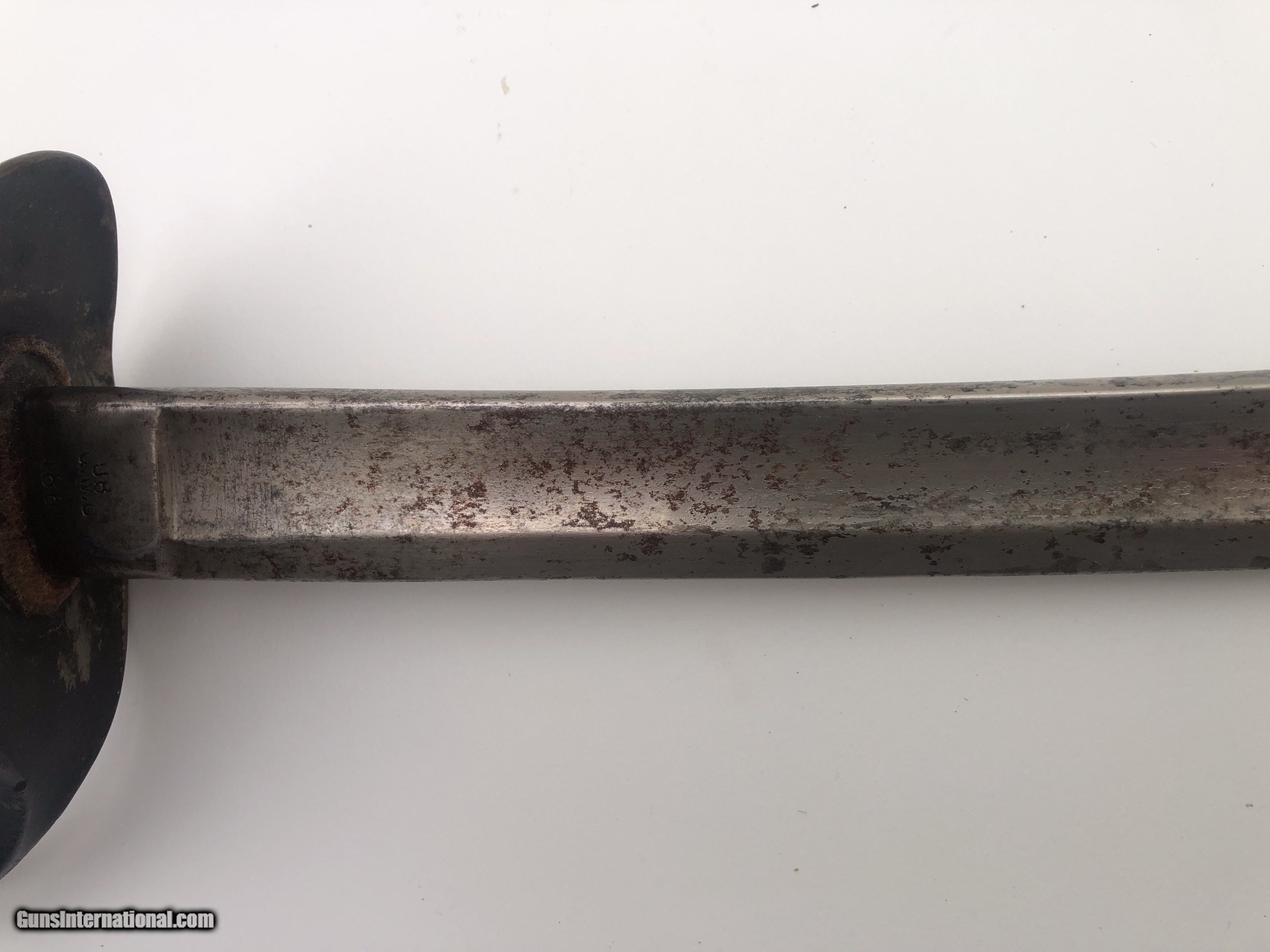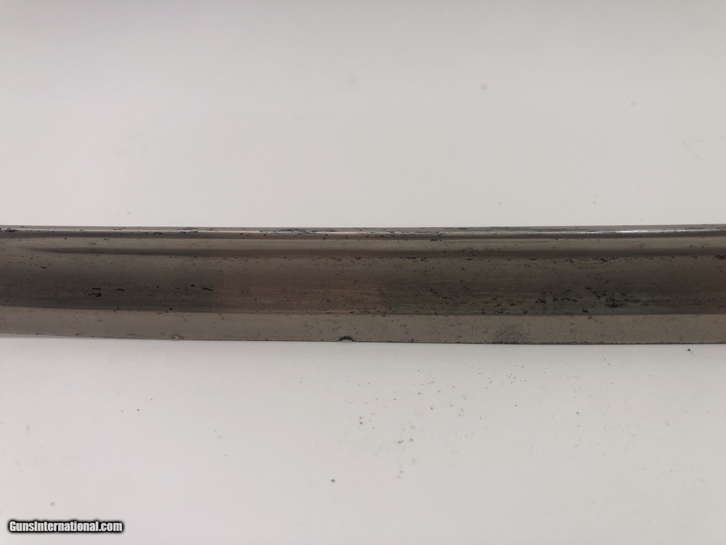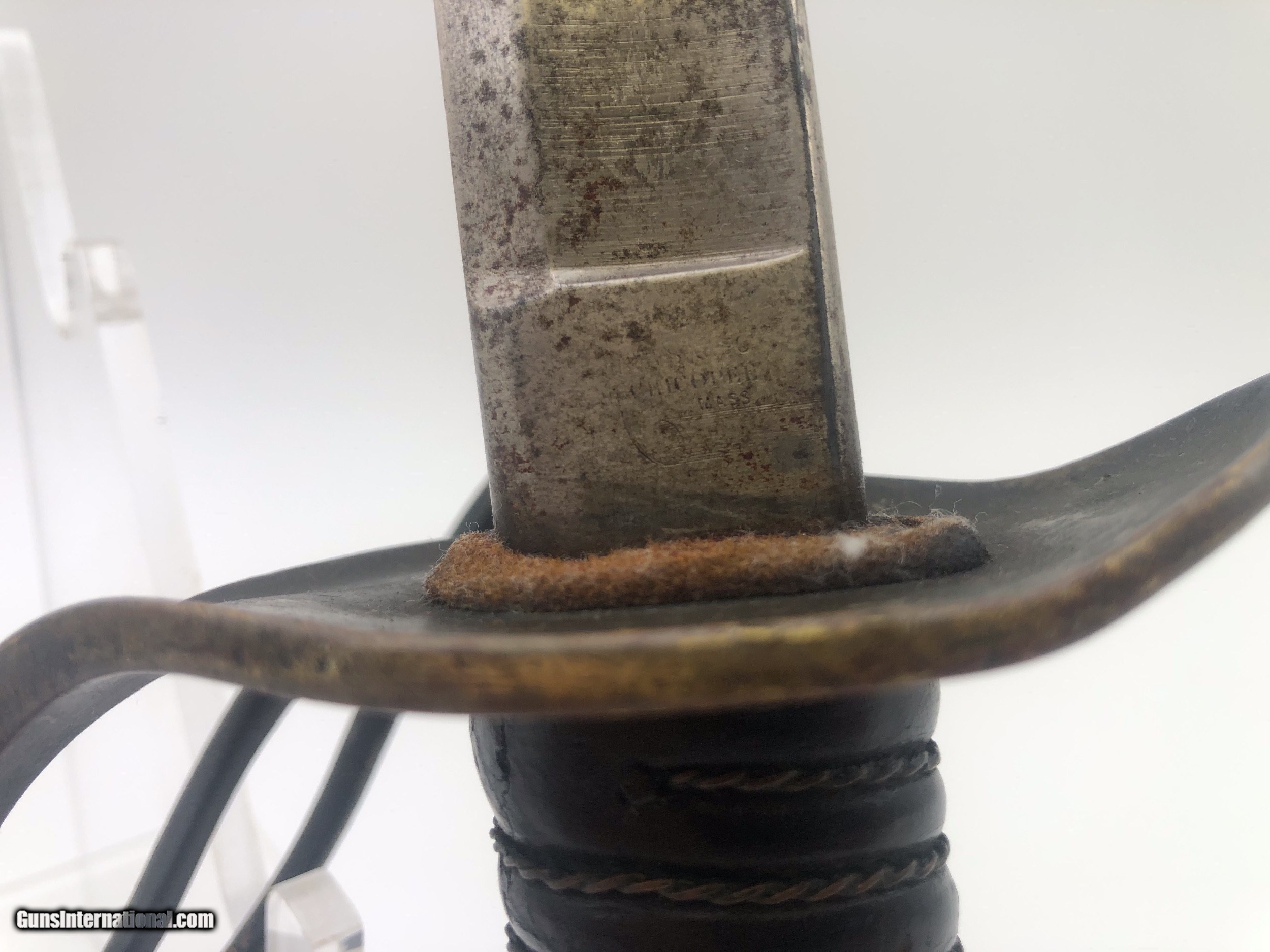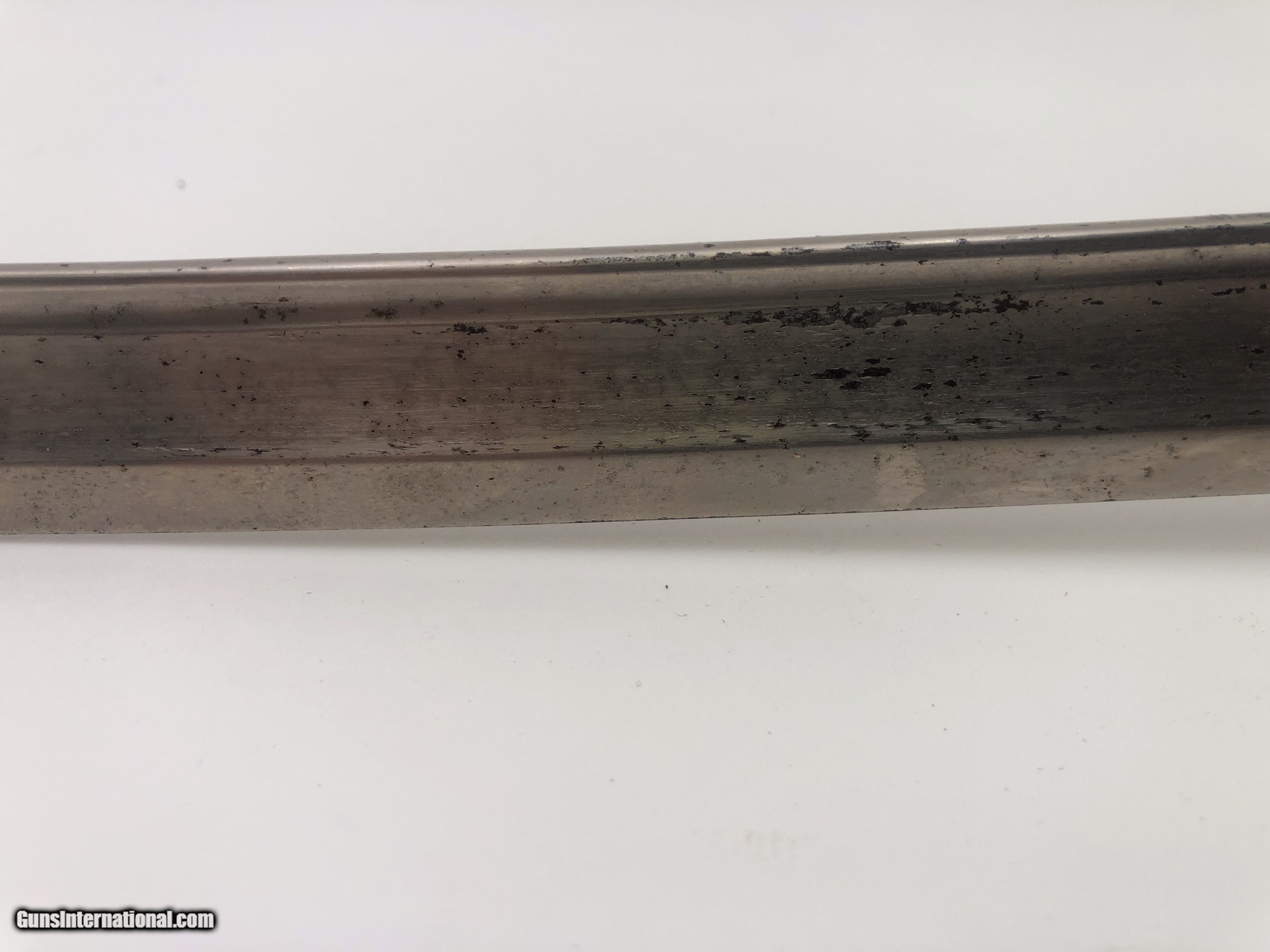 Description: This Ames 1860 model is dated 1865 and was govt. inspected by "GWC". Condition The leather grip wrap and wire are very good and all original. The brass hilt shows a dark untouched patina with some crusted areas. The blade retains its original leather washer and has some areas of rust spotting. The scabbard is a very dark uncleaned age patina with just a couple of very minor dents. This is a good honest untouched as found Civil War sword. Condition Overall in scabbard 42.80" Sword 40.80" Blade length 34.75" Blade width 1.07" SOLD |