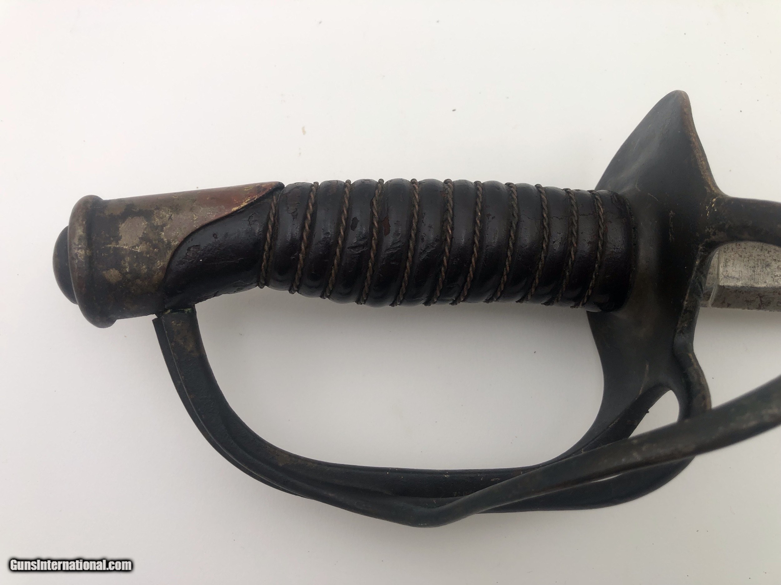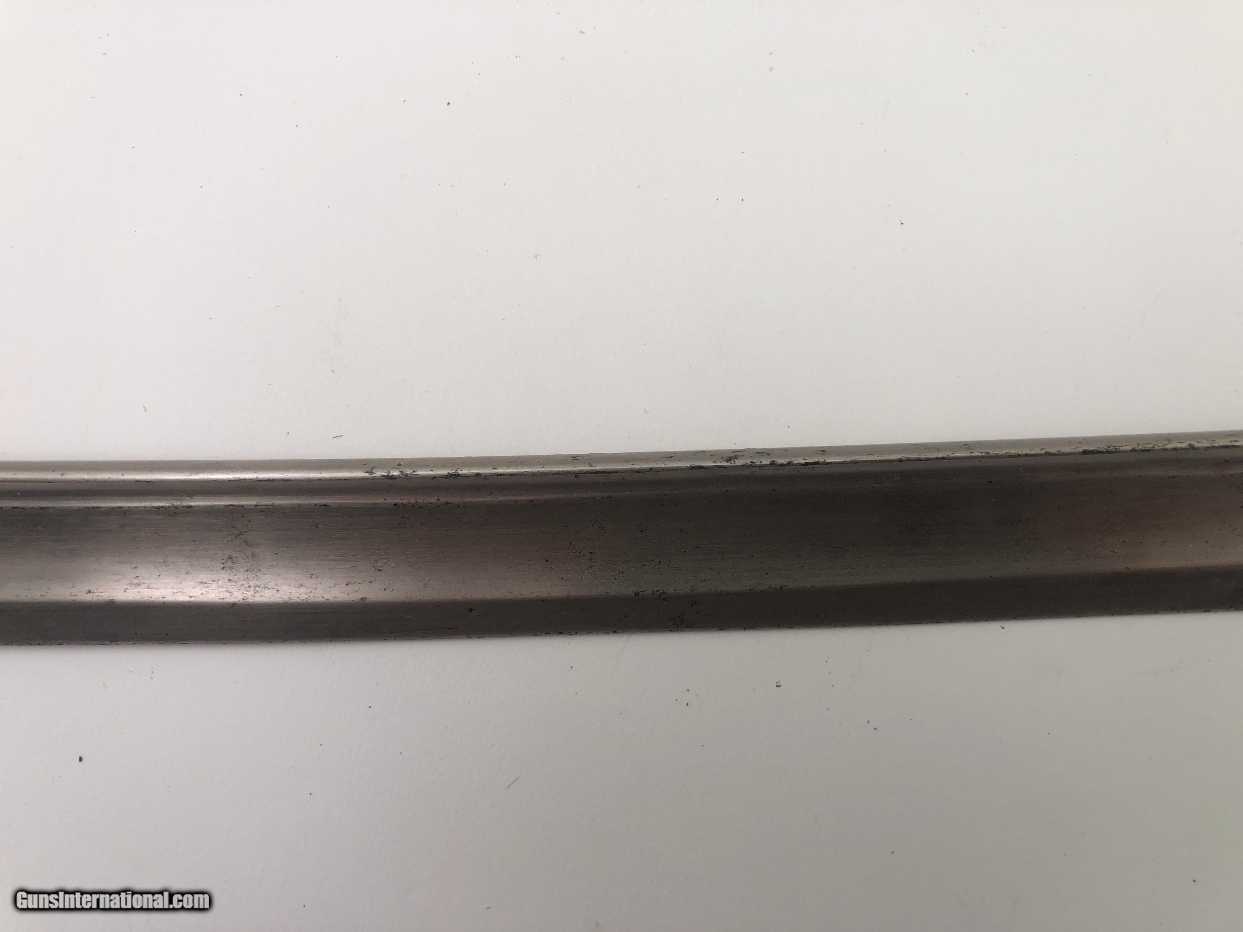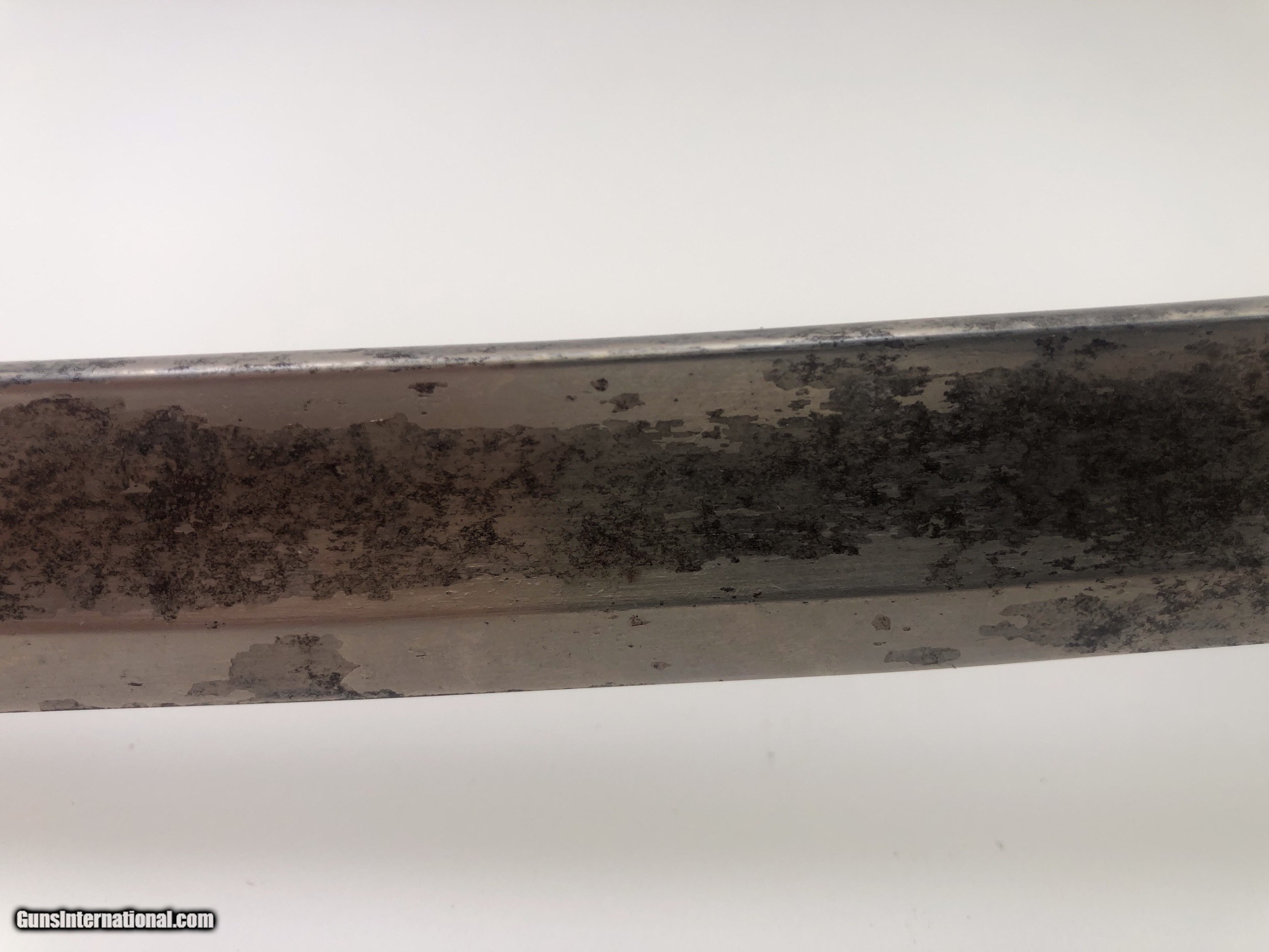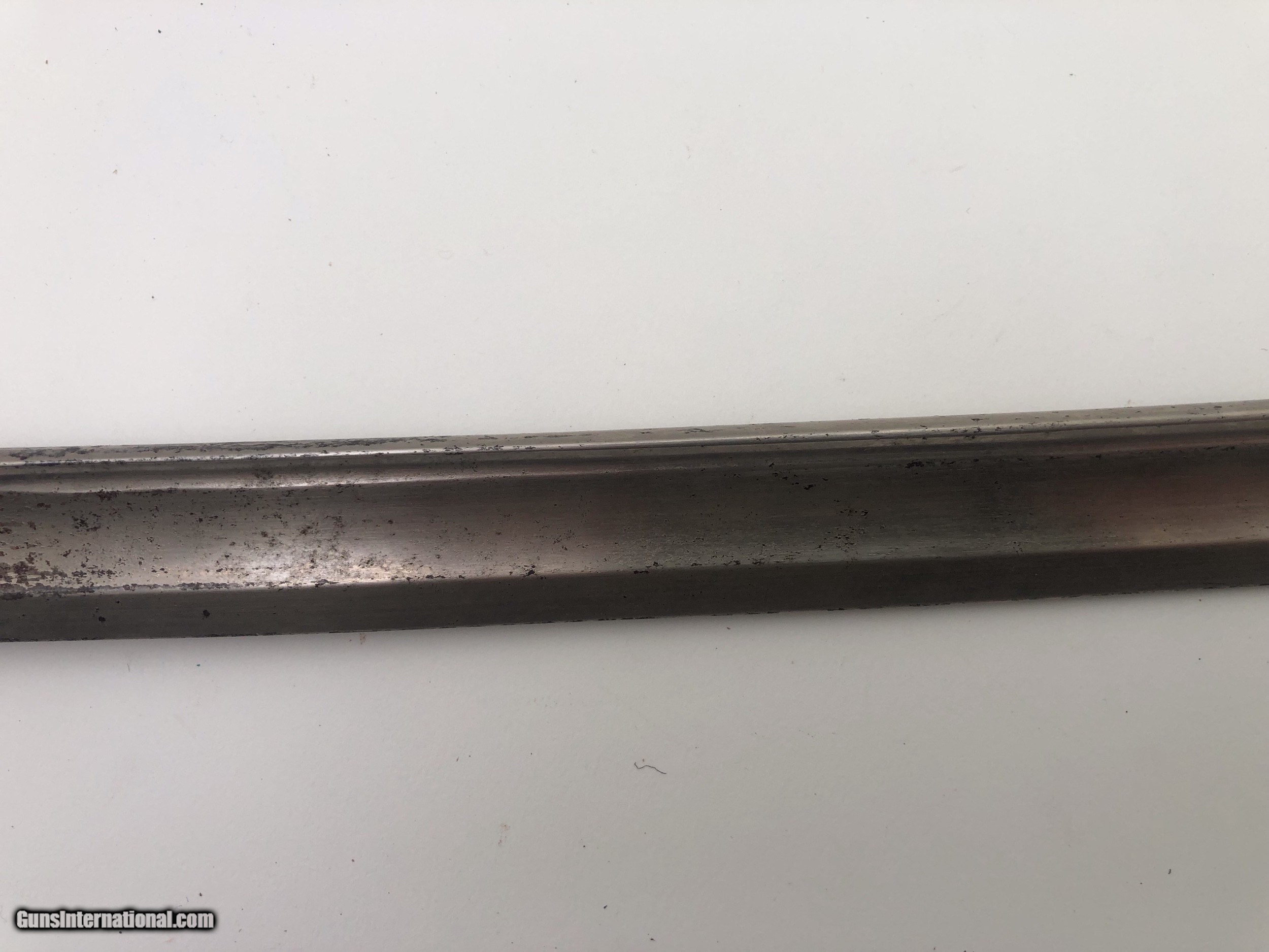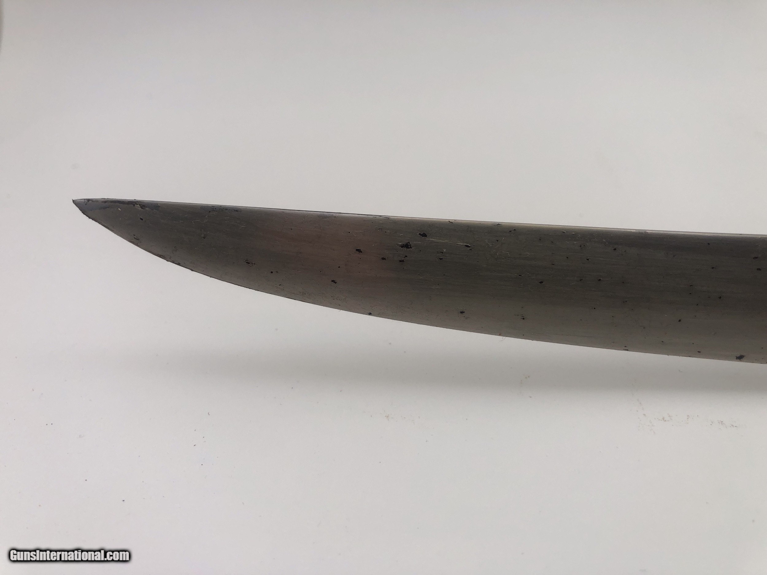 Description: This Ames 1860 model is dated 1865 and was govt. inspected by "GWC". Condition The leather grip wrap and wire are very good and all original. The brass hilt shows a dark untouched patina with some crusted areas. The blade retains its original leather washer and has some areas of rust spotting. The scabbard is a very dark uncleaned age patina with just a couple of very minor dents. This is a good honest untouched as found Civil War sword. Condition Overall in scabbard 42.80" Sword 40.80" Blade length 34.75" Blade width 1.07" SOLD |