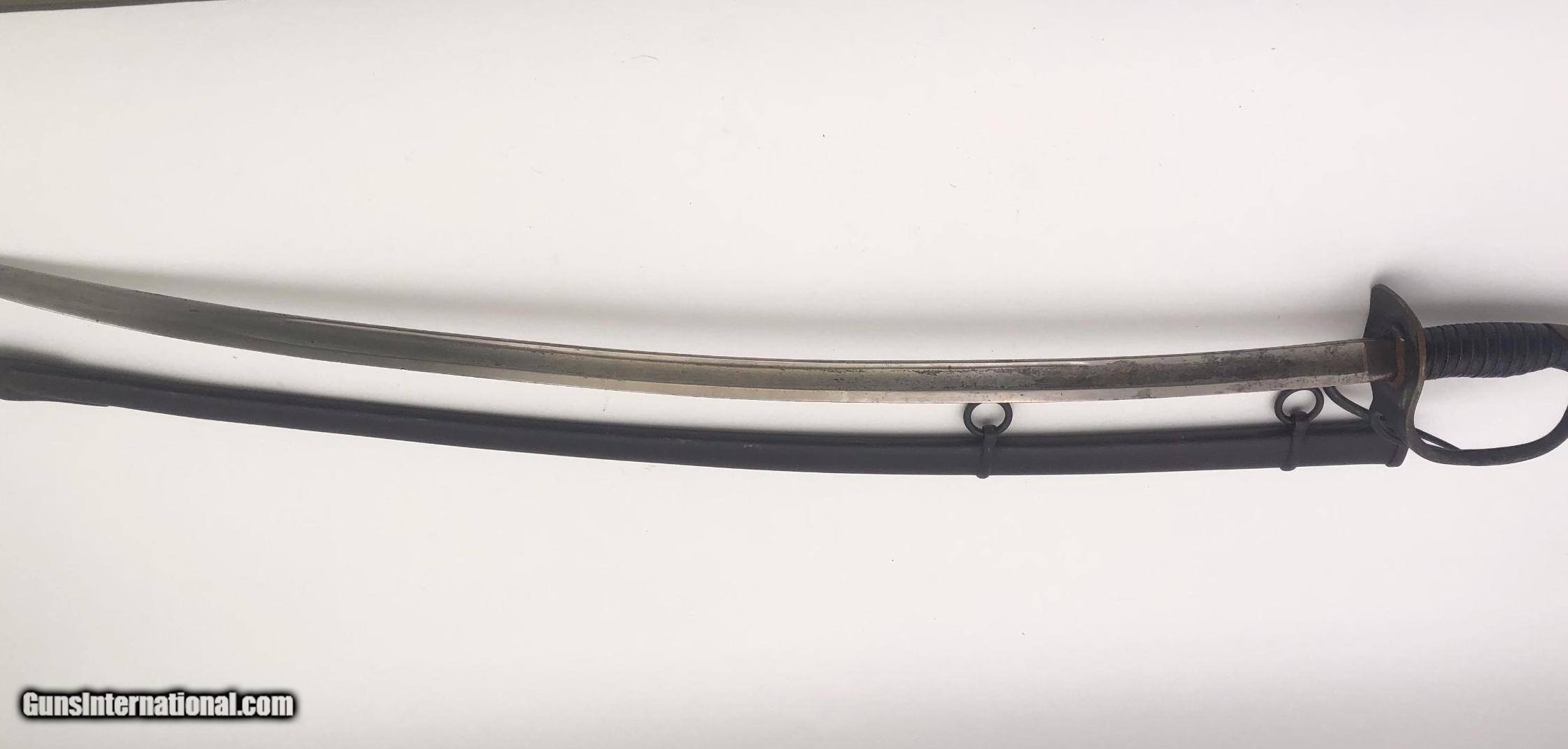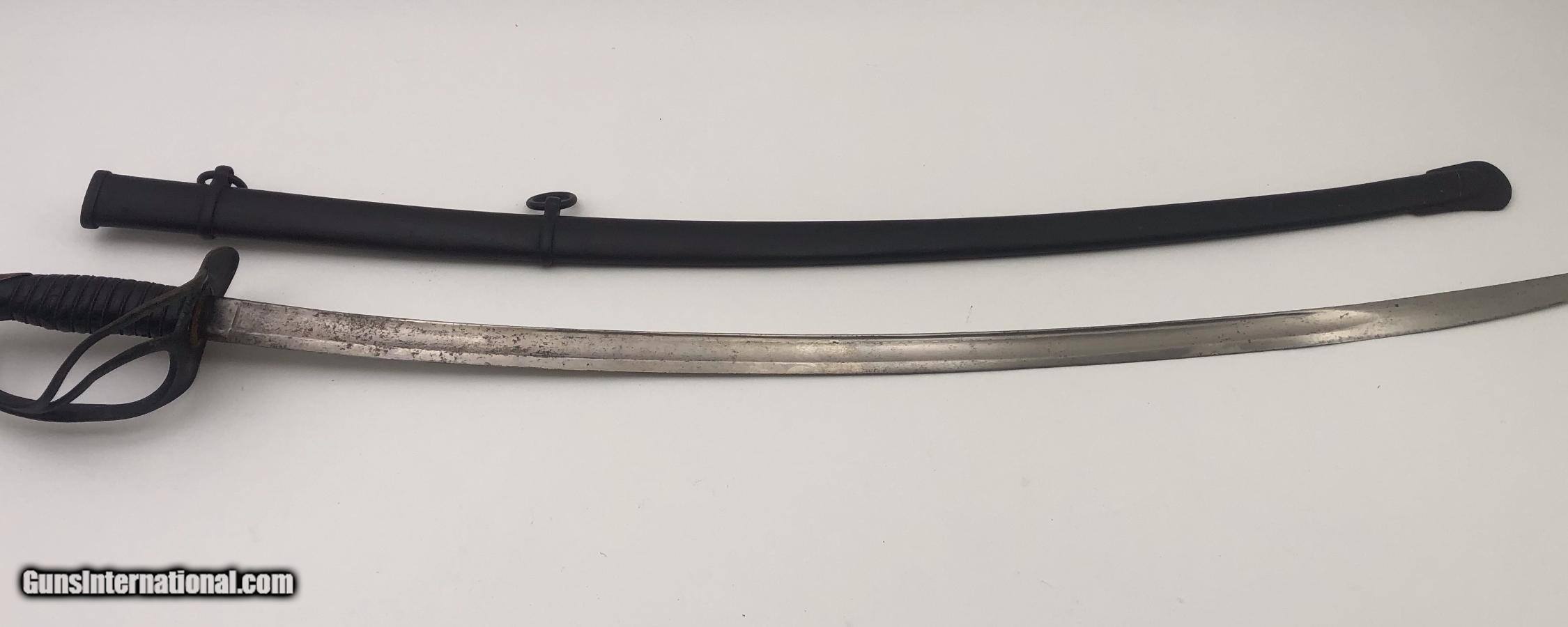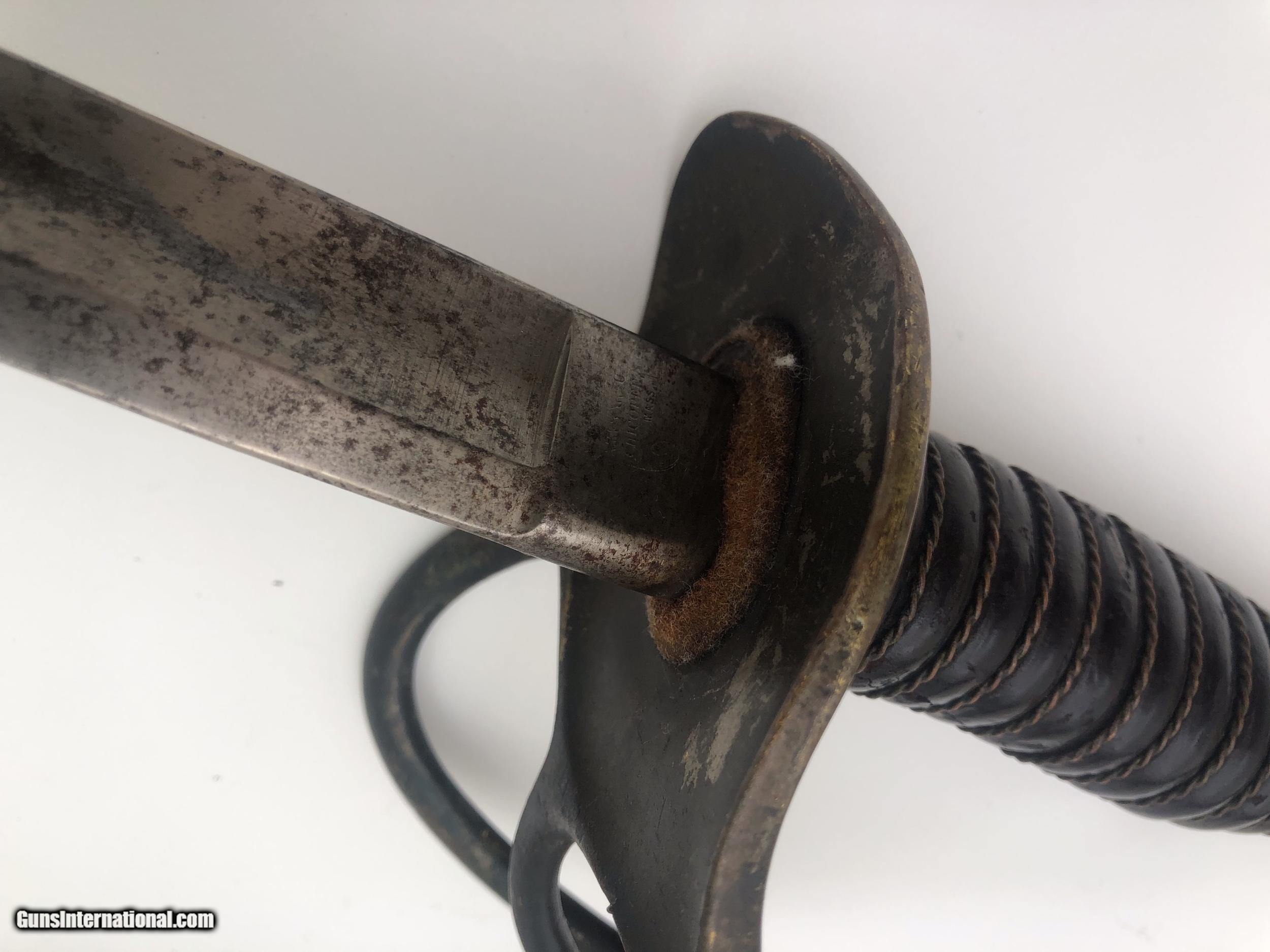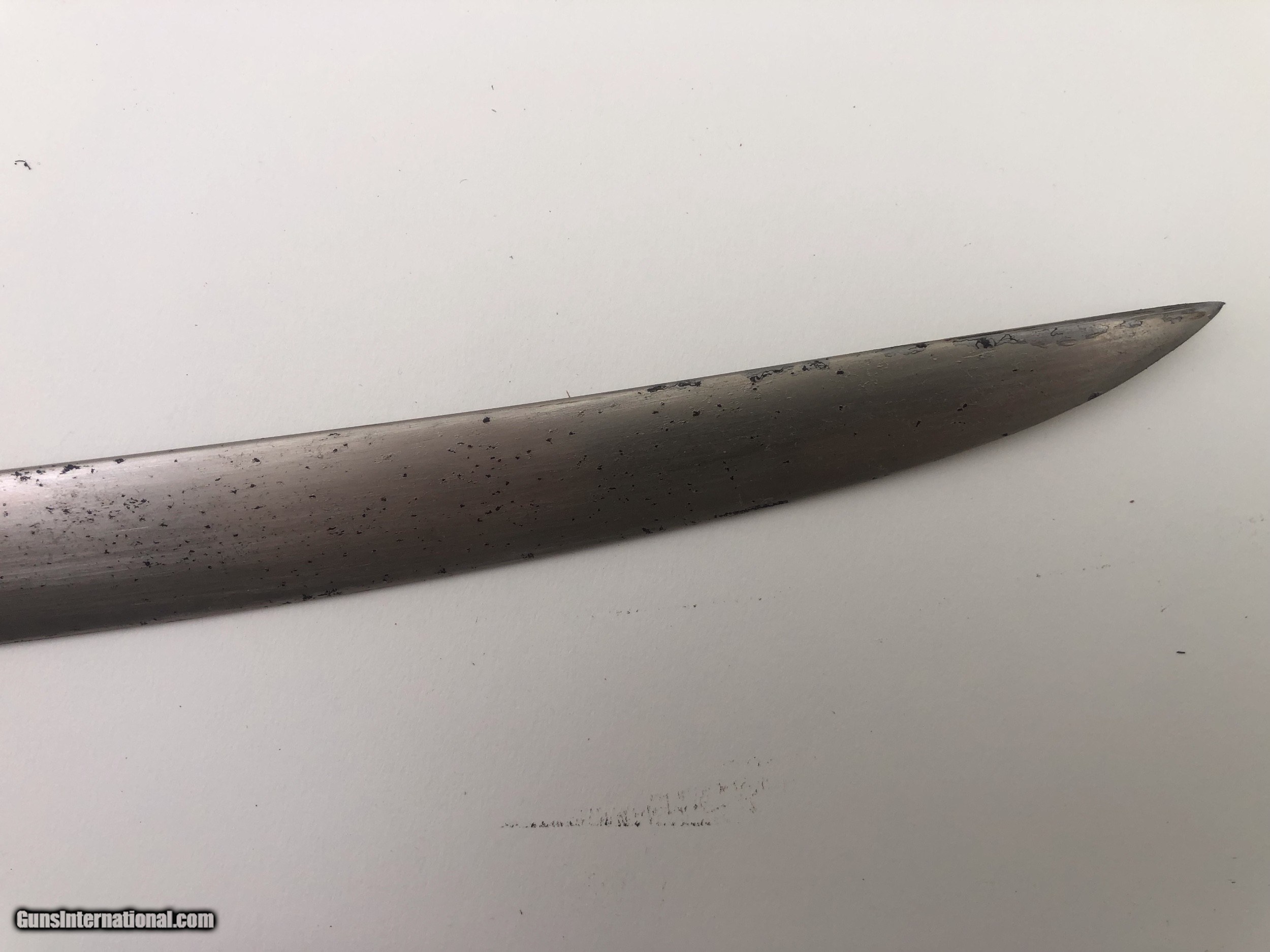 Description: This Ames 1860 model is dated 1865 and was govt. inspected by "GWC". Condition The leather grip wrap and wire are very good and all original. The brass hilt shows a dark untouched patina with some crusted areas. The blade retains its original leather washer and has some areas of rust spotting. The scabbard is a very dark uncleaned age patina with just a couple of very minor dents. This is a good honest untouched as found Civil War sword. Condition Overall in scabbard 42.80" Sword 40.80" Blade length 34.75" Blade width 1.07" SOLD |
