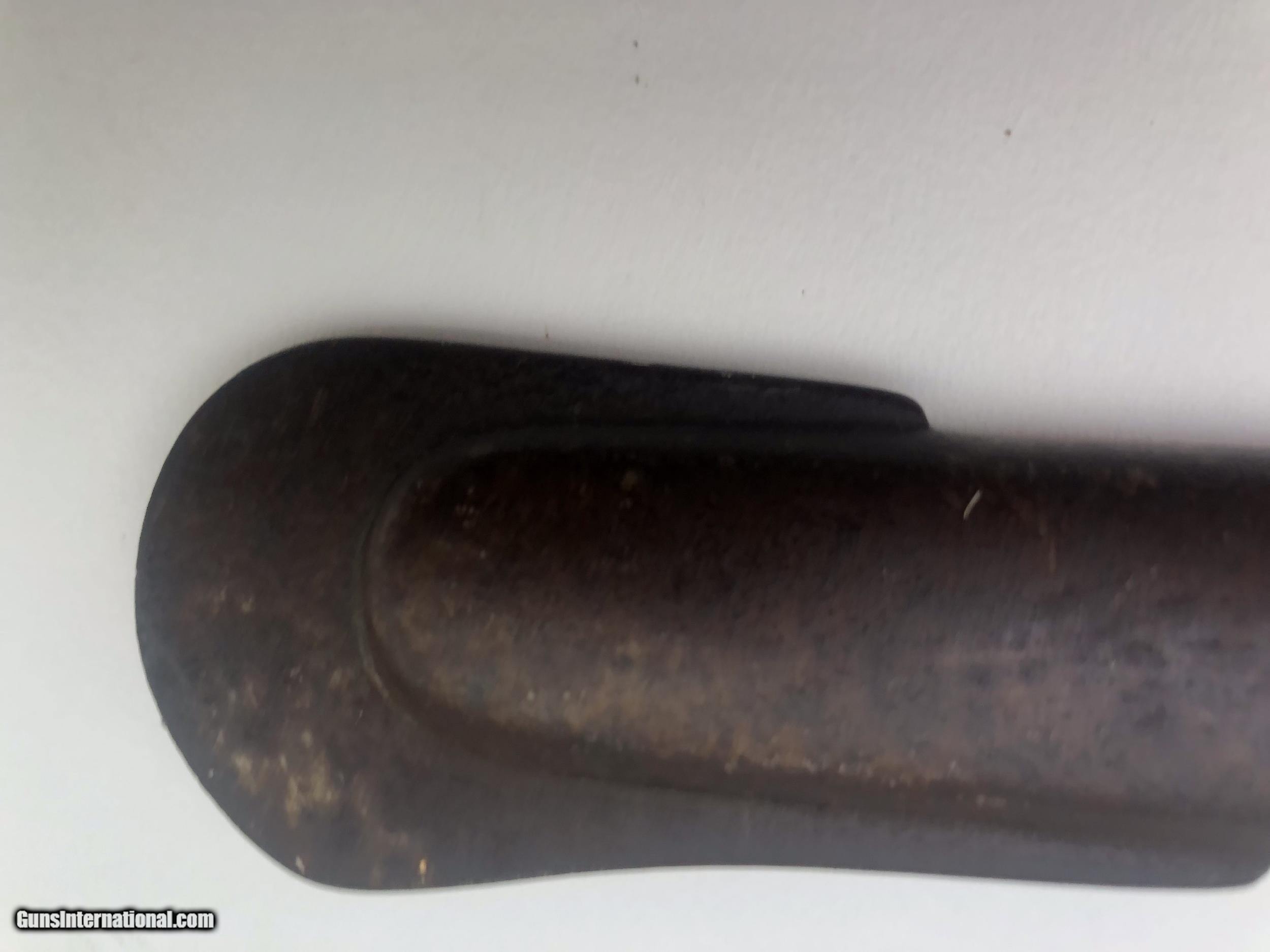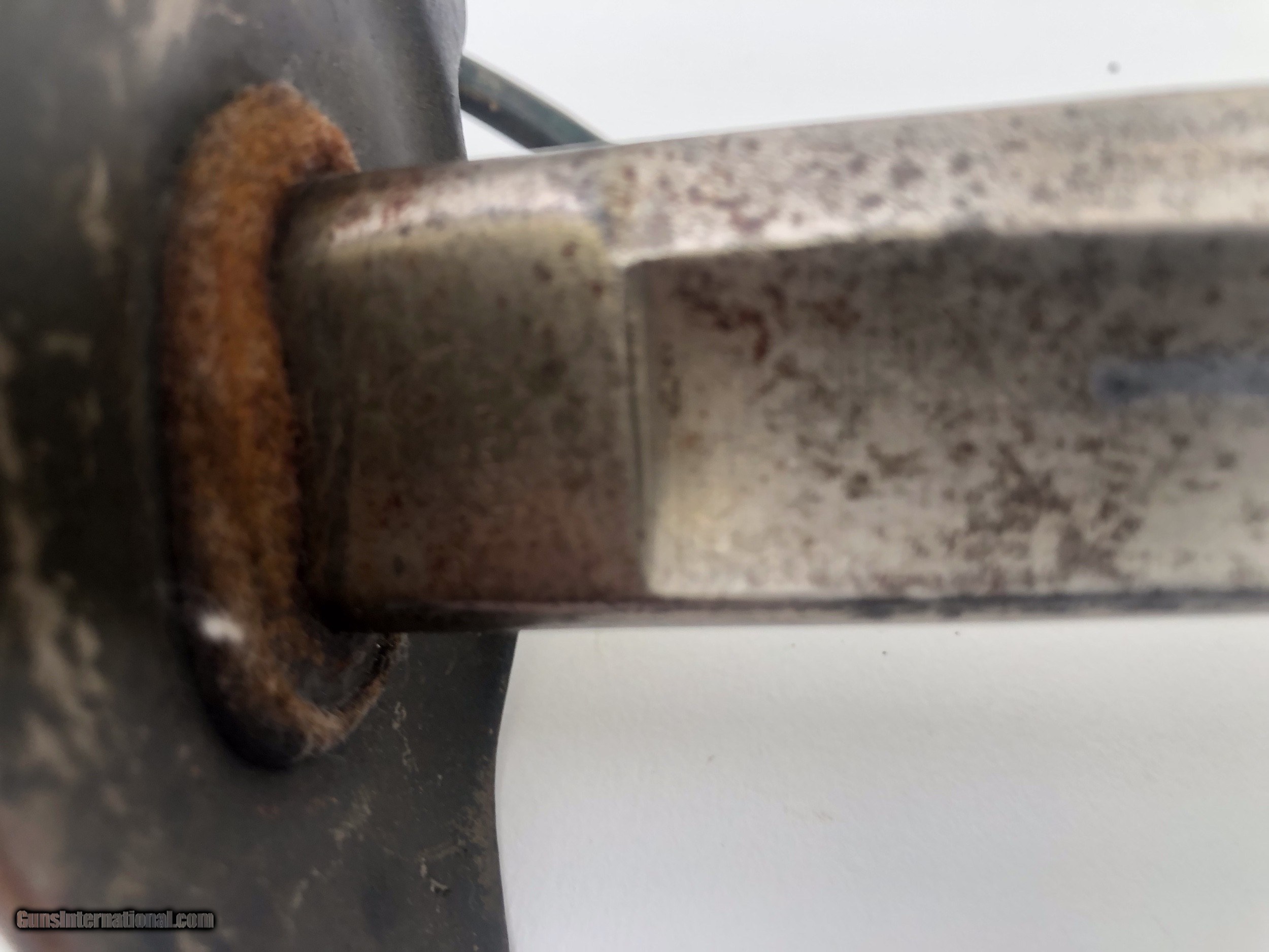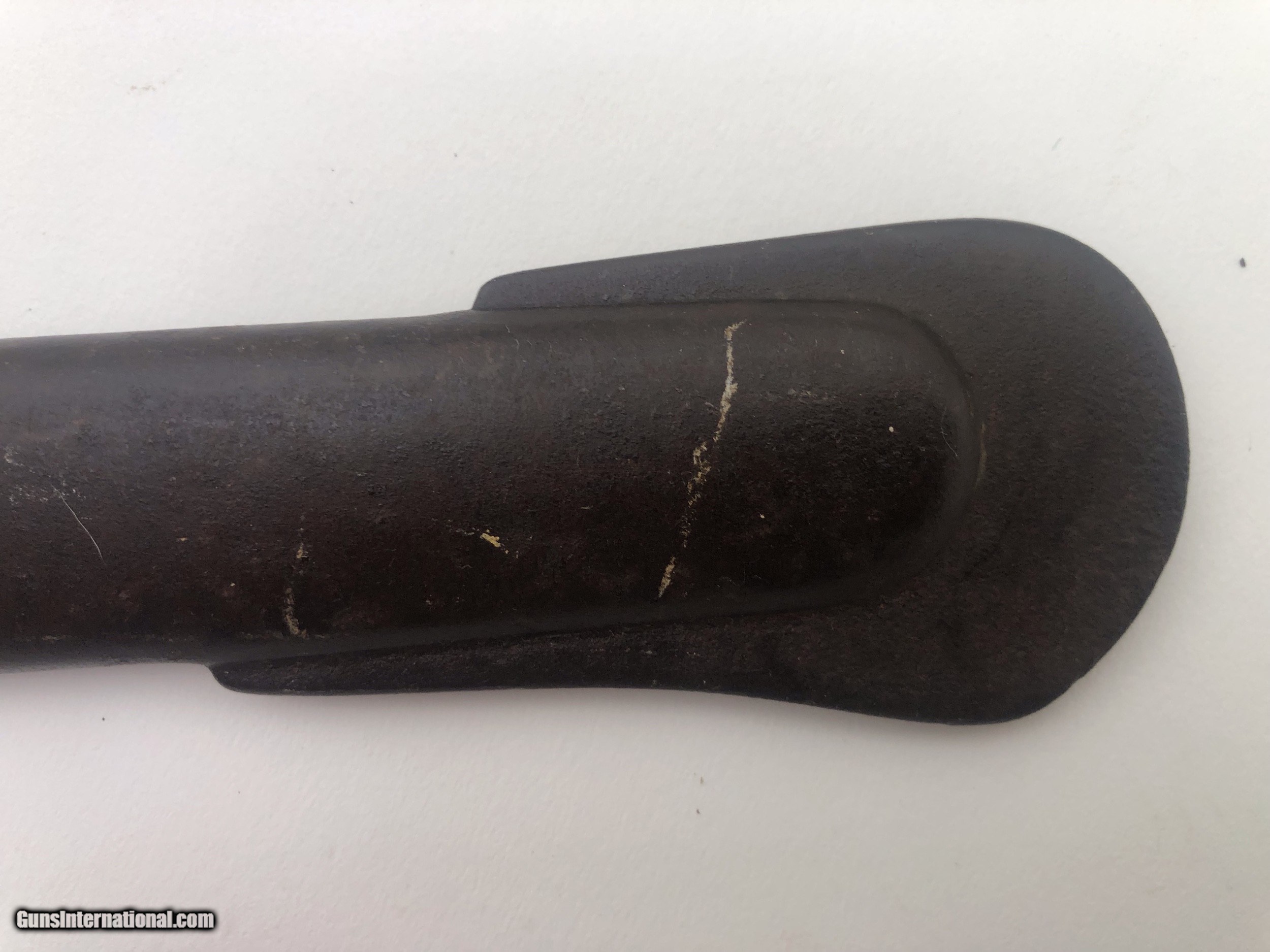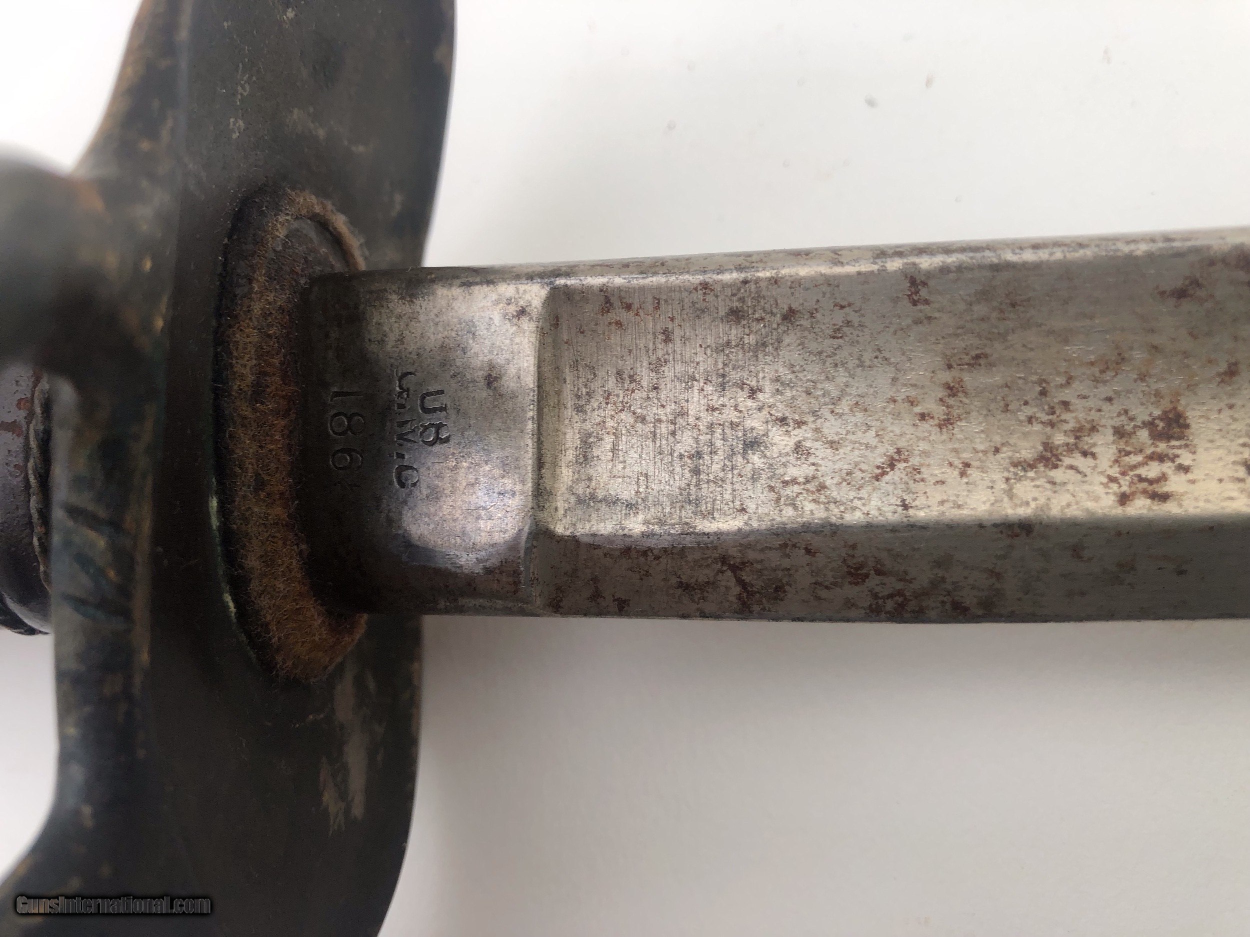 Description: This Ames 1860 model is dated 1865 and was govt. inspected by "GWC". Condition The leather grip wrap and wire are very good and all original. The brass hilt shows a dark untouched patina with some crusted areas. The blade retains its original leather washer and has some areas of rust spotting. The scabbard is a very dark uncleaned age patina with just a couple of very minor dents. This is a good honest untouched as found Civil War sword. Condition Overall in scabbard 42.80" Sword 40.80" Blade length 34.75" Blade width 1.07" SOLD |
