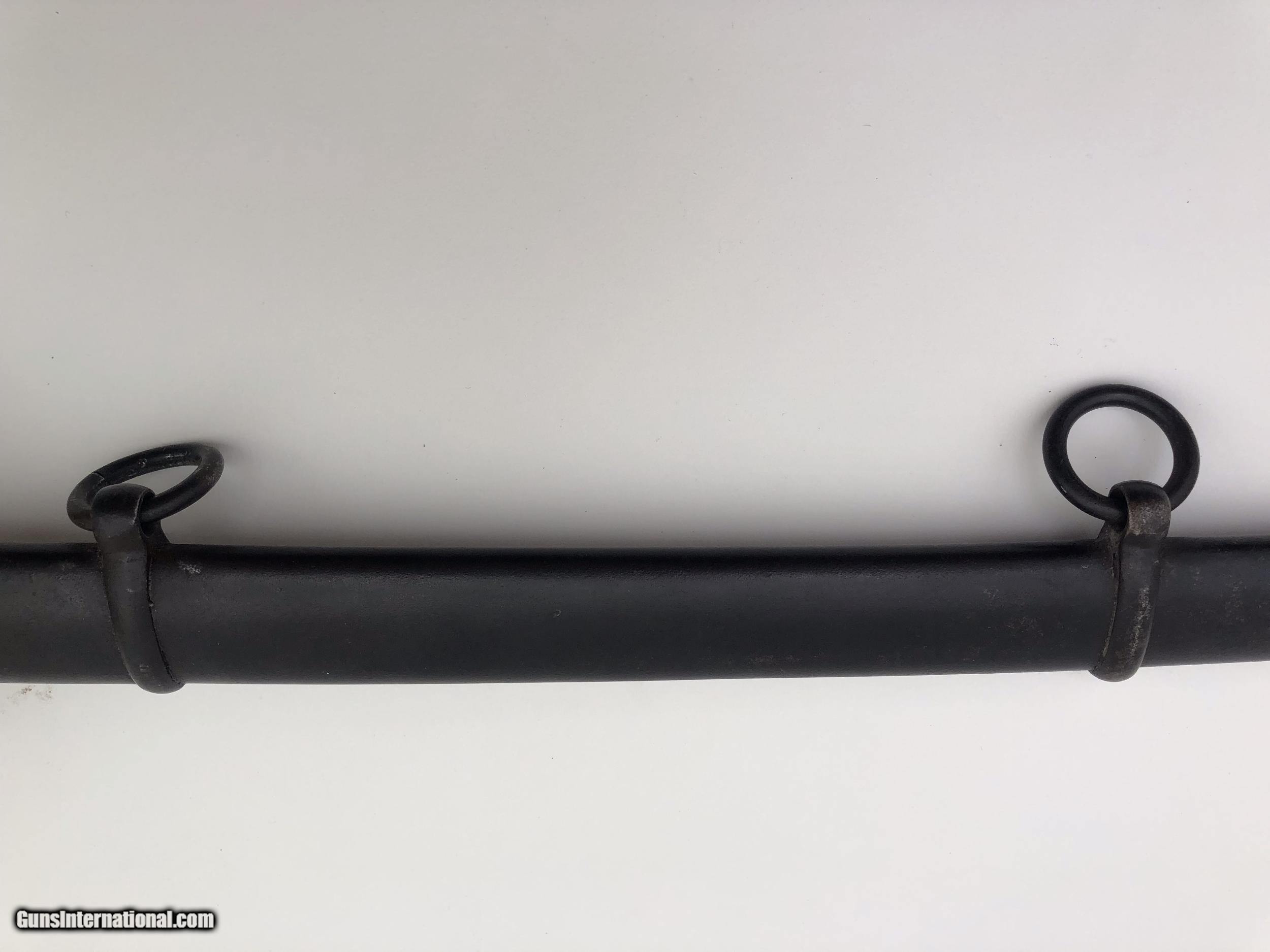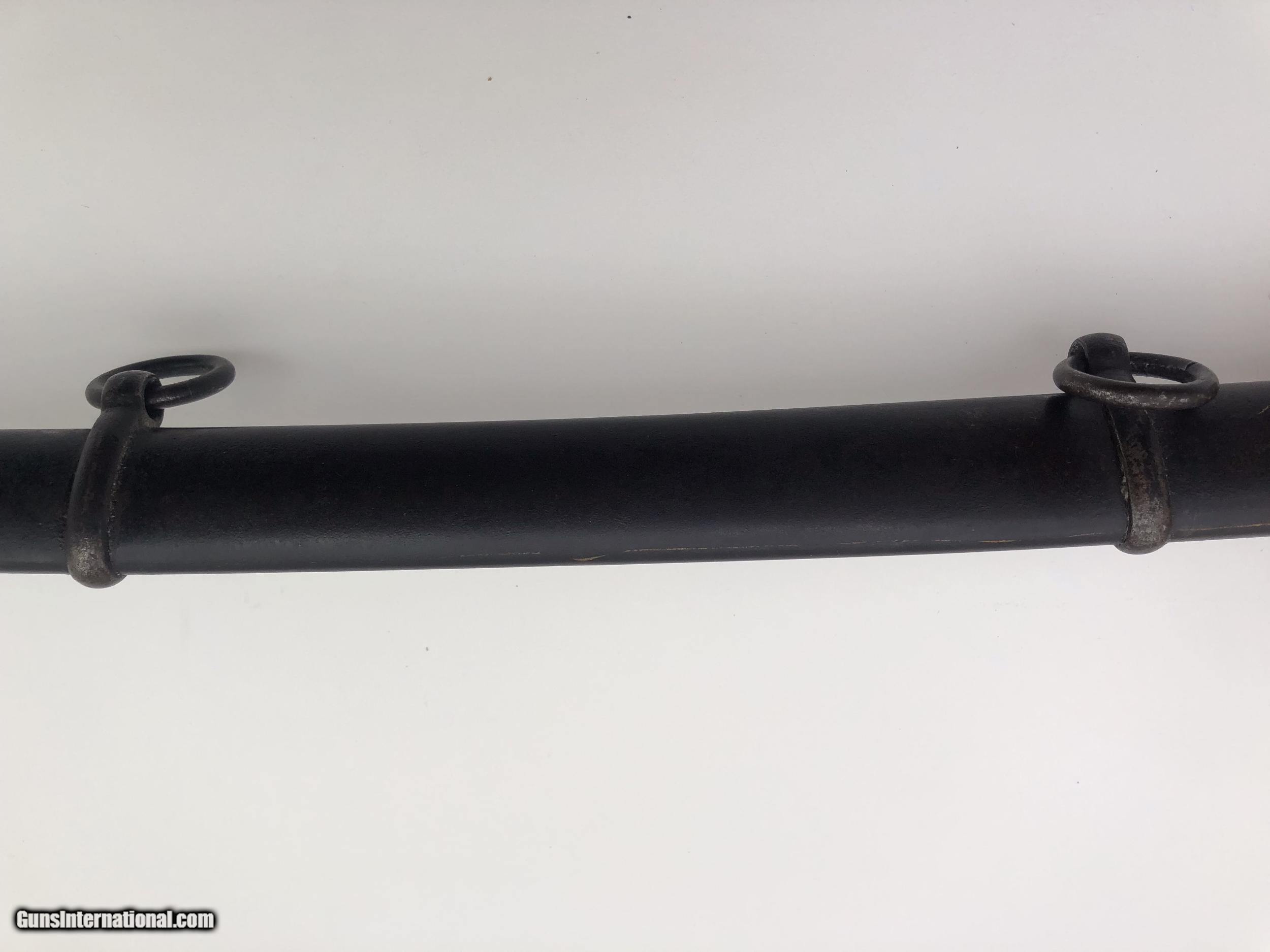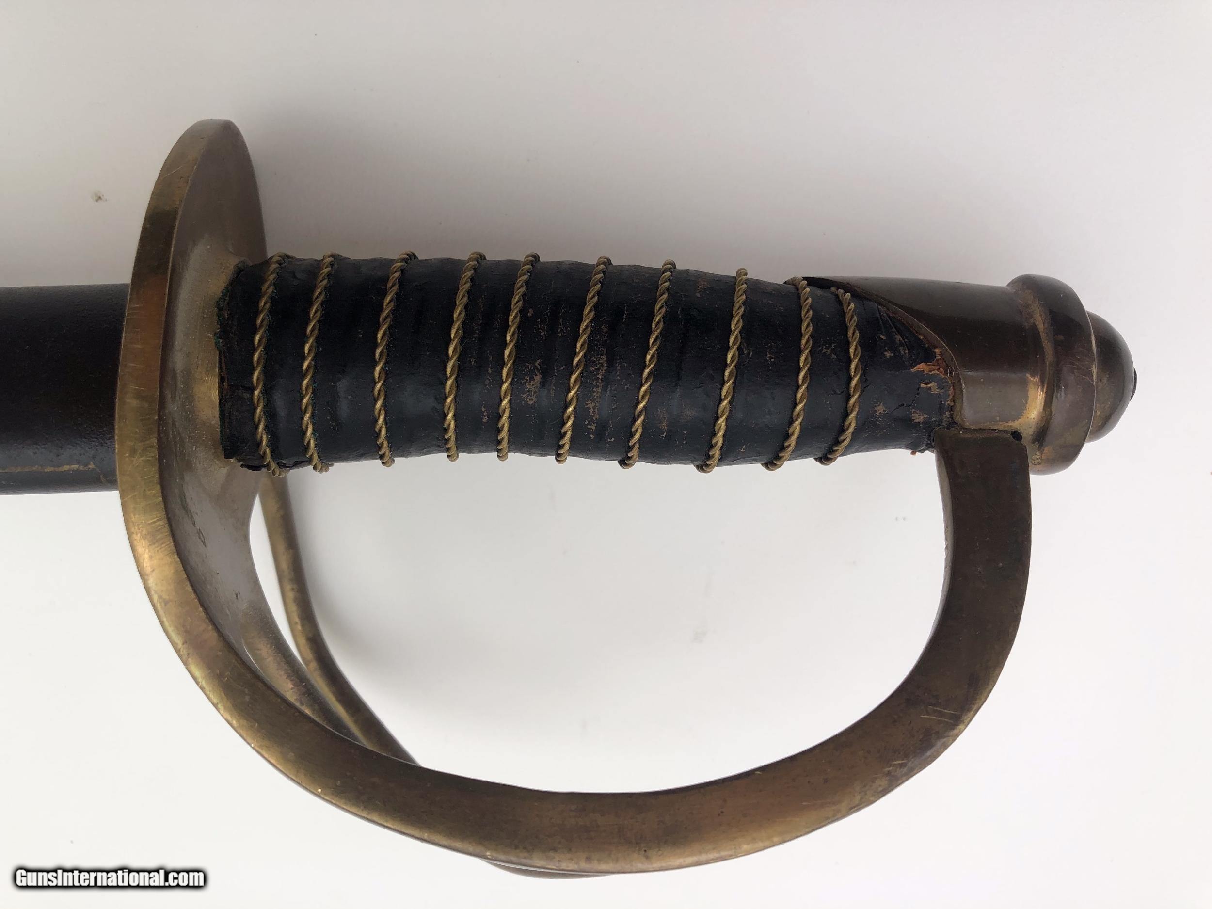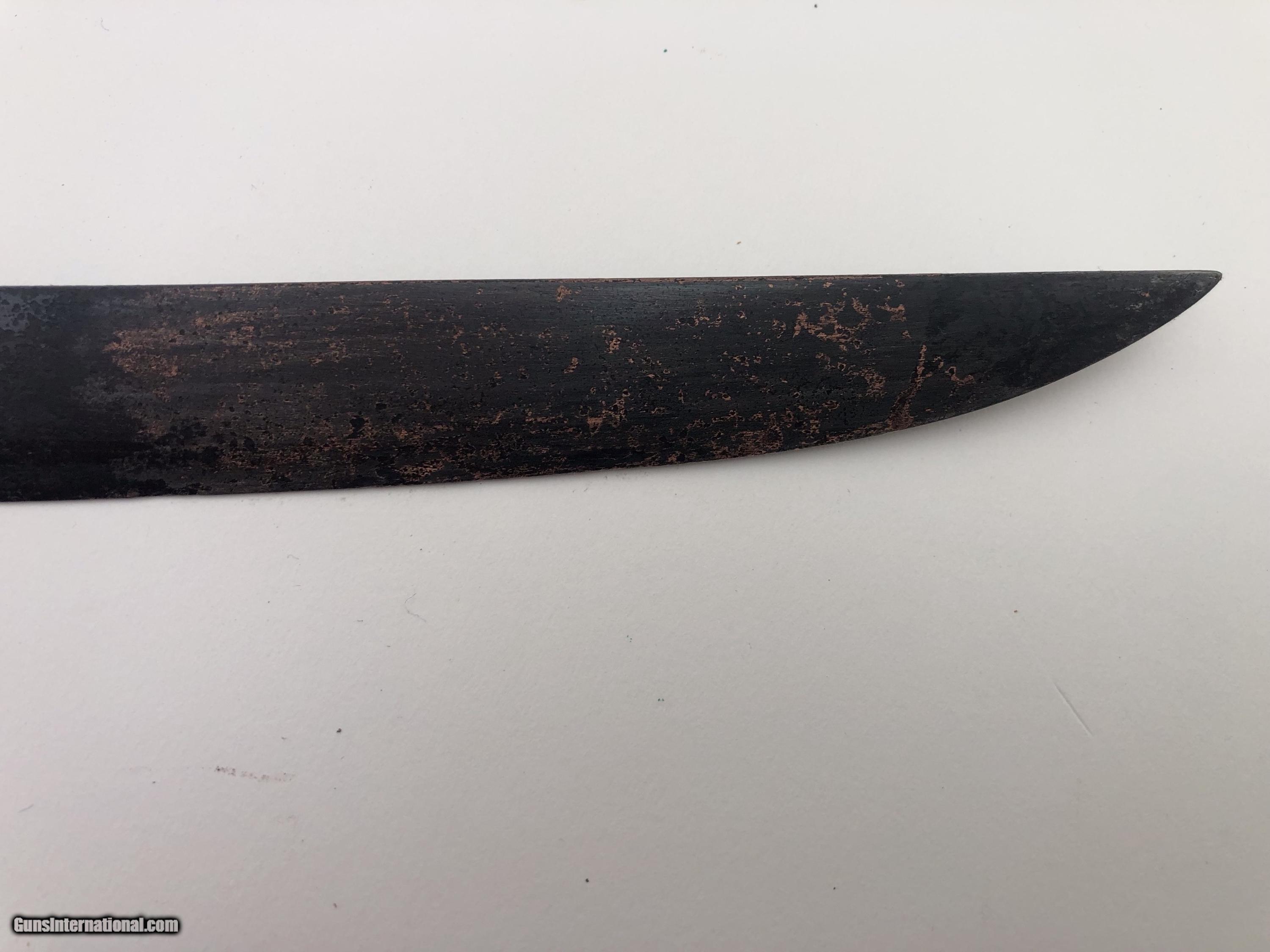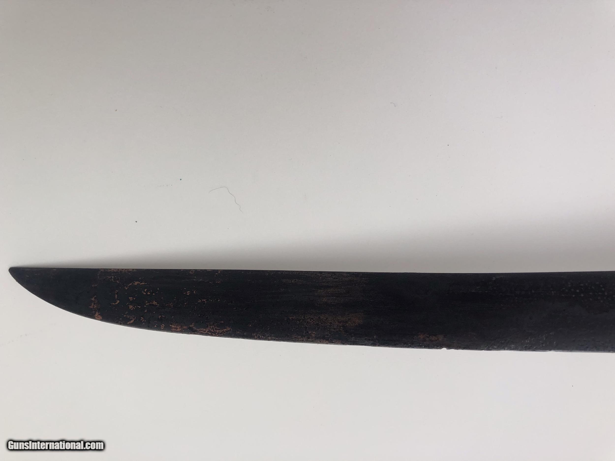 Description: The blade is dated 1862 and government inspected. Condition-- The blade has some rough areas mostly the front 12 inches. The brass hilt and guard are good and the grip has been rewrapped. The scabbard is a good dark age patina with no dents. The scabbard throat is missing. SOLD |