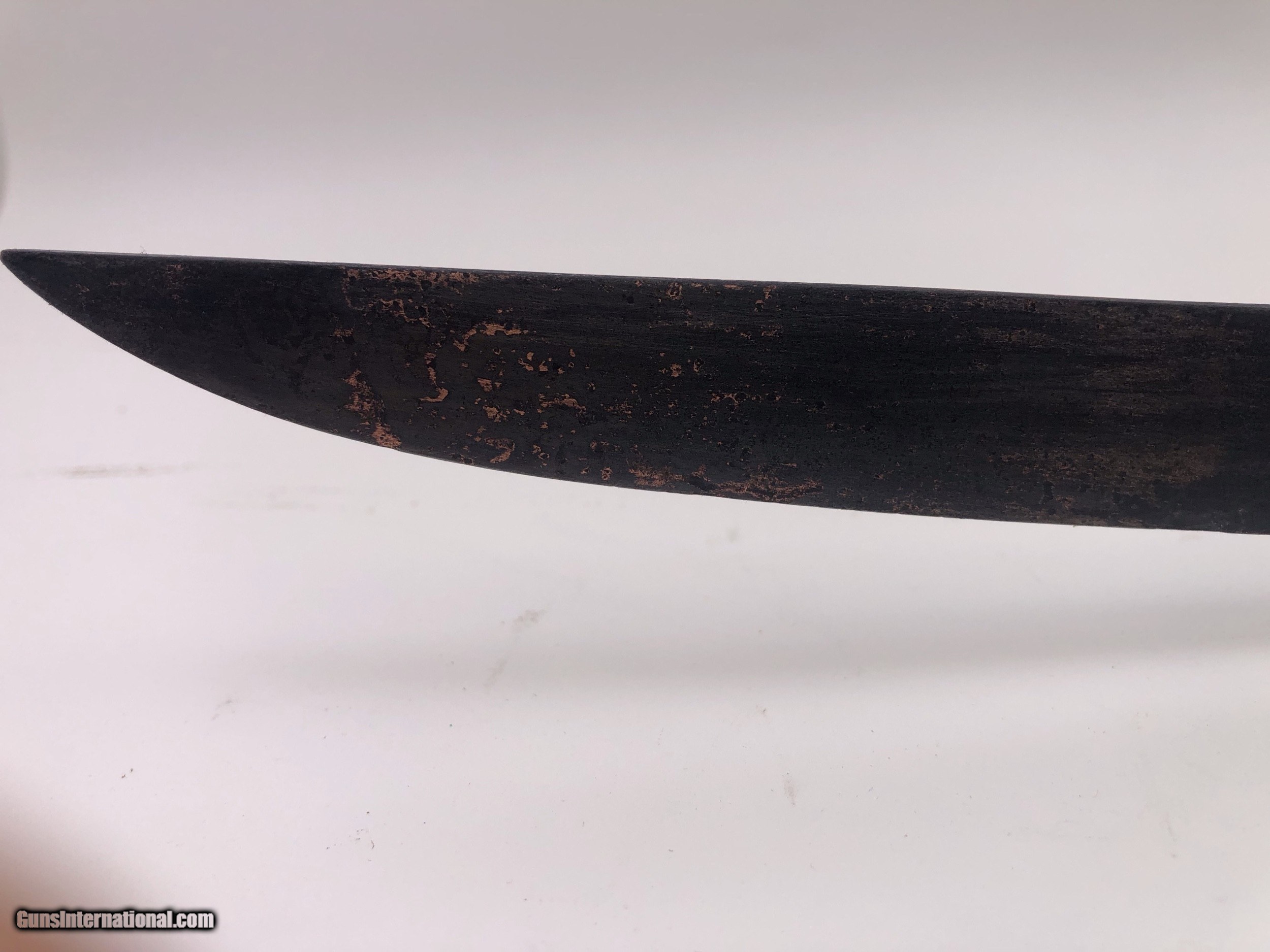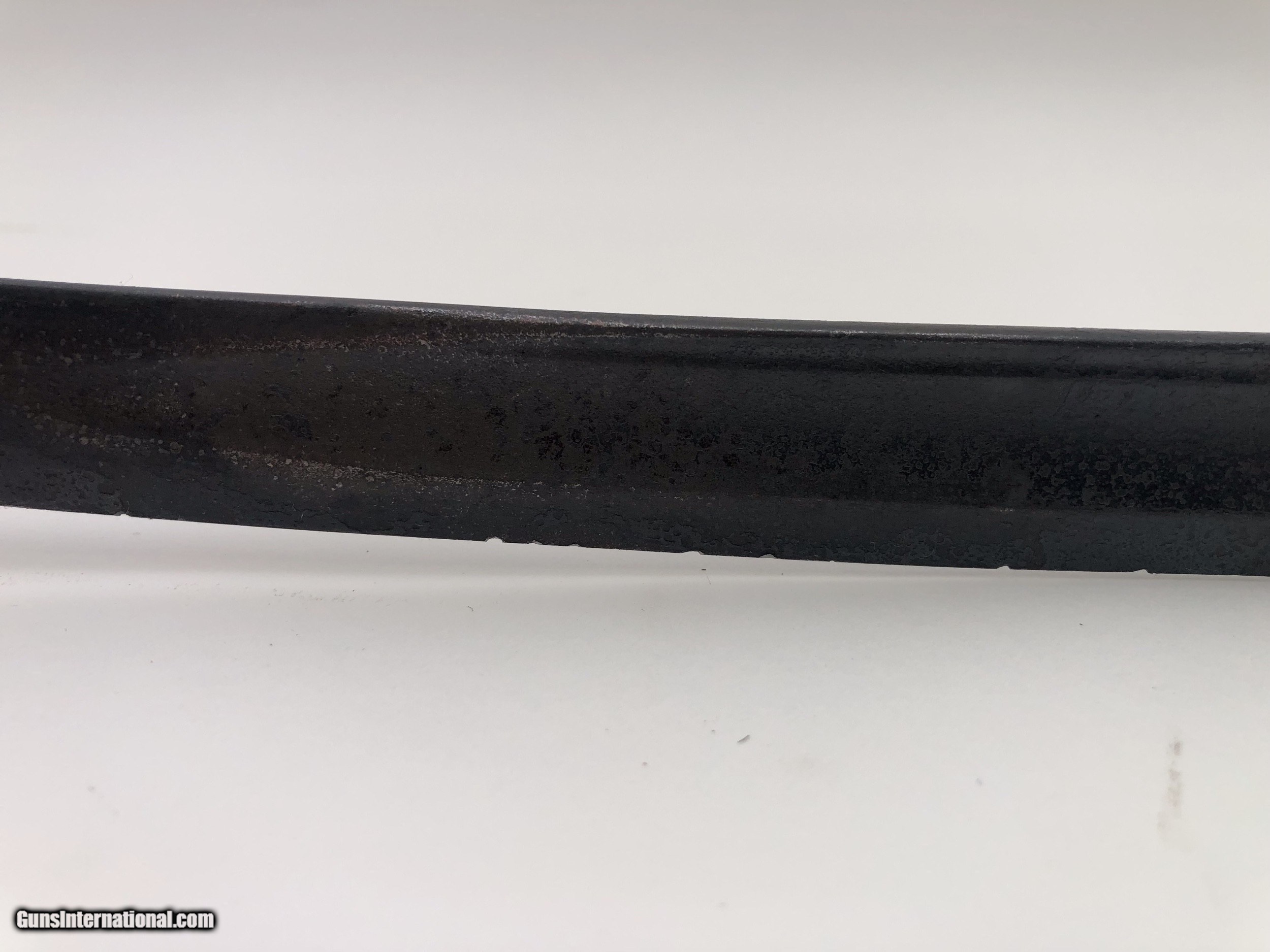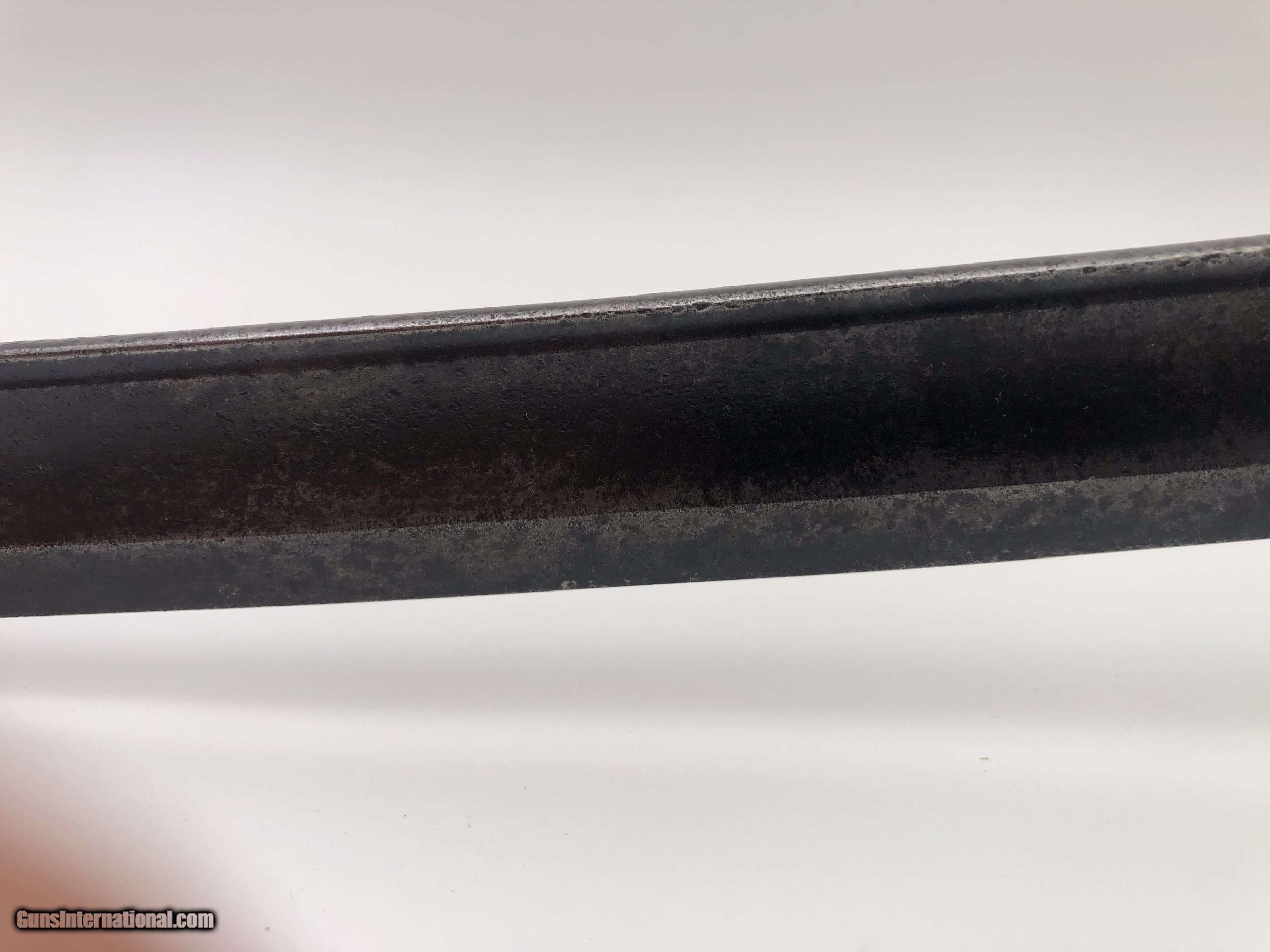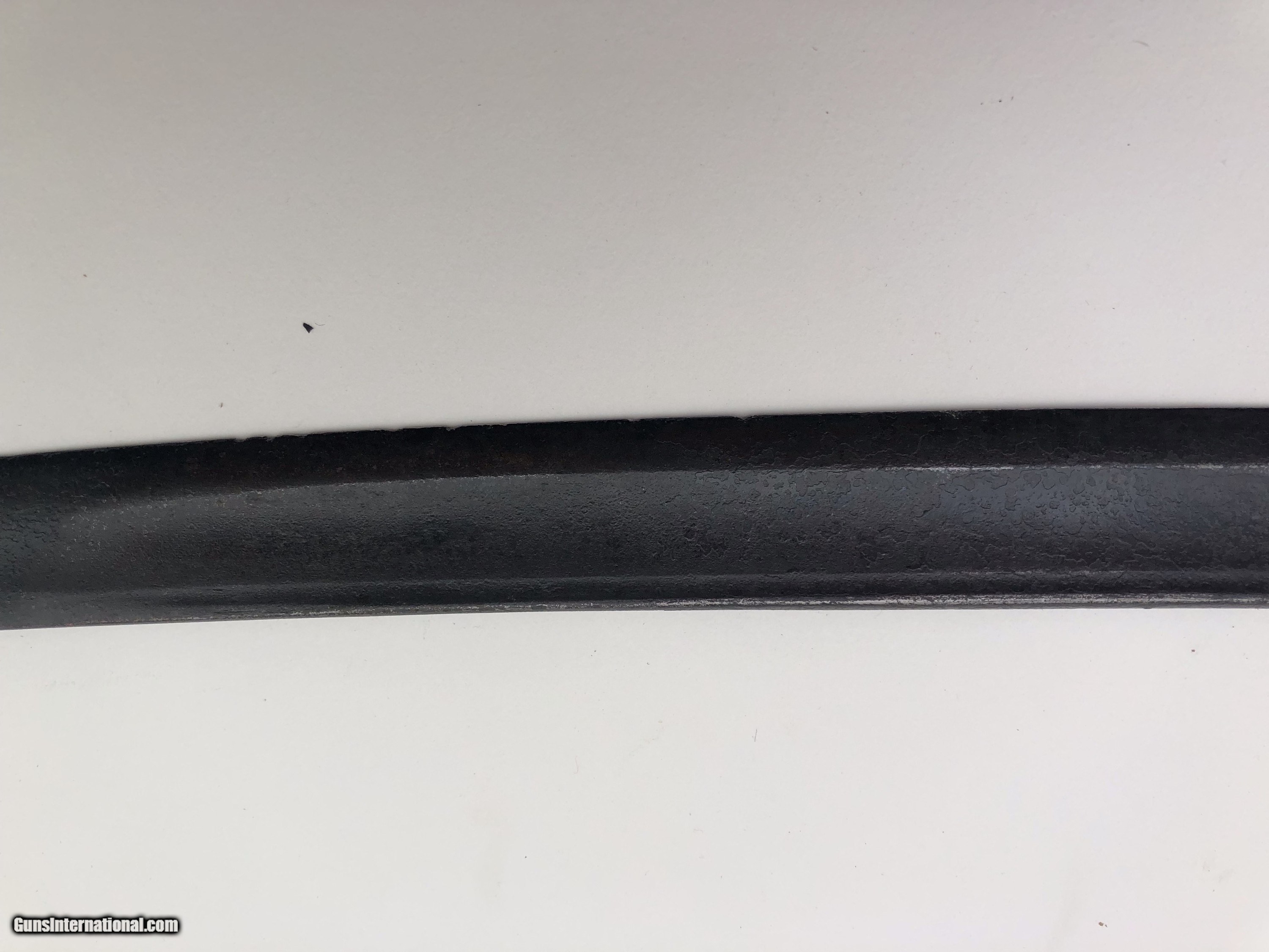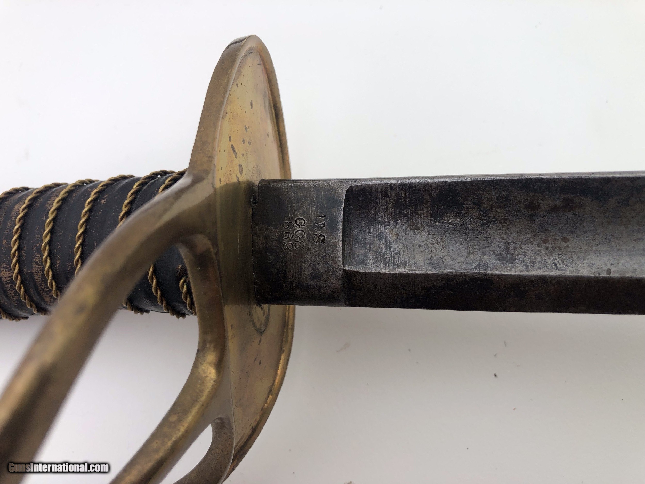 Description: The blade is dated 1862 and government inspected. Condition-- The blade has some rough areas mostly the front 12 inches. The brass hilt and guard are good and the grip has been rewrapped. The scabbard is a good dark age patina with no dents. The scabbard throat is missing. SOLD |