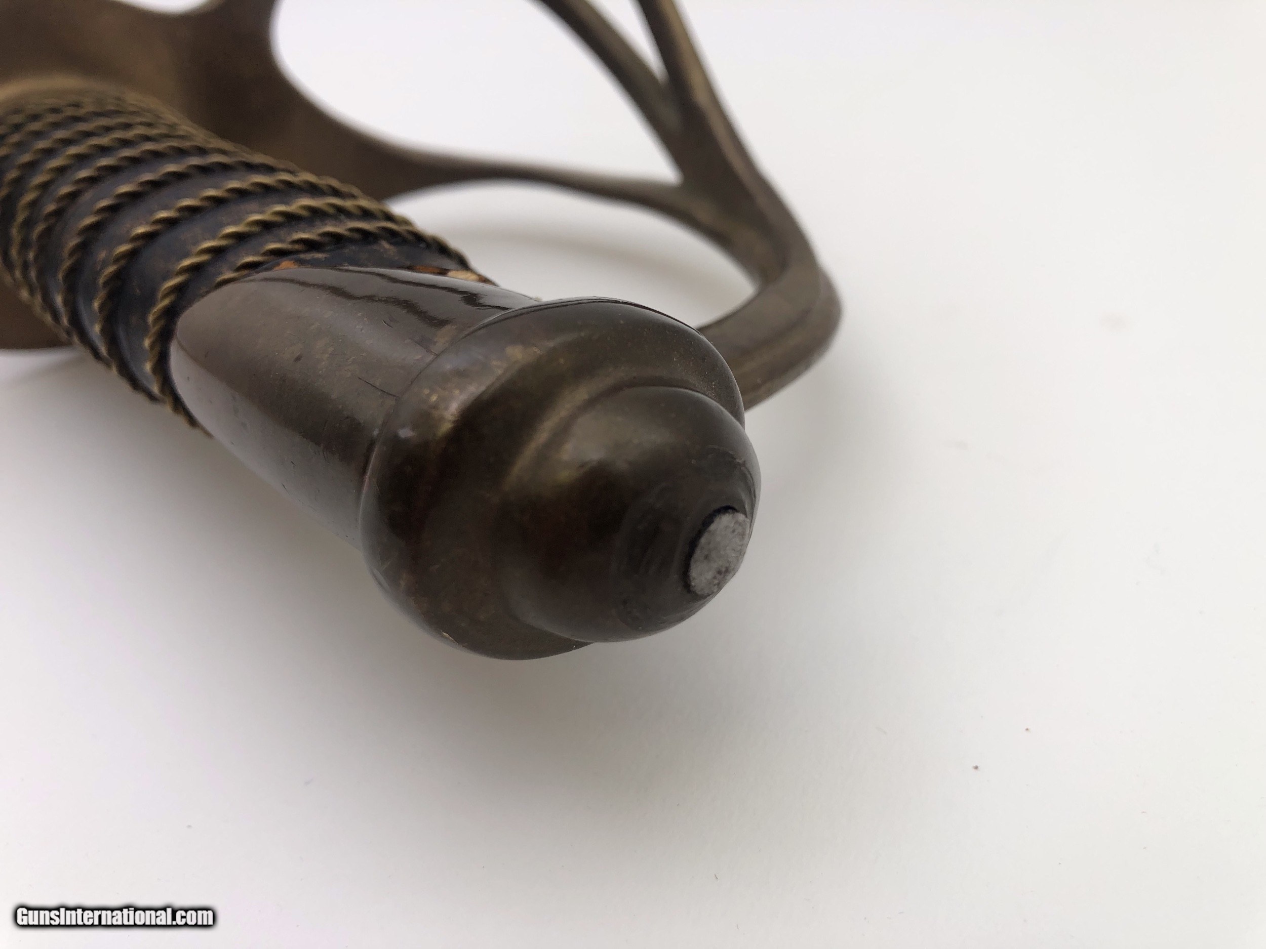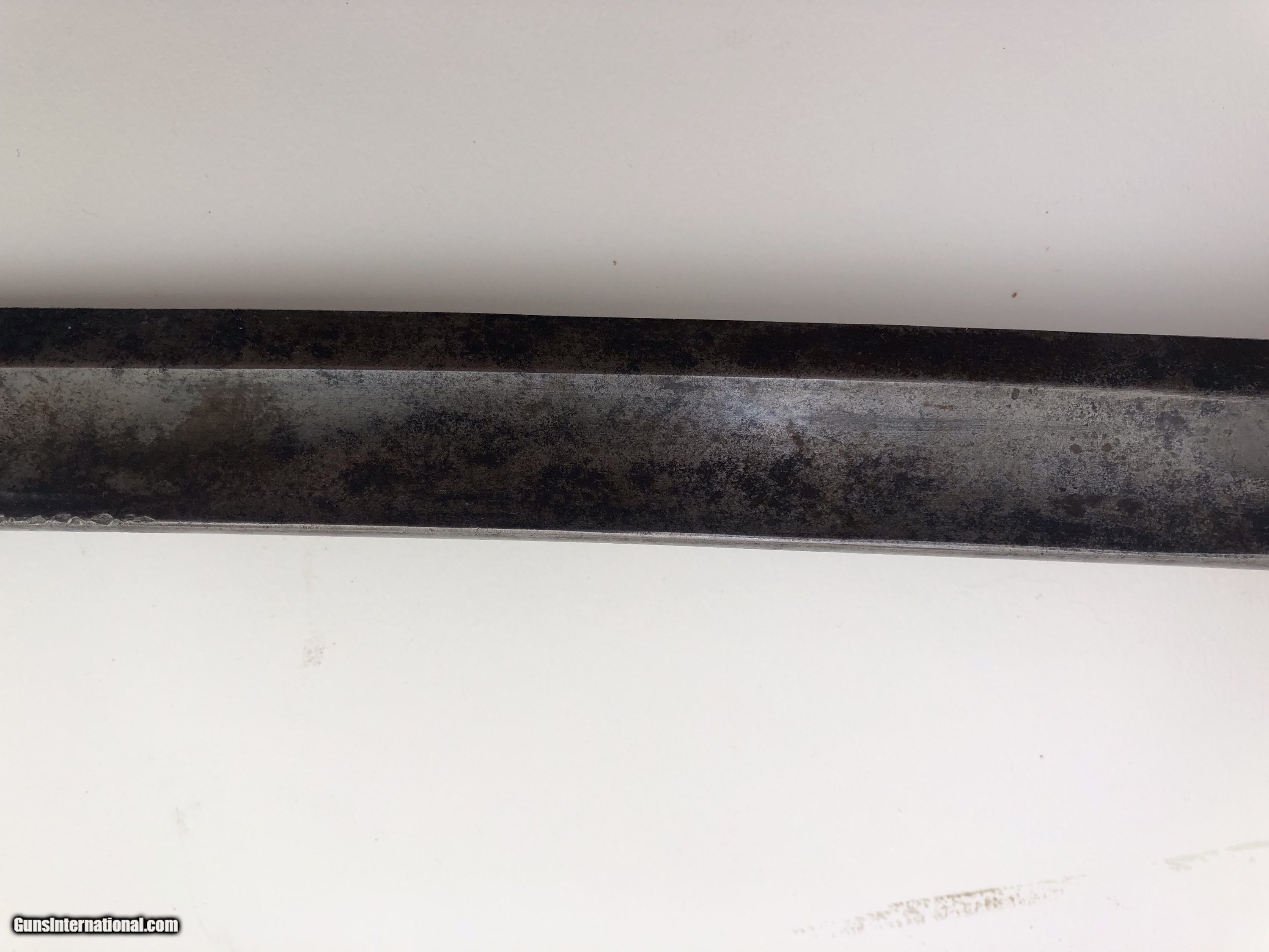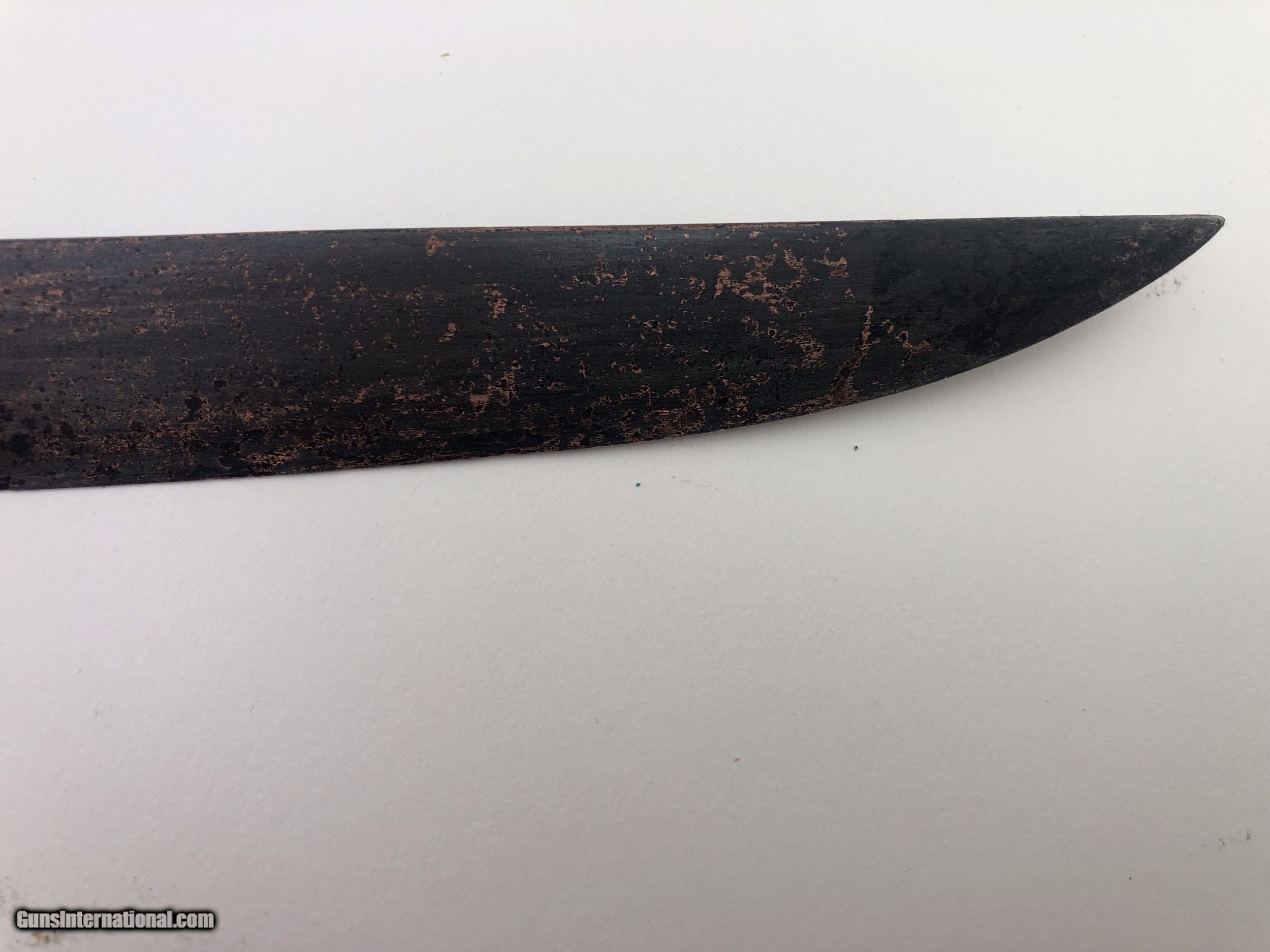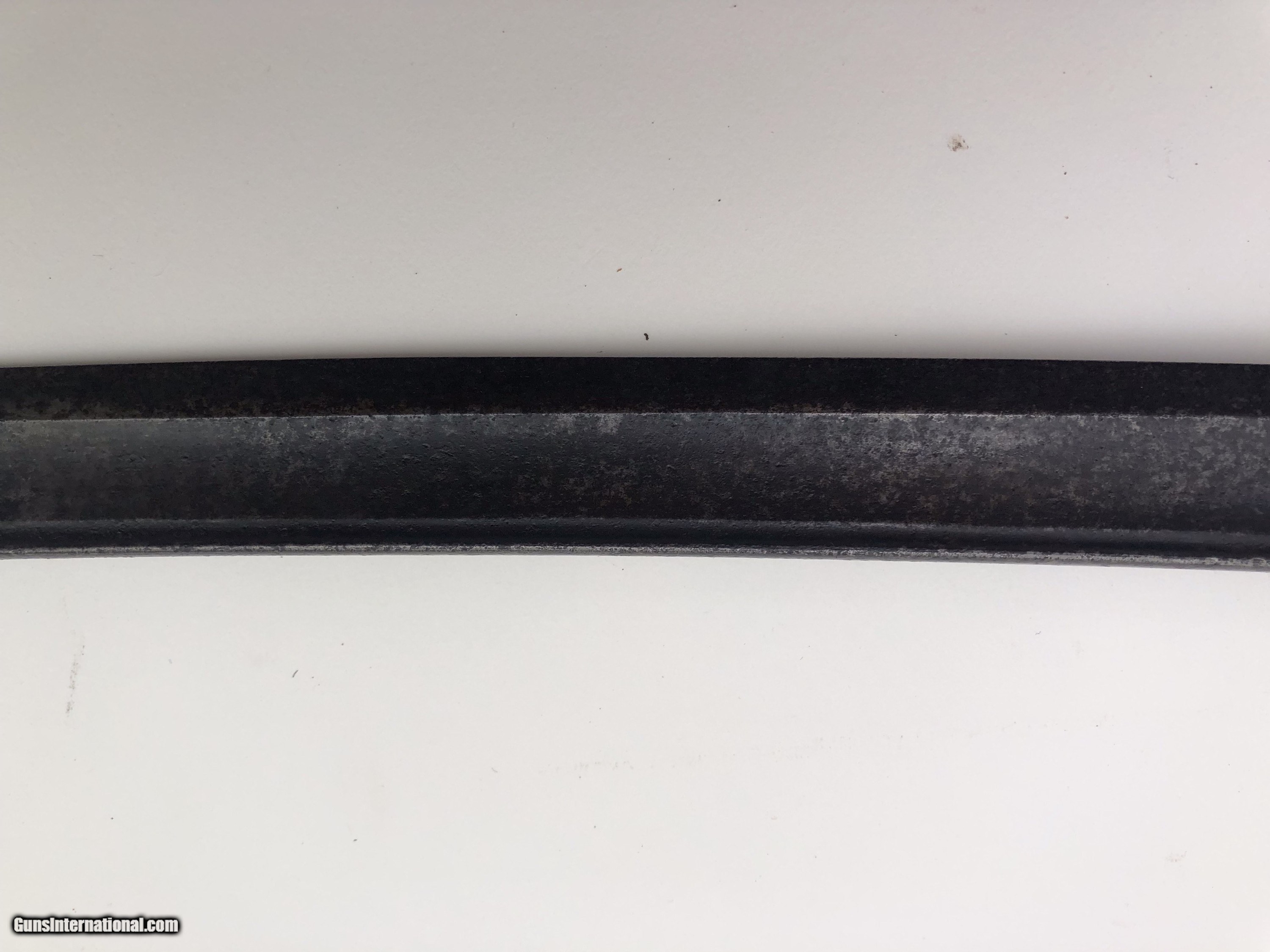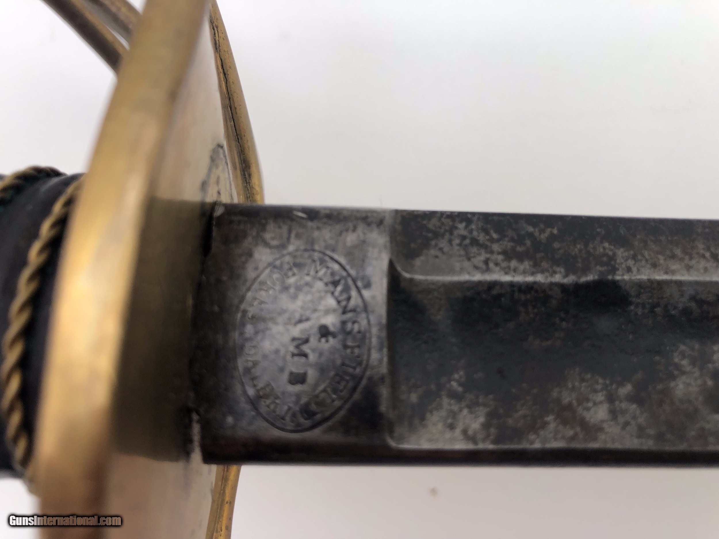 Description: The blade is dated 1862 and government inspected. Condition-- The blade has some rough areas mostly the front 12 inches. The brass hilt and guard are good and the grip has been rewrapped. The scabbard is a good dark age patina with no dents. The scabbard throat is missing. SOLD |