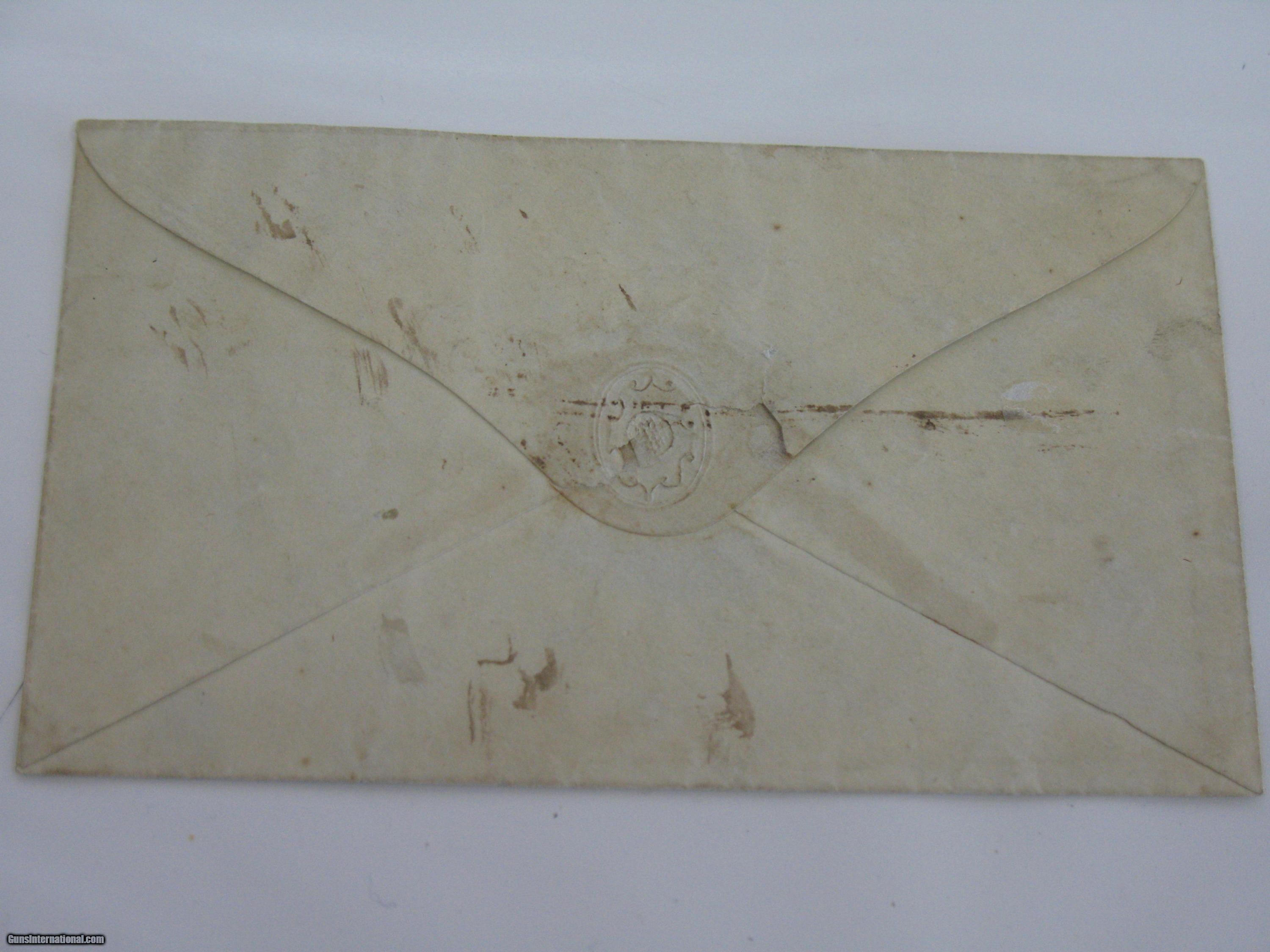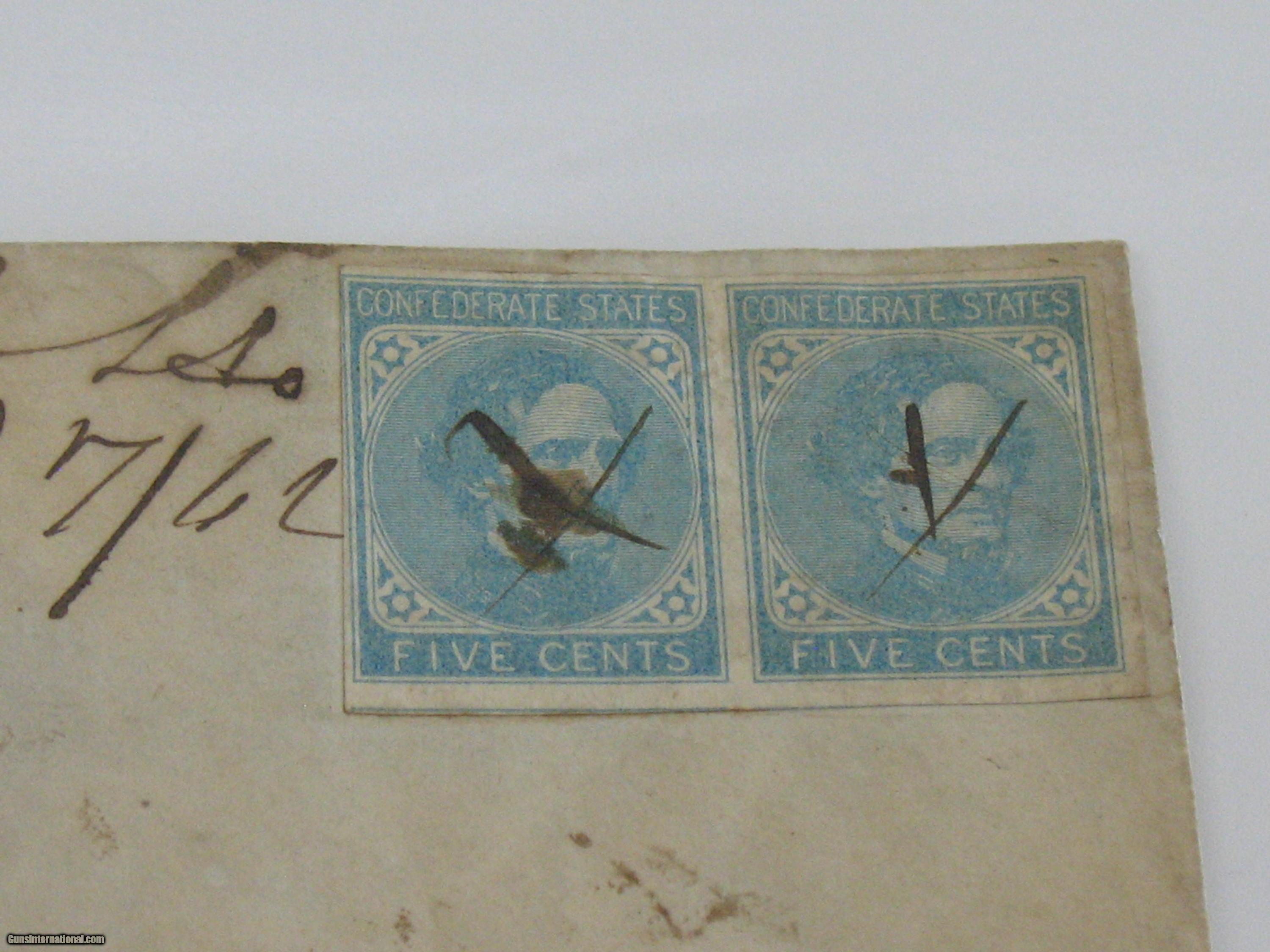 Description: Original mailing envelope addressed to a a "Mrs. J. J. Toler" in Lynchburg, Virginia. Bearing a date of November 27, 1862, it has two 5 cent Jefferson Davis stamps, cancelled by placement of a simple X mark across the President's portrait. Intact with nice detail. Price: $50, including shipping to location in the Continental U.S. SOLD |