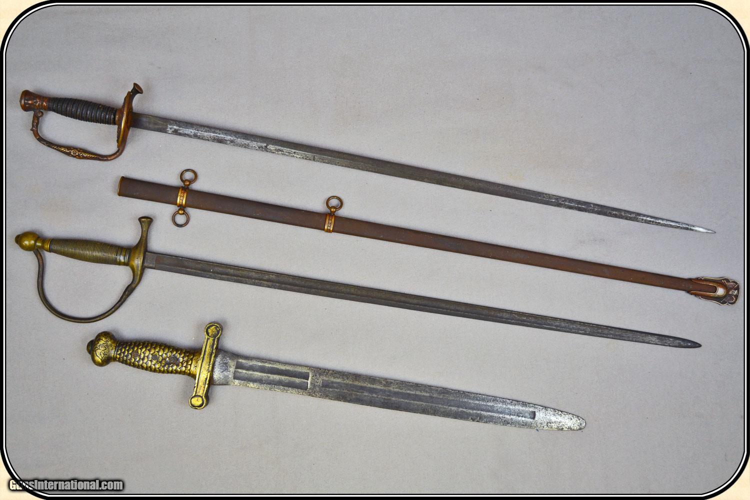 Description: A collection of 3 original interesting Civil War swords for one low price. One US Civil War NCO Sword, one artillery sword, and Field Officers sword. PAYMENT Cash, postal money order, cashiers check, personal & business checks. May order at riverjucntion on-line with credit card. SOLD |