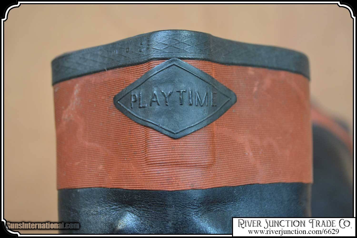 Description: Vintage, Military Style 1900 Childs Black Rubber Boots. Each Boot Measures: 9" Tall x 6 1/2" Long from toe to heal. A wonderful rare old pair of rubber boots from the era when they made big boys boots for the little man!!! In vintage design and construction. They have the red tops like that of colonial era men's leather boots. I can bet that a very young soldier used these boots to march straight through the mud puddles. A rare addition to your Collection of little boys toys. Attractive with the Black Diamond marked (PLAYTIME). The heals and soles show some wear of a well loved possession. Note, the concave Cuban heal shape and stitch marks, a surprising attention to details not often seen. Perhaps the little soldier that wore these saw his Daddy march off to battle. Other items pictured are not included. Price: $195.00 Buy Now Contact Seller |