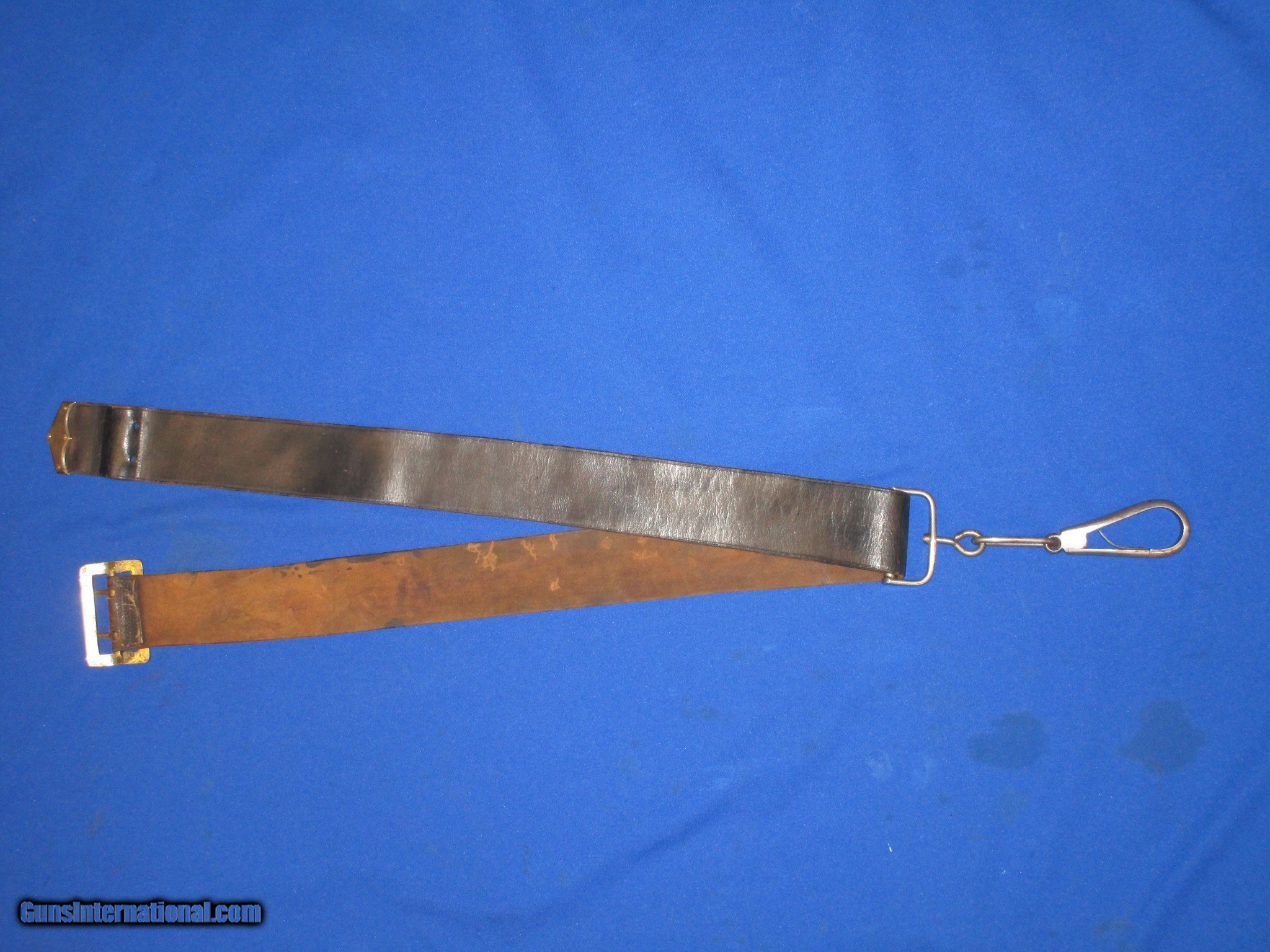 Description: A SCARCE U.S. CIVIL WAR MILITARY ISSUED "E. GAYLORD, CHICOPEE, MASS" MARKED CARBINE SLING & HOOK IN FINE CONDITION. ALL ORIGINAL & COMPLETE. THE SLING HAS FINE LEATHER THROUGHOUT & IS FULL LENGTH. IT MEASURES 55 1/2 INCHES. IT HAS ITS "E. GAYLORD, CHICOPEE, MASS MARKINGS ON IT. THE SLING HAS NICE UNTOUCHED BRASS AT THE ENDS. THE ORIGINAL HOOK IS ALSO FINE & IS "E. GAYLORD" MARKED AS WELL. THIS IS A VERY SCARCE U.S. ISSUED CARBINE SLING TO FIND IN FULL LENGTH & WITH ITS "E. GAYLORD" MARKINGS ON BOTH THE LEATHER & THE HOOK. THIS WOULD BE A GREAT ADDITION TO ANY FINE CIVIL WAR COLLECTION! SOLD |
