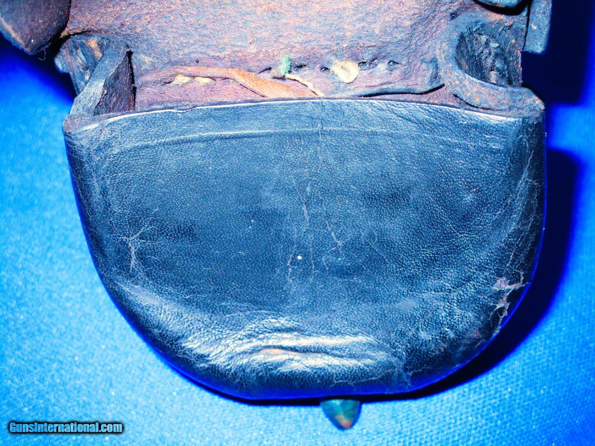 Description: A Very Early & Scarce Civil War Confederate Cap Box With A Pre War "U.S. Rosette" Attached To The Front Flap In Very Good Untouched Condition. All original and complete. It has nice leather throughout that shows use in the war. The early rosette is attached to the flap with its original wires on the inside. This was most likely put on just before or as the war began. The single wide belt loop on the back is sewn on and not inside a slit in the leather. This Very Early Confederate Cap Box Has A Great Untouched Look To It. These Early War Confederate Cap Boxes Are Very Hard To Come By! SOLD |