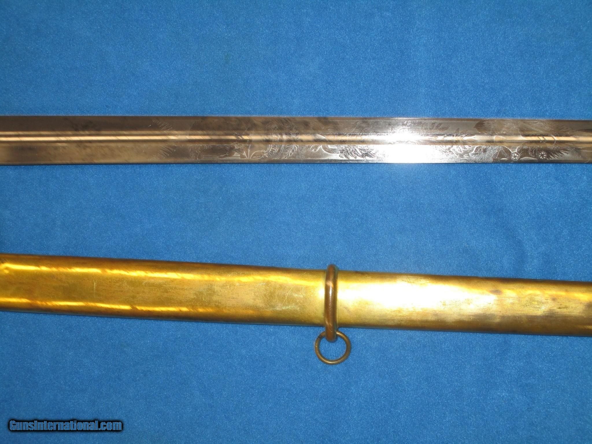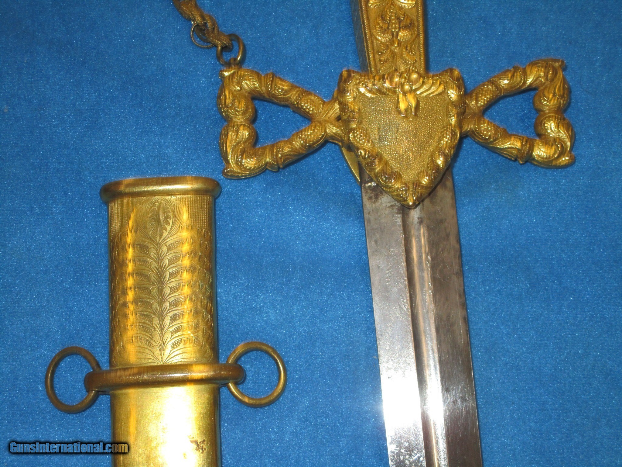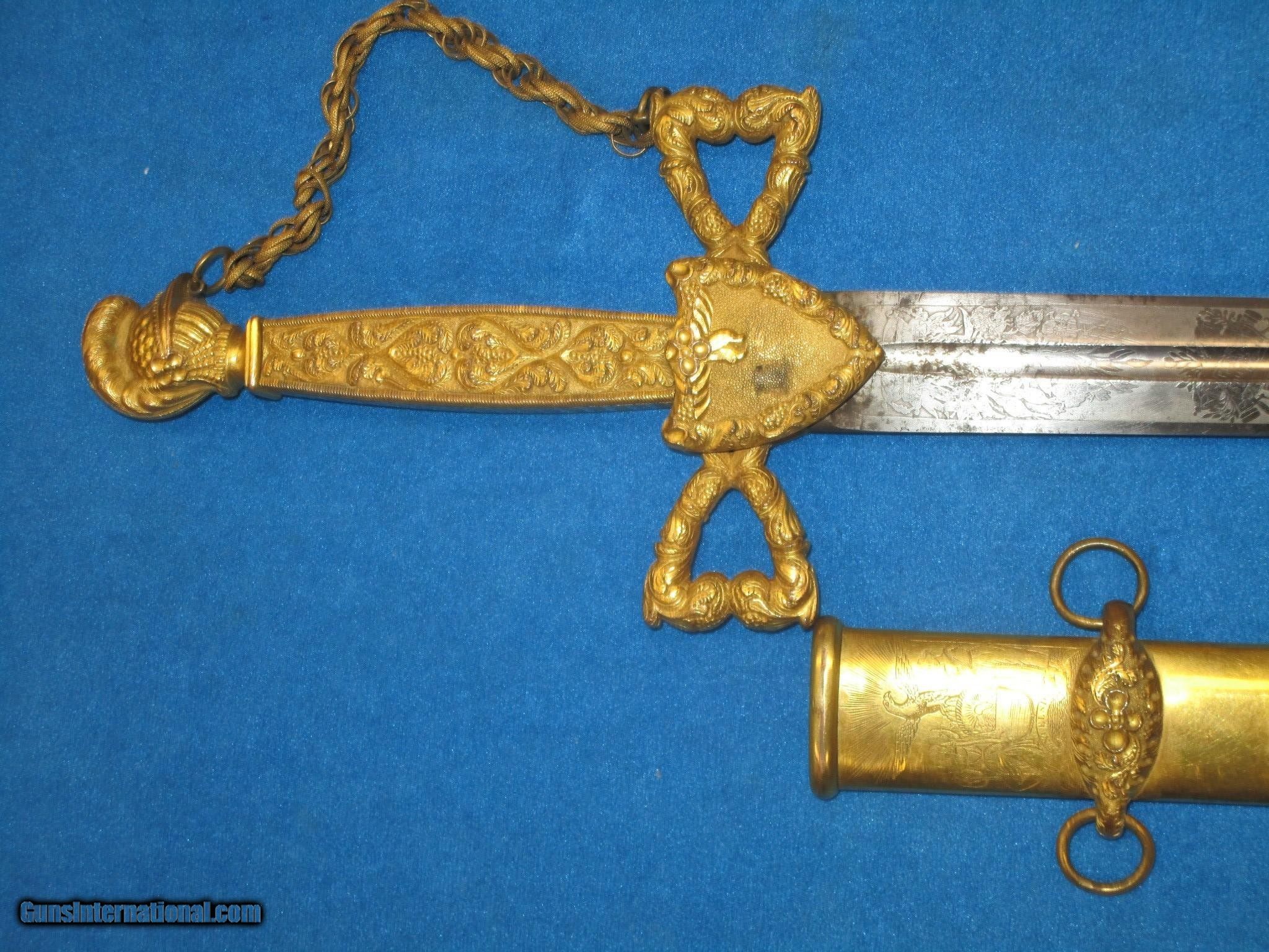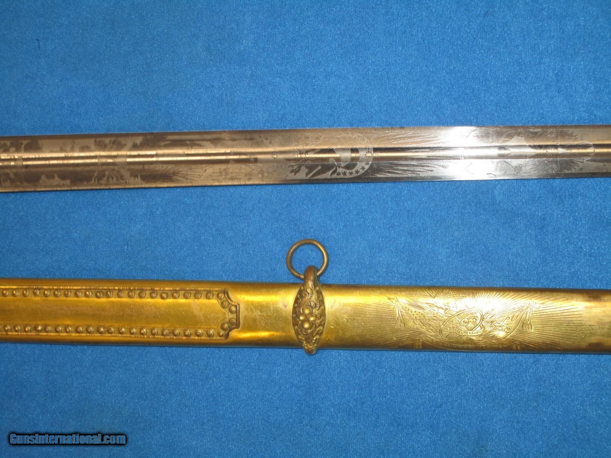 Description: A VERY EARLY & VERY HIGH GRADE AMES MFG. CO. NEW YORK OFFICERS MILITIA SWORD IN EXCELLENT PLUS CONDITION. ALL ORIGINAL THROUGHOUT. IT HAS AN EXCELLENT EARLY BLADE WITH AMES MFG. CO. MARKINGS. IT HAS EXCELLENT U.S. ETCHING & FROSTING THROUGHOUT. THE BLADE HAS "EXCELSIOR" ON IT ALONG WITH ALL THE OTHER U.S. MOTIFS. THE VERY HIGH GRADE GRIP & GUARD ARE HEAVILY CHISELED & FULLY CHASED ON ALL SIDES AS SHOWN. THE HELMET POMMEL IS ALSO VERY HIGH GRADE. THE ENTIRE GRIP & GUARD BOTH RETAINS MOST OF THEIR ORIGINAL GOLD GILT ON THEM. THE HIGH GRADE BRASS SCABBARD HAS THE NEW YORK STATE SEAL ENGRAVED AT THE TOP AS SHOWN AS WELL AS MANY OTHER U.S. MOTIFS INCLUDING FLAGS, STARS, & SHIELDS WITH "NATIONAL GUARD" INSIDE A LARGE ONE IN THE CENTER OF THE SCABBARD. THE SCABBARD ALSO RETAINS MOST OF ITS ORIGINAL GOLD GILT. THIS IS A VERY SCARCE & VERY HIGH GRADE EXAMPLE OF AN EARLY NEW YORK OFFICERS SWORD THAT COULD DEFINITELY BE THE CENTER OF ANY FINE COLLECTION. THESE SWORDS ARE VERY DIFFICULT TO FIND ESPECIALLY IN THIS CONDITION! SOLD |