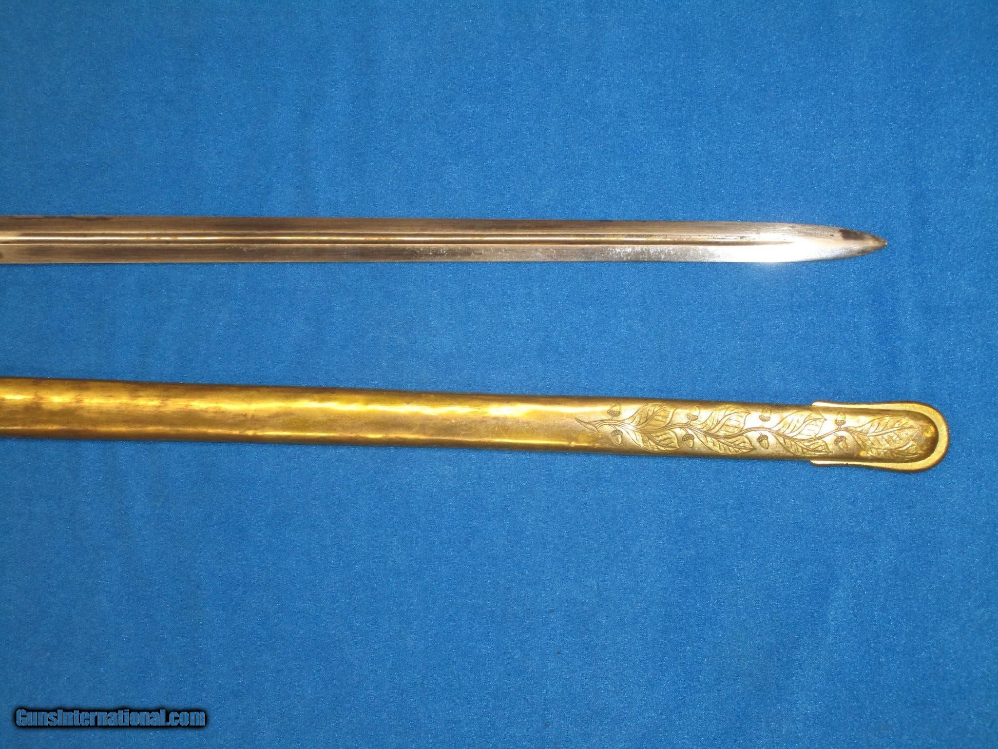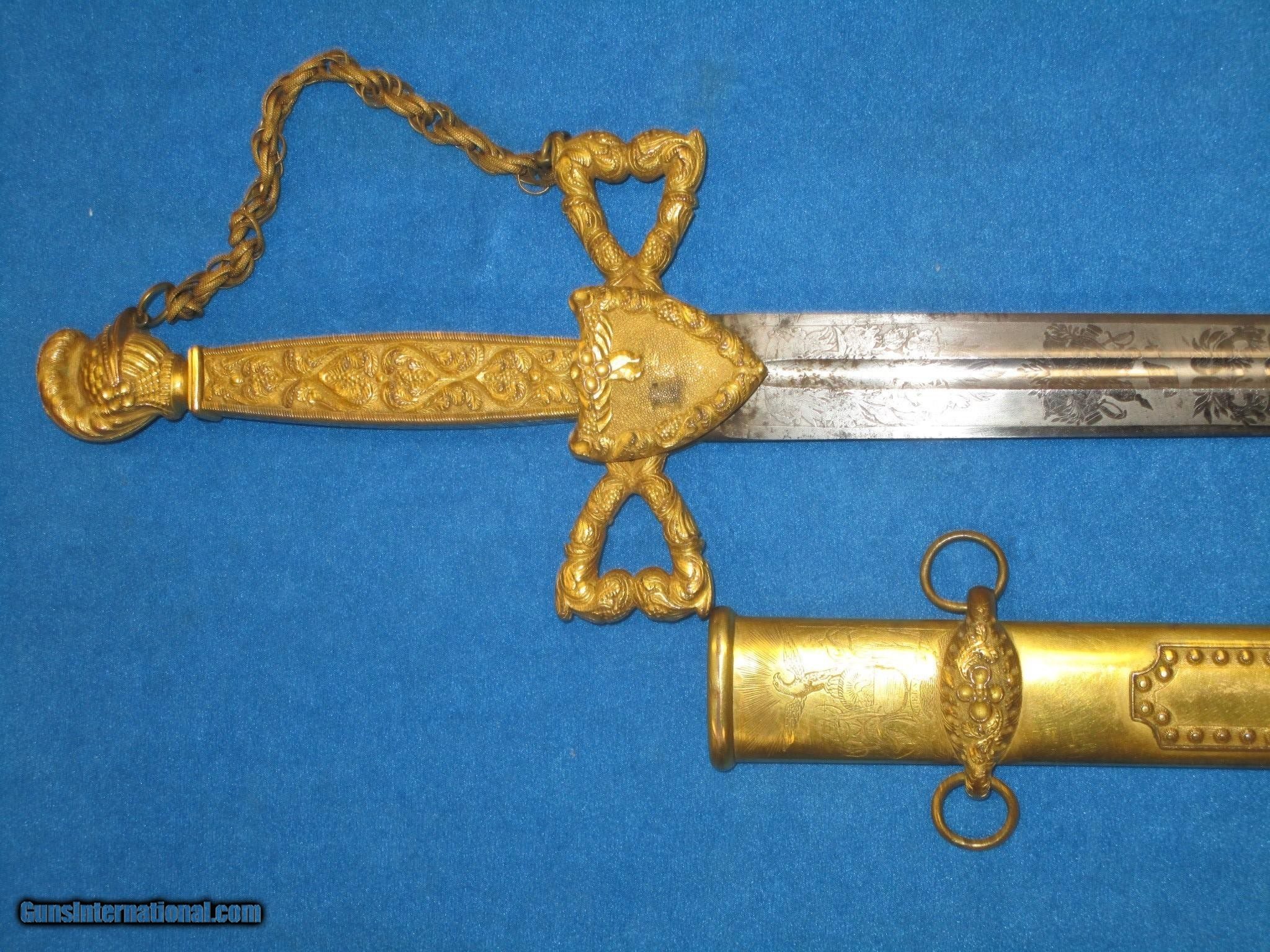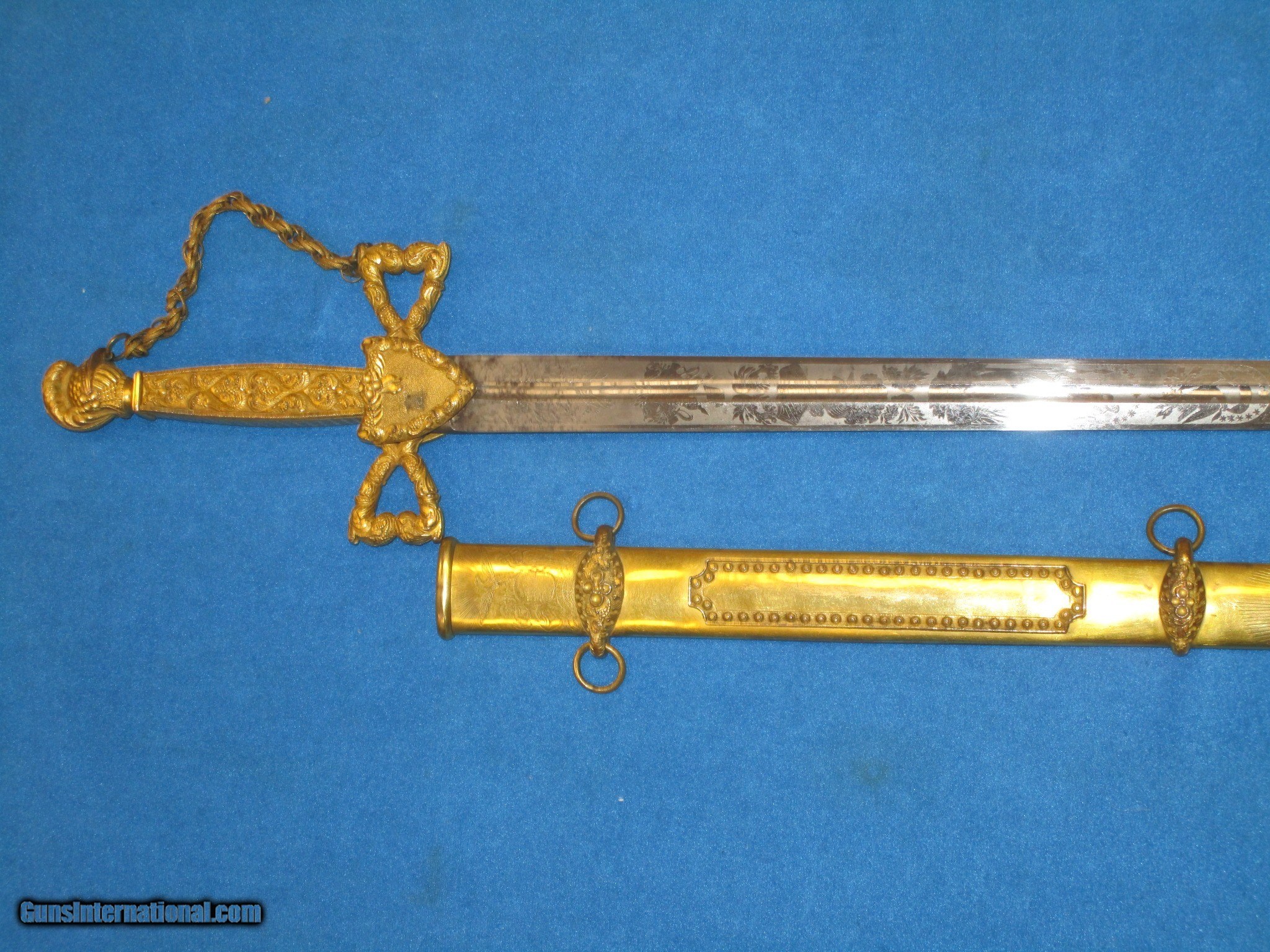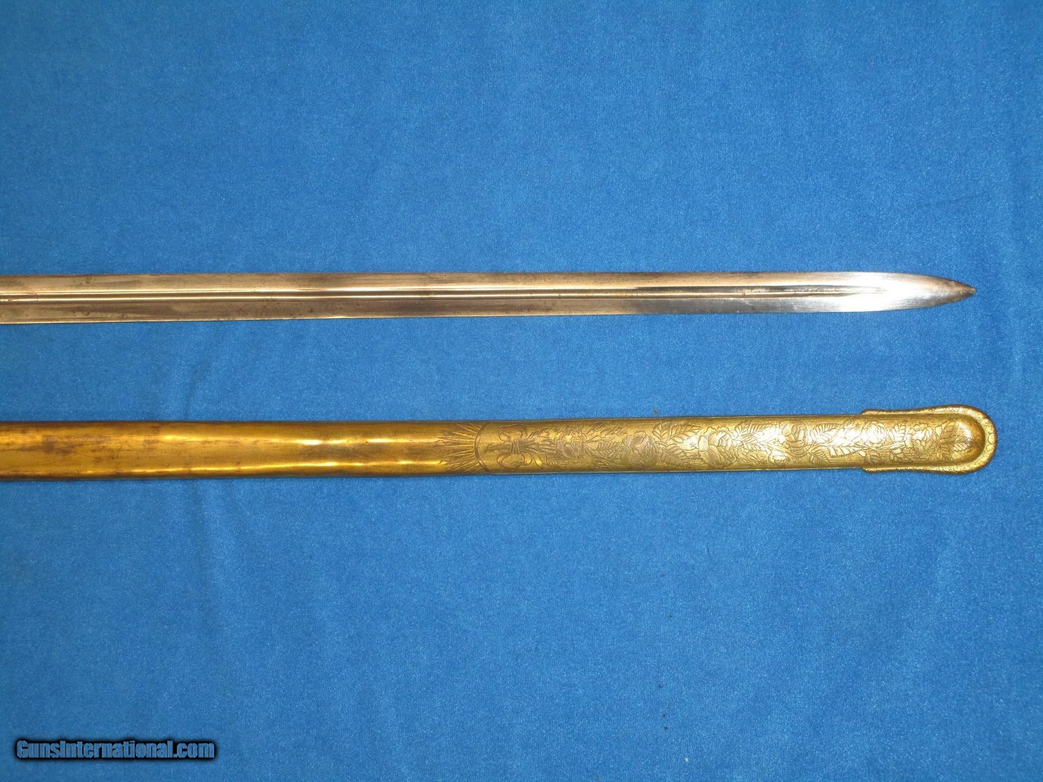 Description: A VERY EARLY & VERY HIGH GRADE AMES MFG. CO. NEW YORK OFFICERS MILITIA SWORD IN EXCELLENT PLUS CONDITION. ALL ORIGINAL THROUGHOUT. IT HAS AN EXCELLENT EARLY BLADE WITH AMES MFG. CO. MARKINGS. IT HAS EXCELLENT U.S. ETCHING & FROSTING THROUGHOUT. THE BLADE HAS "EXCELSIOR" ON IT ALONG WITH ALL THE OTHER U.S. MOTIFS. THE VERY HIGH GRADE GRIP & GUARD ARE HEAVILY CHISELED & FULLY CHASED ON ALL SIDES AS SHOWN. THE HELMET POMMEL IS ALSO VERY HIGH GRADE. THE ENTIRE GRIP & GUARD BOTH RETAINS MOST OF THEIR ORIGINAL GOLD GILT ON THEM. THE HIGH GRADE BRASS SCABBARD HAS THE NEW YORK STATE SEAL ENGRAVED AT THE TOP AS SHOWN AS WELL AS MANY OTHER U.S. MOTIFS INCLUDING FLAGS, STARS, & SHIELDS WITH "NATIONAL GUARD" INSIDE A LARGE ONE IN THE CENTER OF THE SCABBARD. THE SCABBARD ALSO RETAINS MOST OF ITS ORIGINAL GOLD GILT. THIS IS A VERY SCARCE & VERY HIGH GRADE EXAMPLE OF AN EARLY NEW YORK OFFICERS SWORD THAT COULD DEFINITELY BE THE CENTER OF ANY FINE COLLECTION. THESE SWORDS ARE VERY DIFFICULT TO FIND ESPECIALLY IN THIS CONDITION! SOLD |